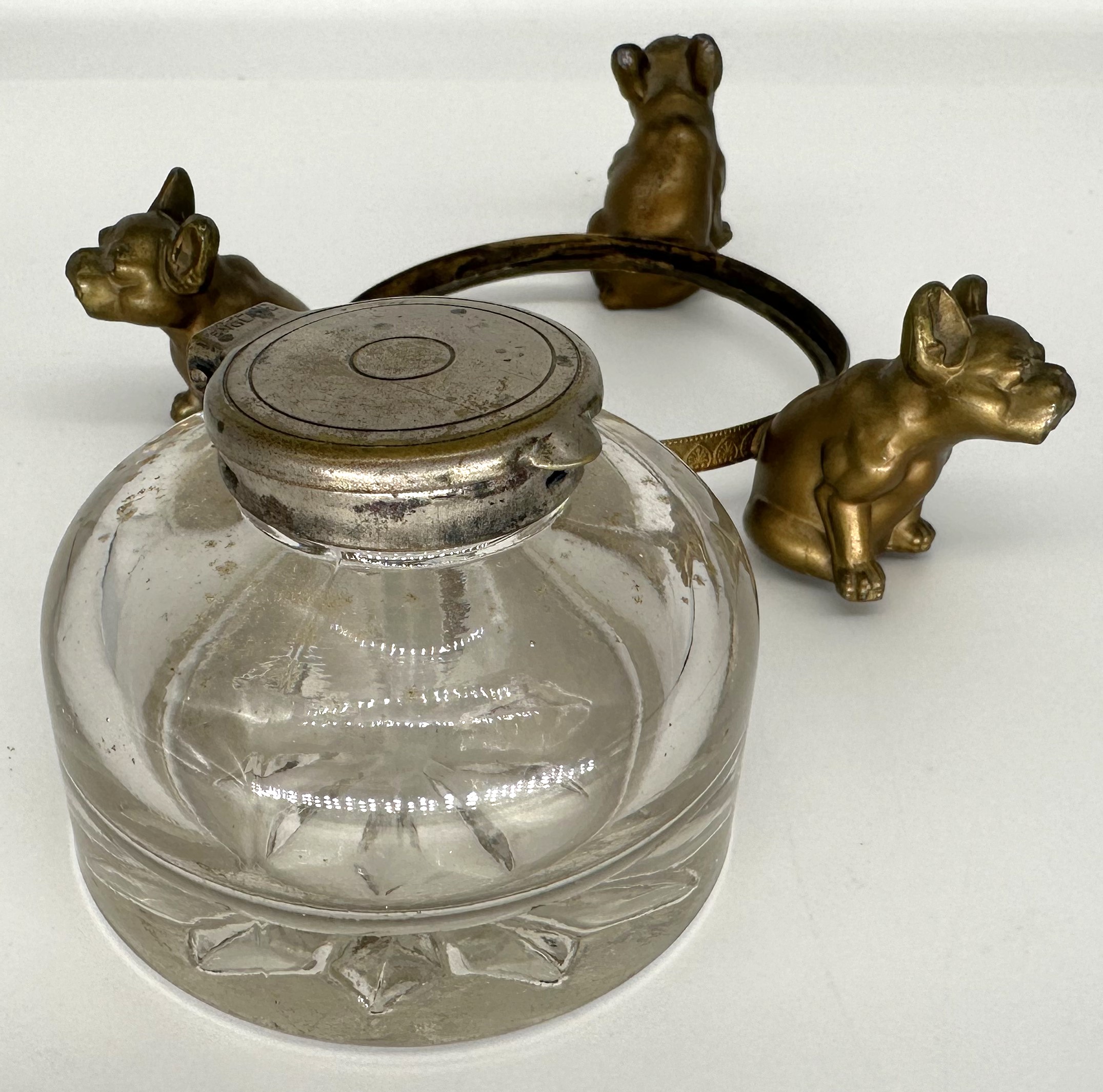 Three brass / bronze terriers guarding a round glass inkwell.