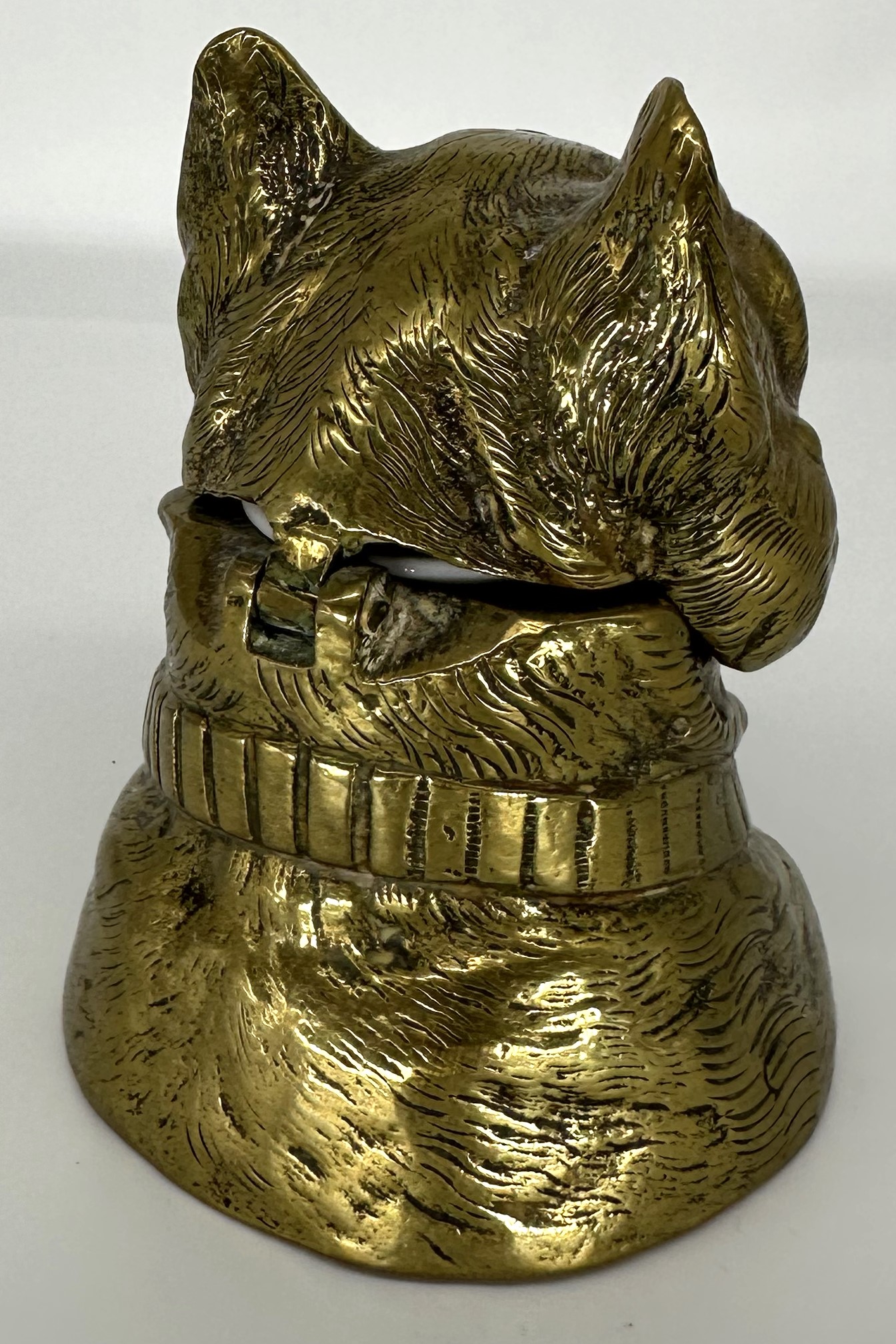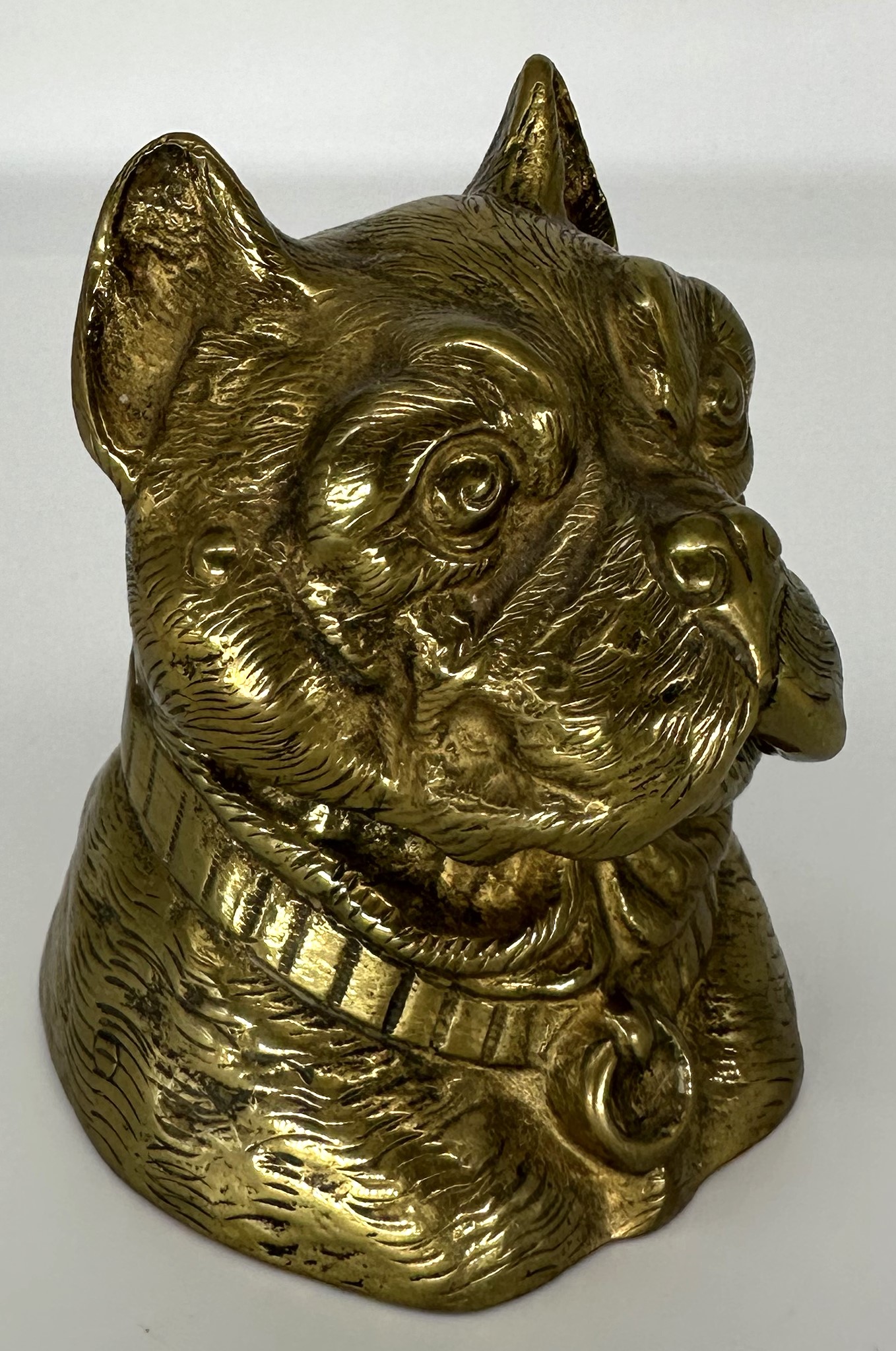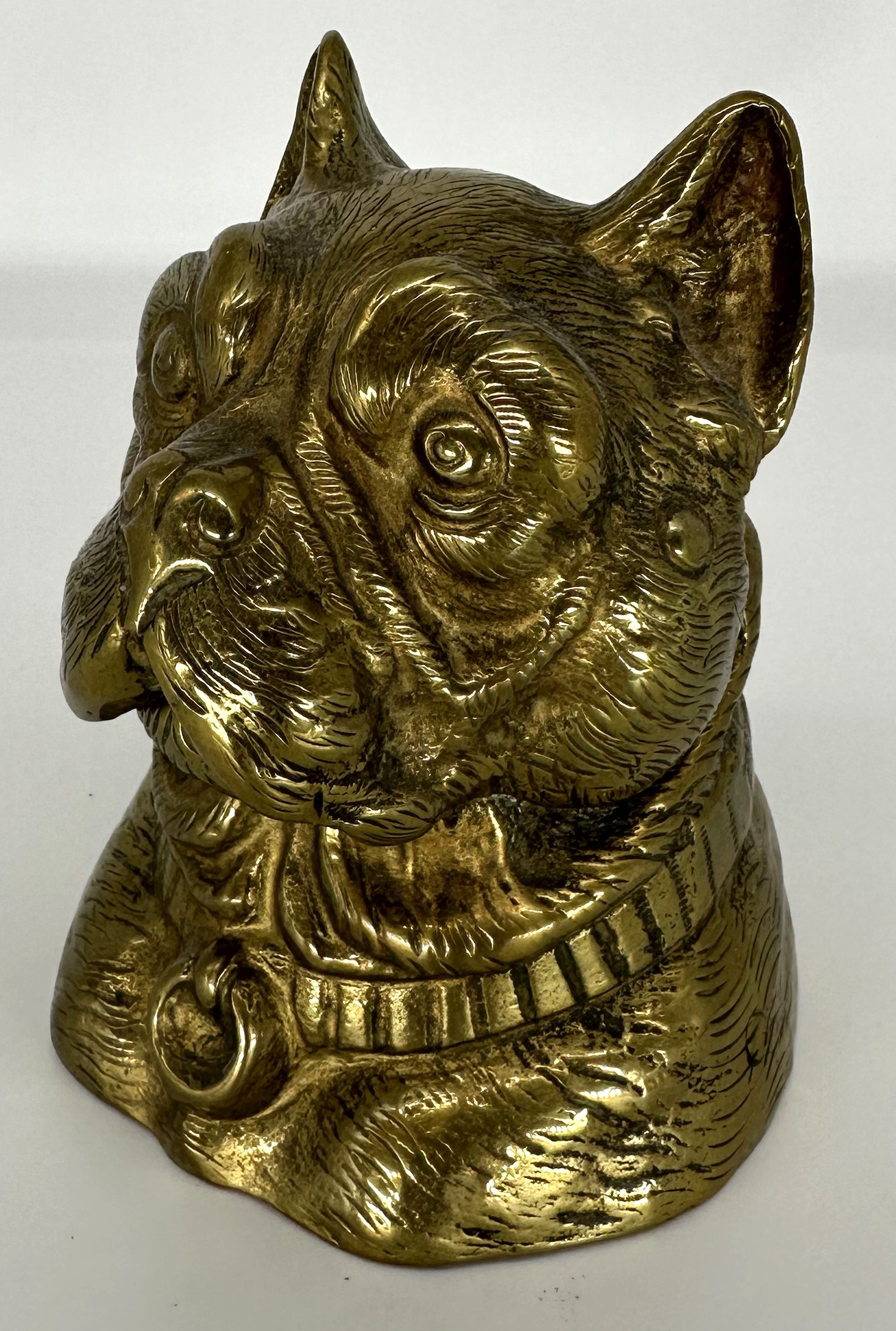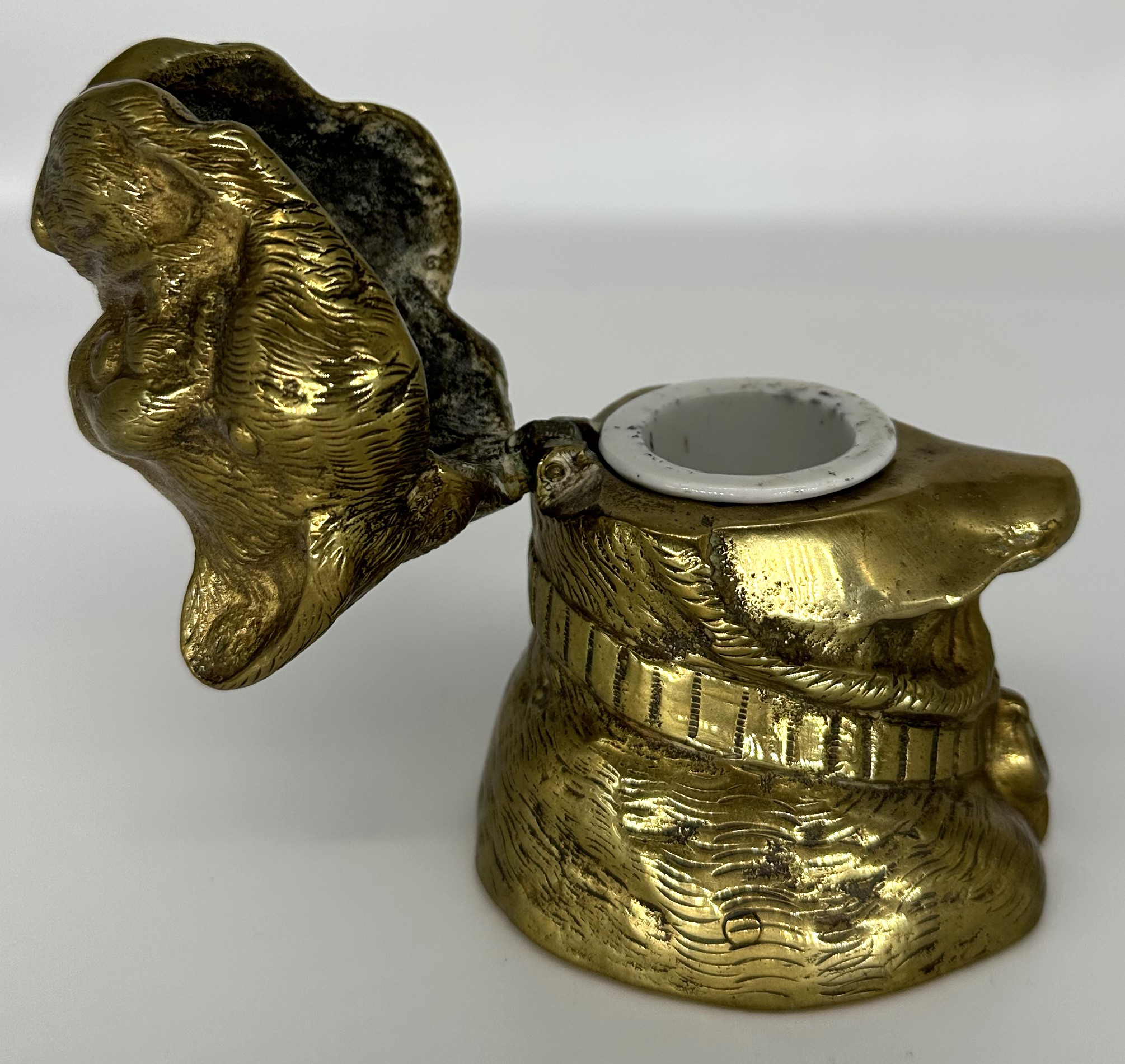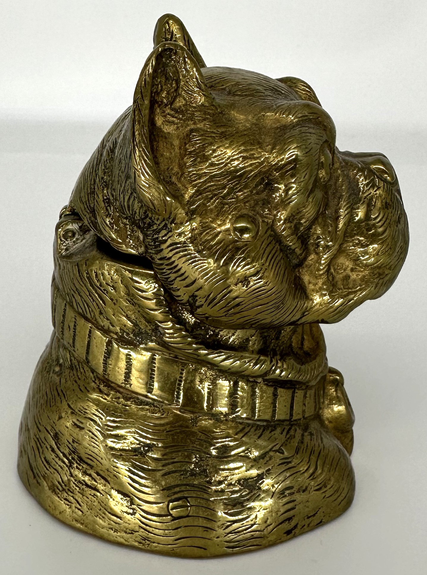 Cast in the form of a dog’s head, this brass inkwell resembles a boxer. The lead base adds substantial heft and stability. Well-made piece with great detailing.