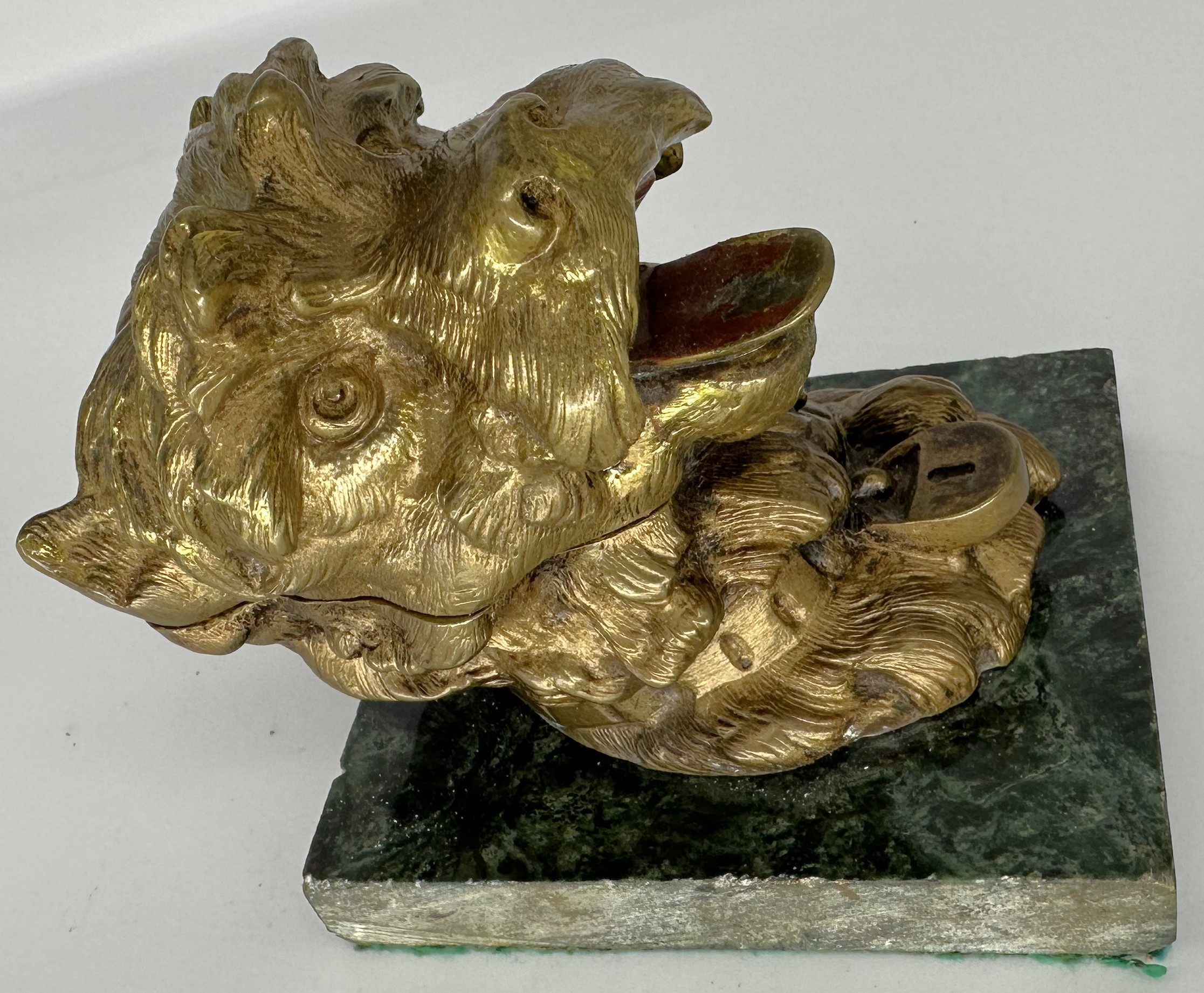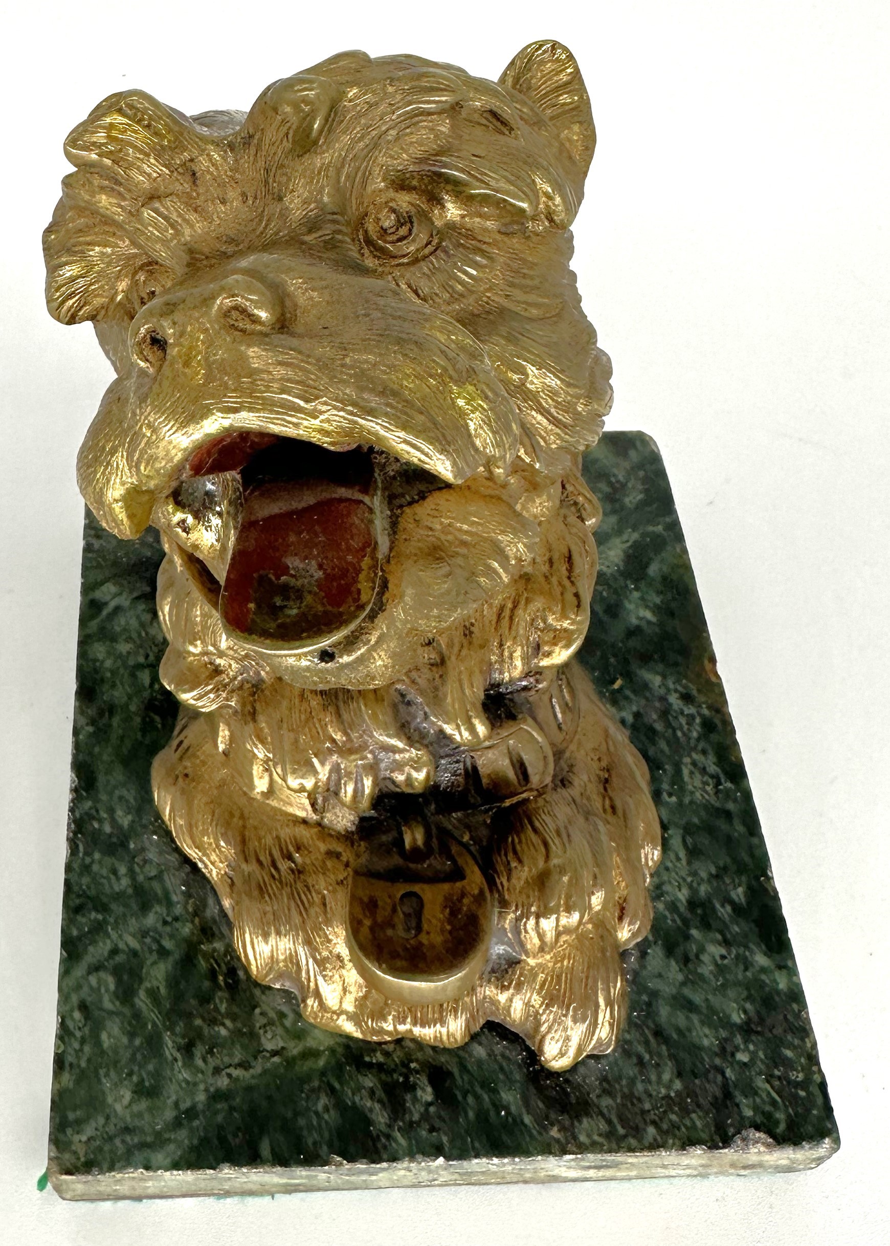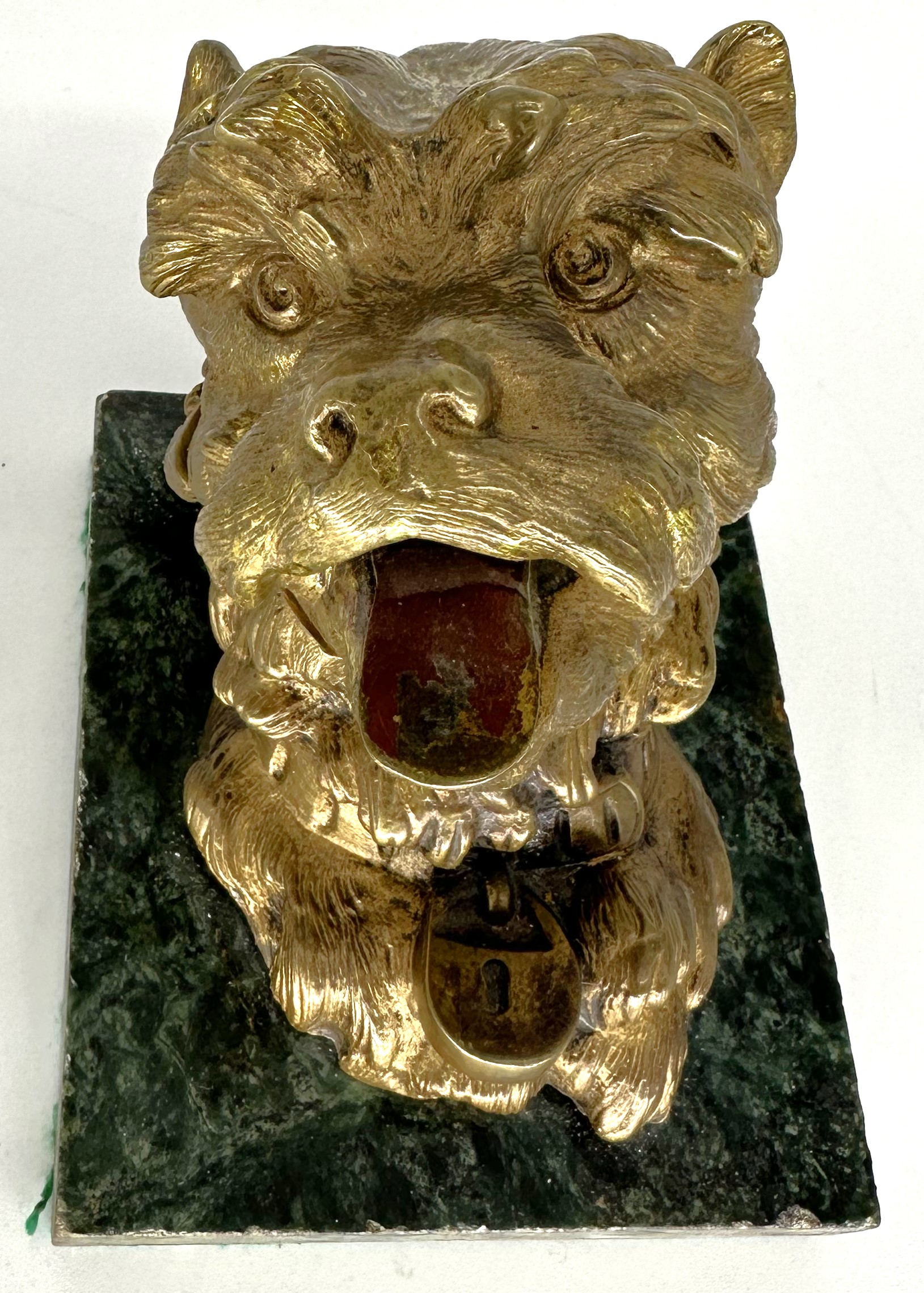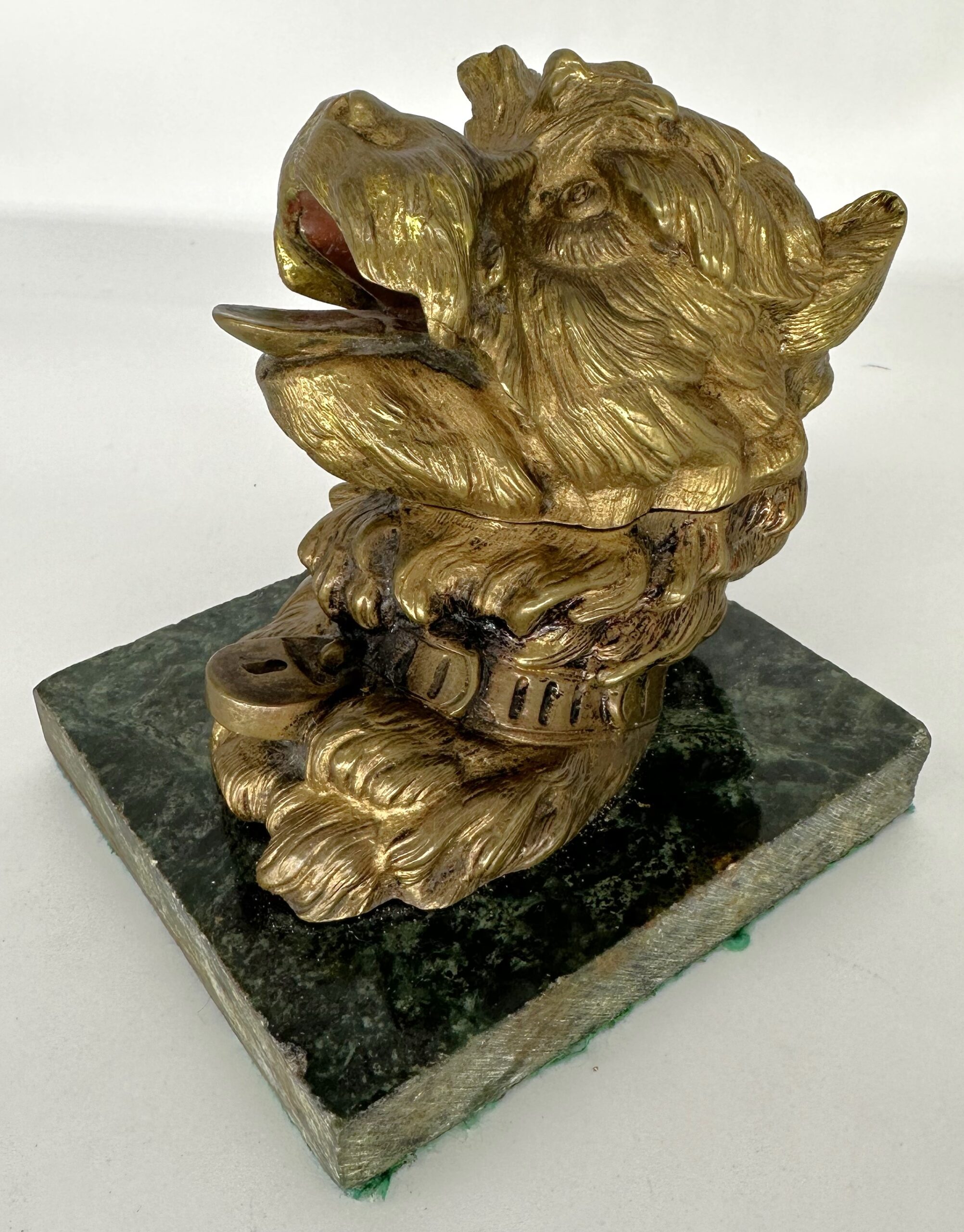 Fixed to a marble base, the bust of an excited terrier dog holds the inkwell. Detailed brass casting, with wide eyes, scruffy coat, mouth open, tongue showing (would have been used for a pen rest), collar with a lock.