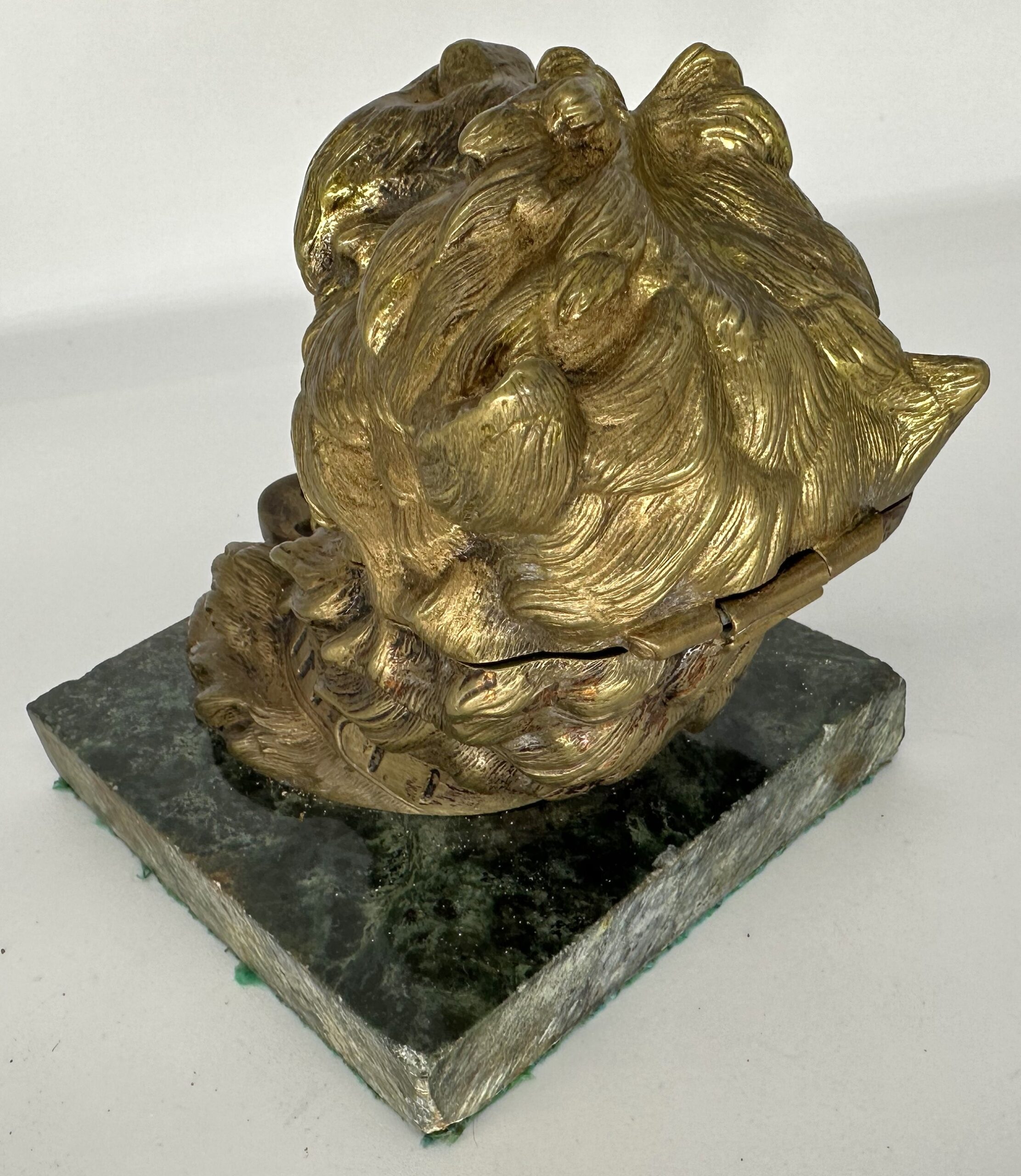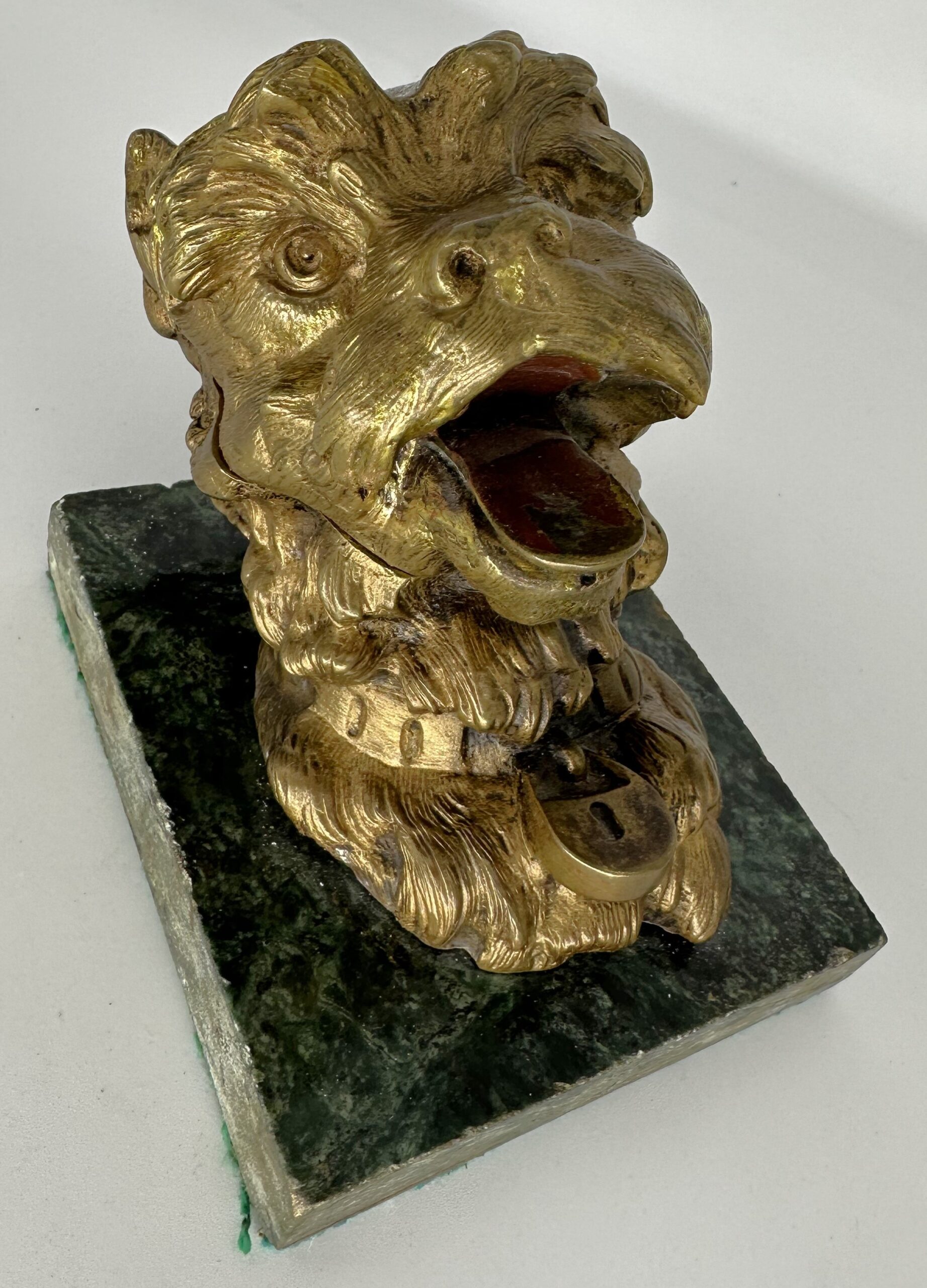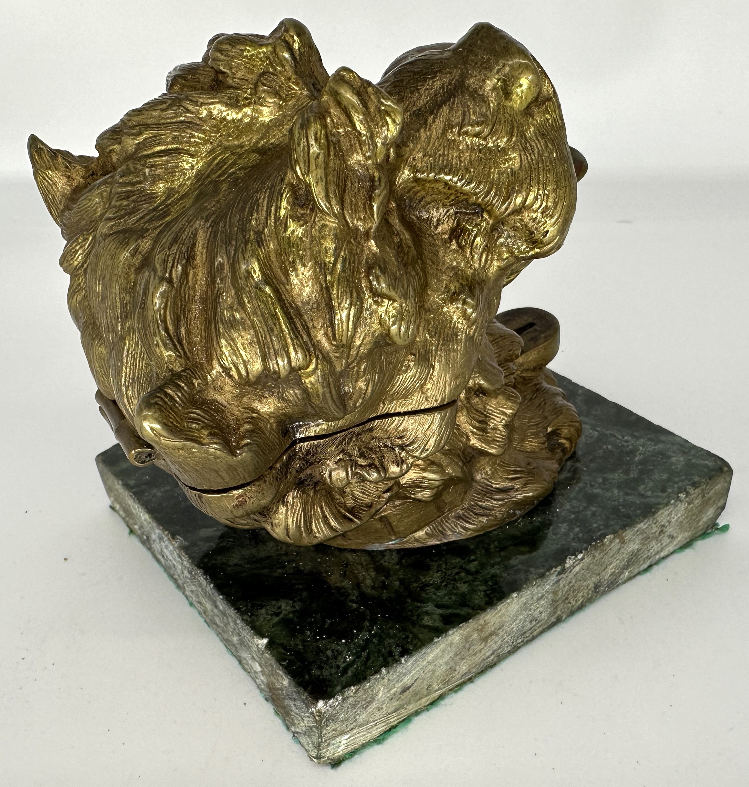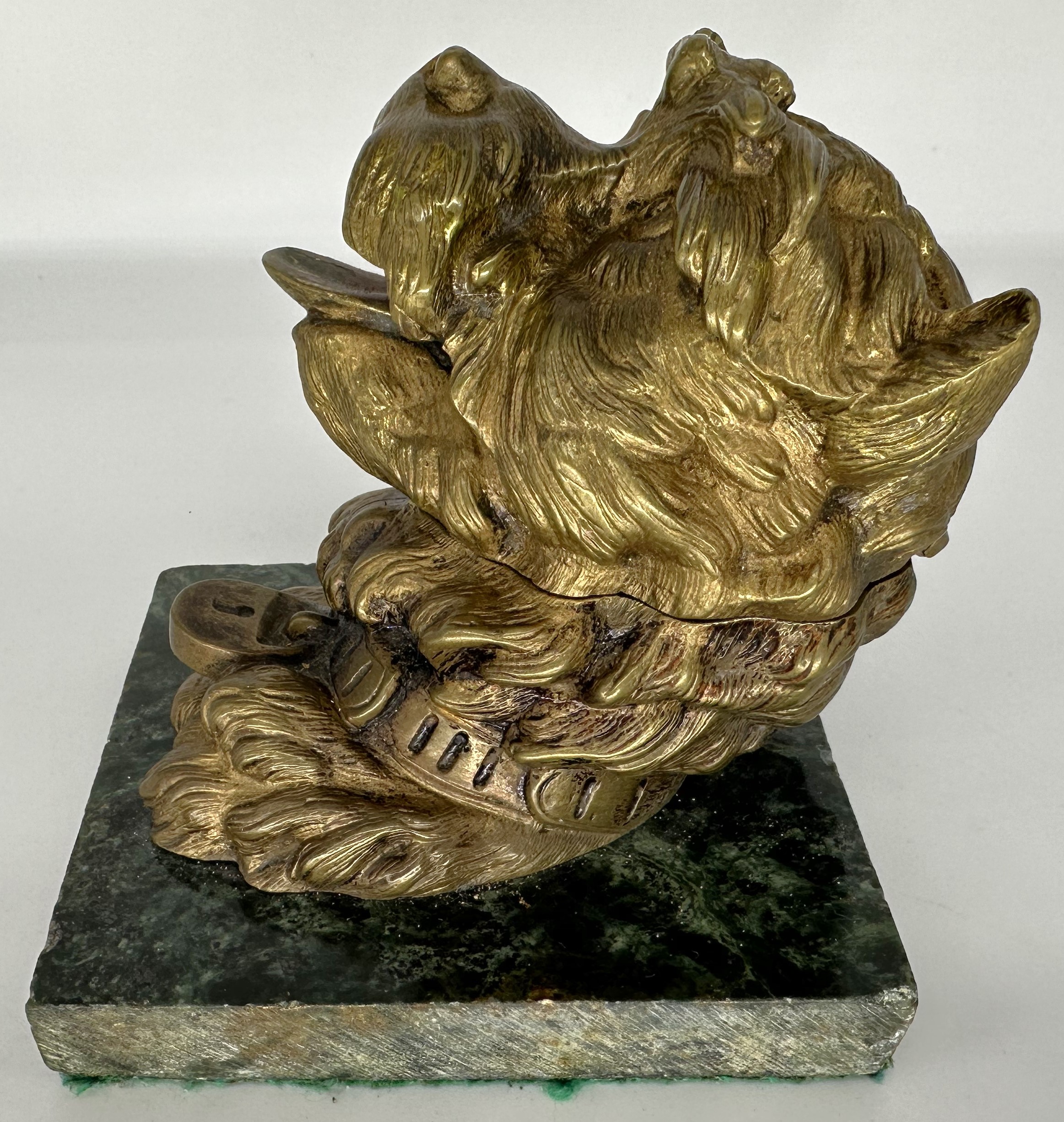 Fixed to a marble base, the bust of an excited terrier dog holds the inkwell. Detailed brass casting, with wide eyes, scruffy coat, mouth open, tongue showing (would have been used for a pen rest), collar with a lock.