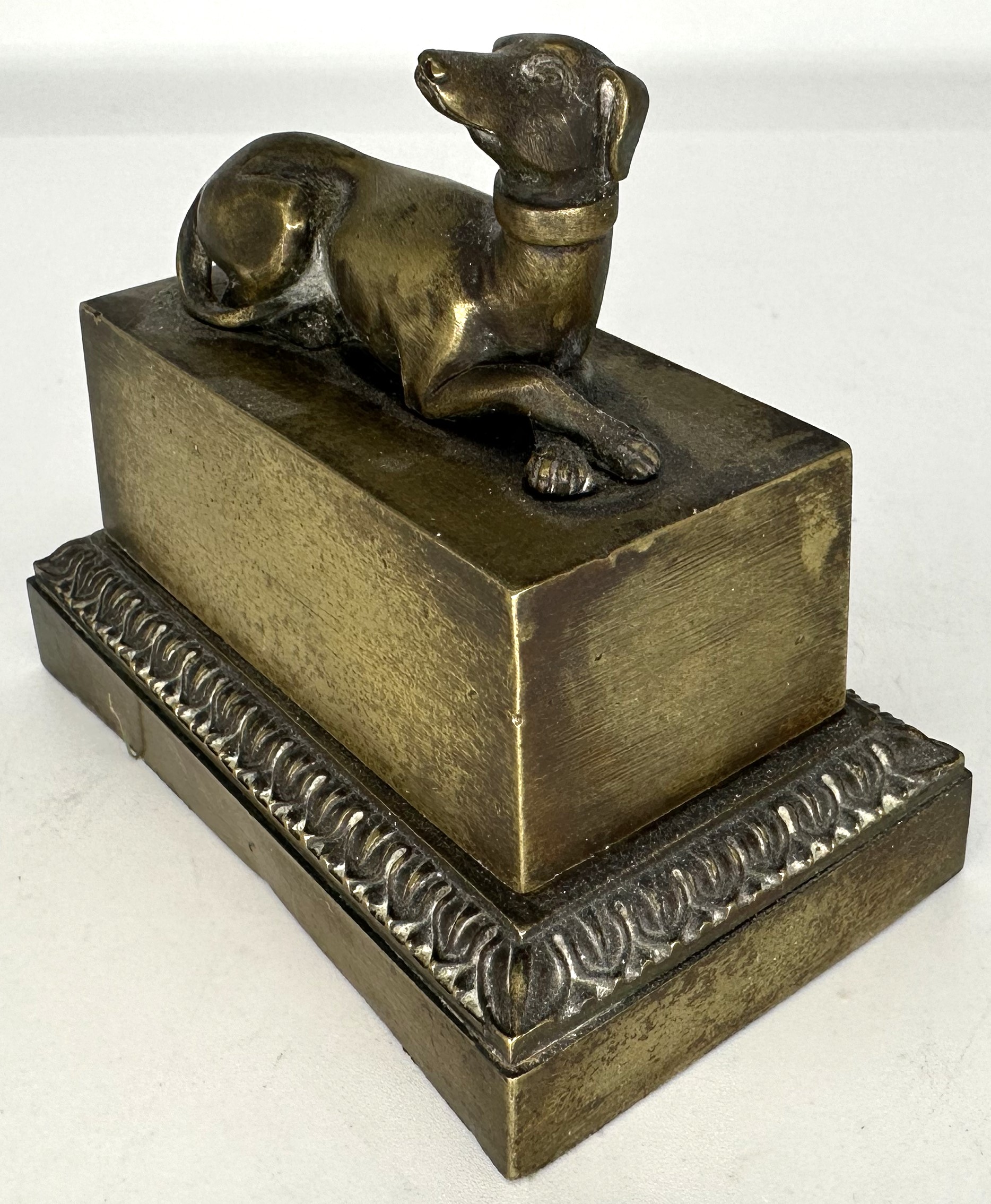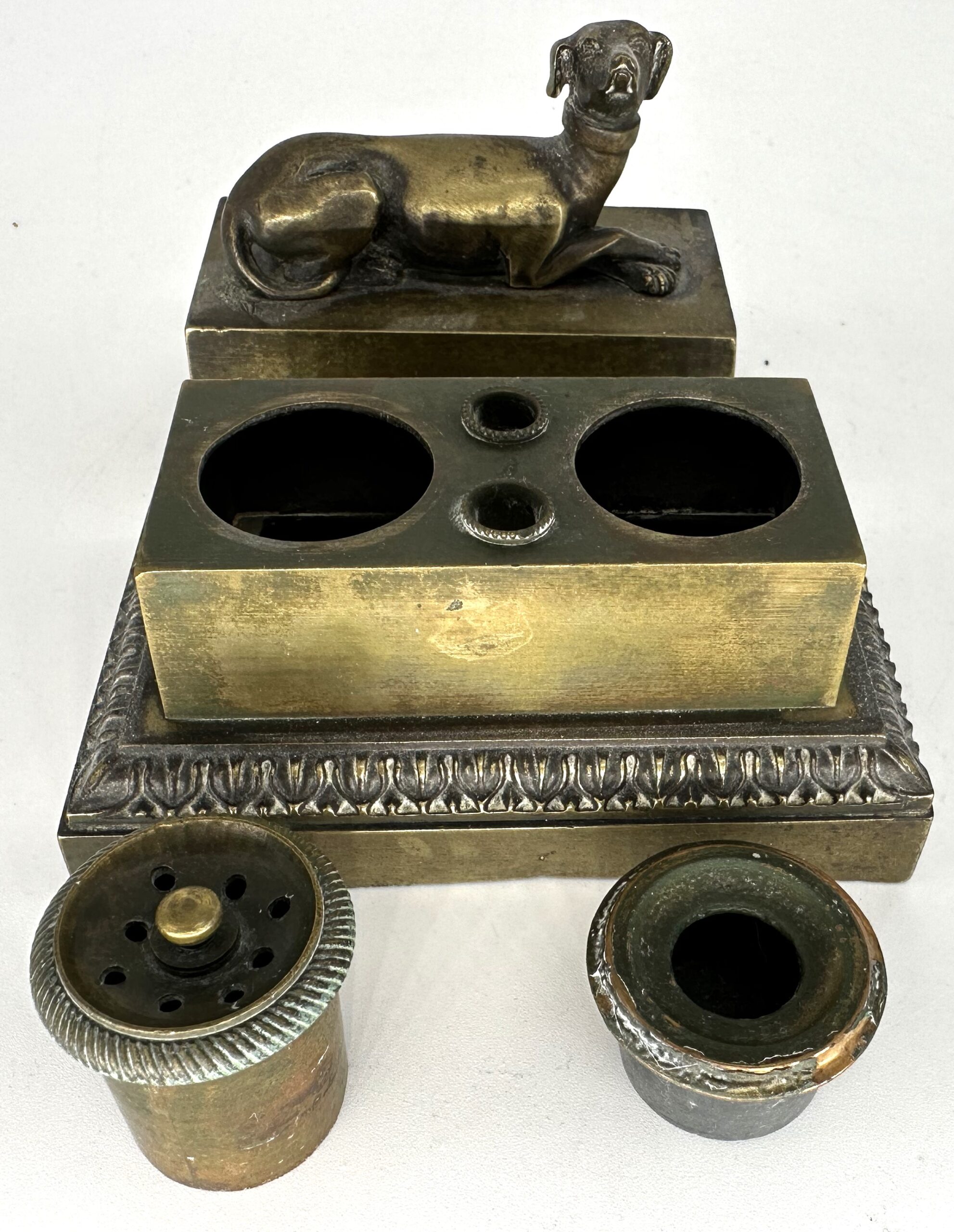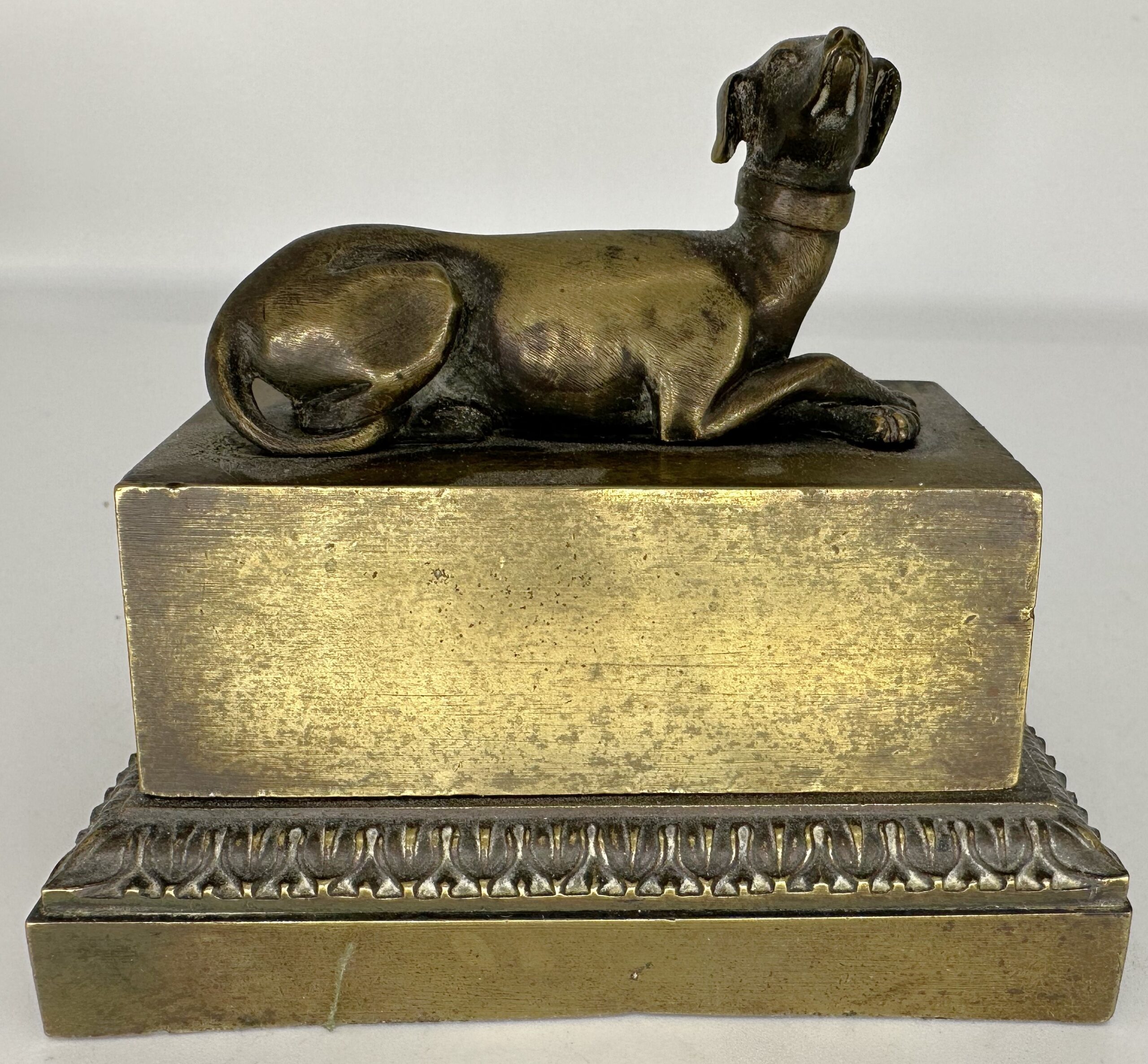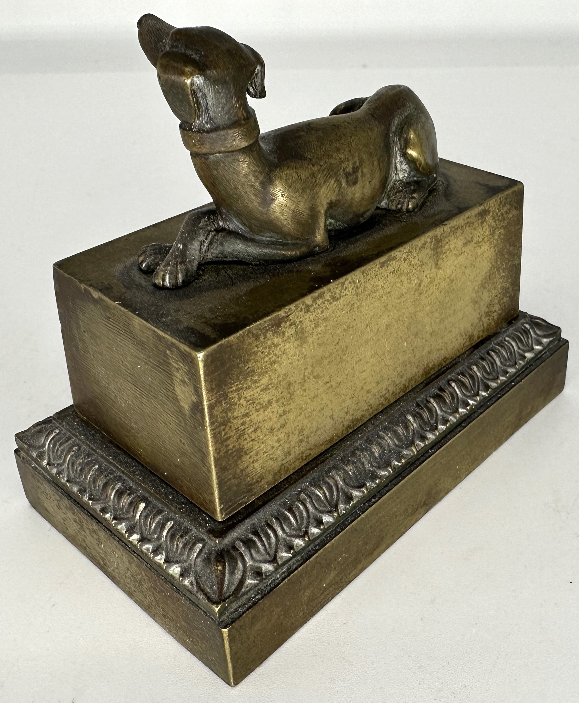 19th Century inkstand featuring a recumbent bronze greyhound resting on a plinth. Lift the top to access an inkwell, sander, and two pen holes.