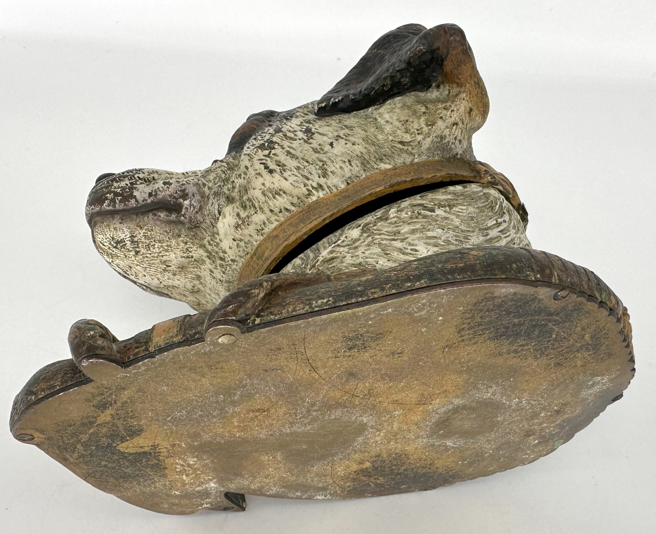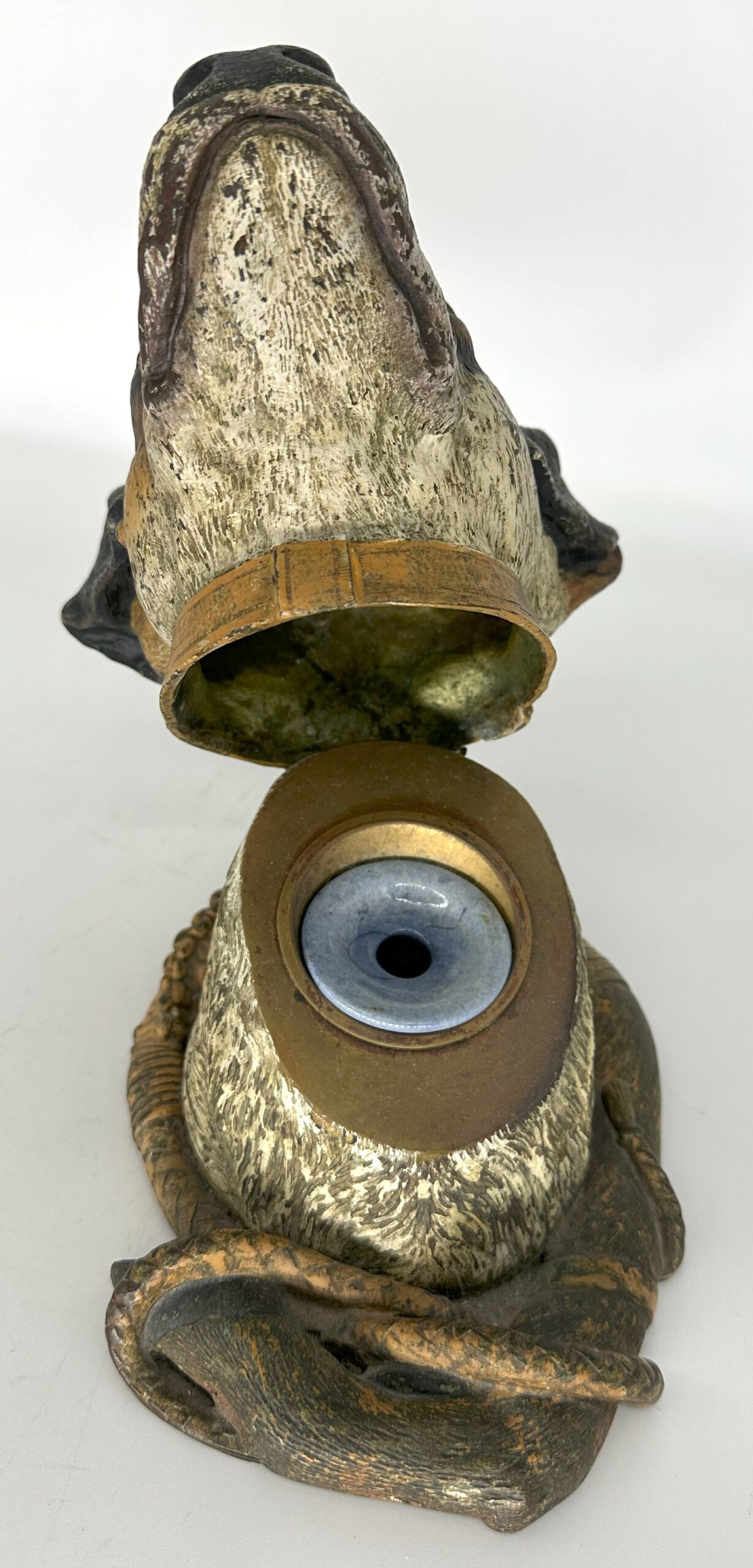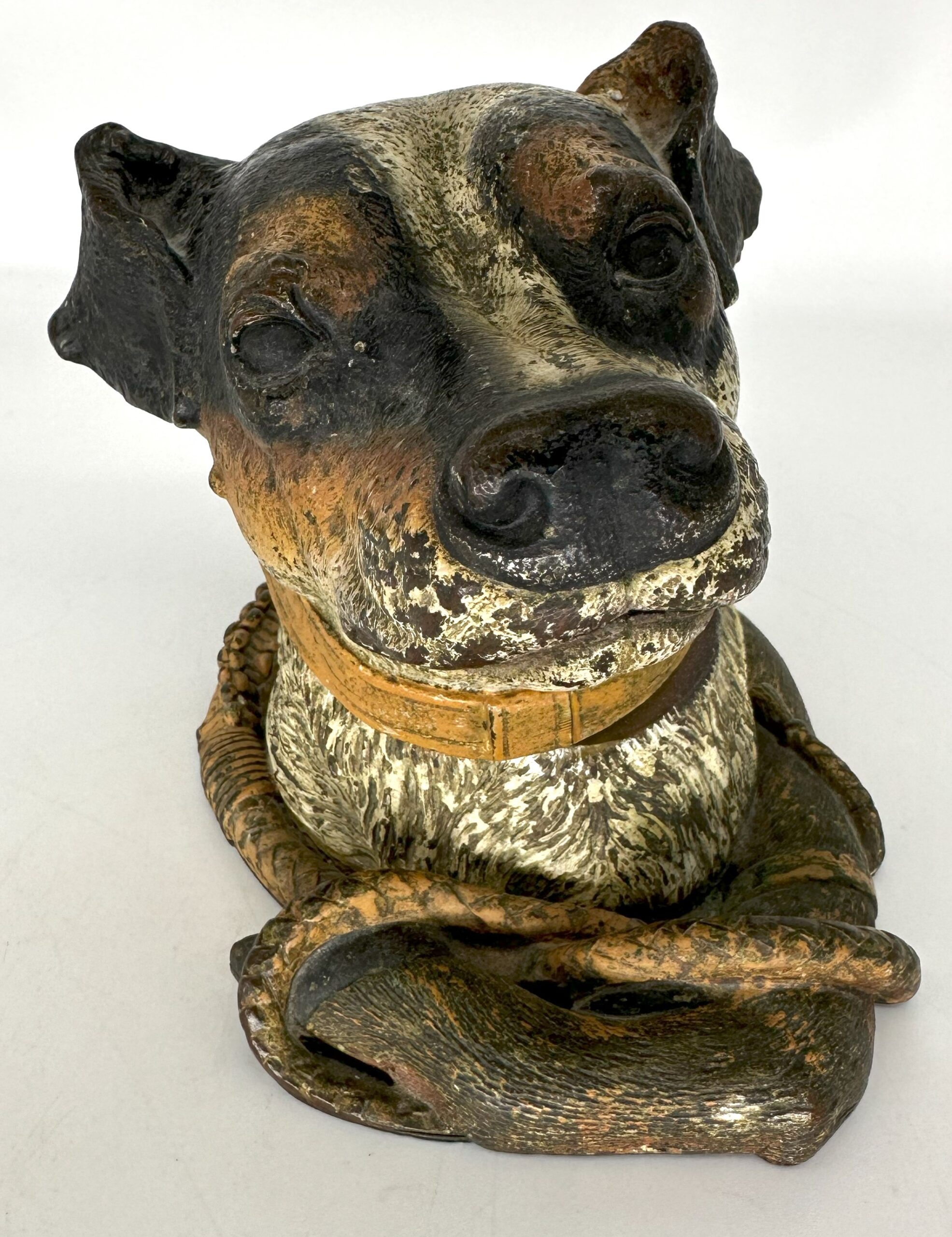 A late 19th Century cold-painted bronze inkwell in the form of a terrier (Jack Russell?) dog with hinged lid and hunting whip to base.