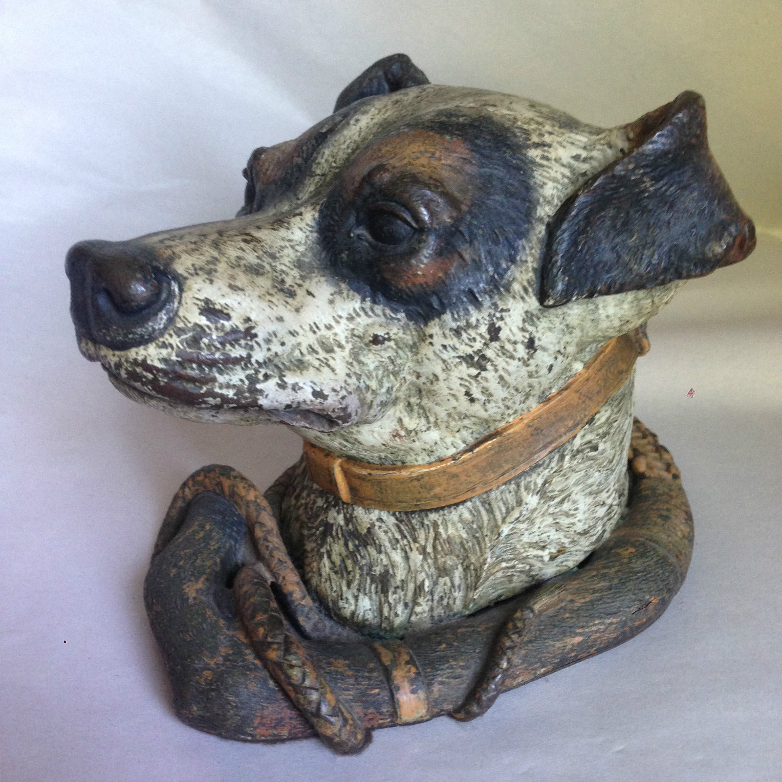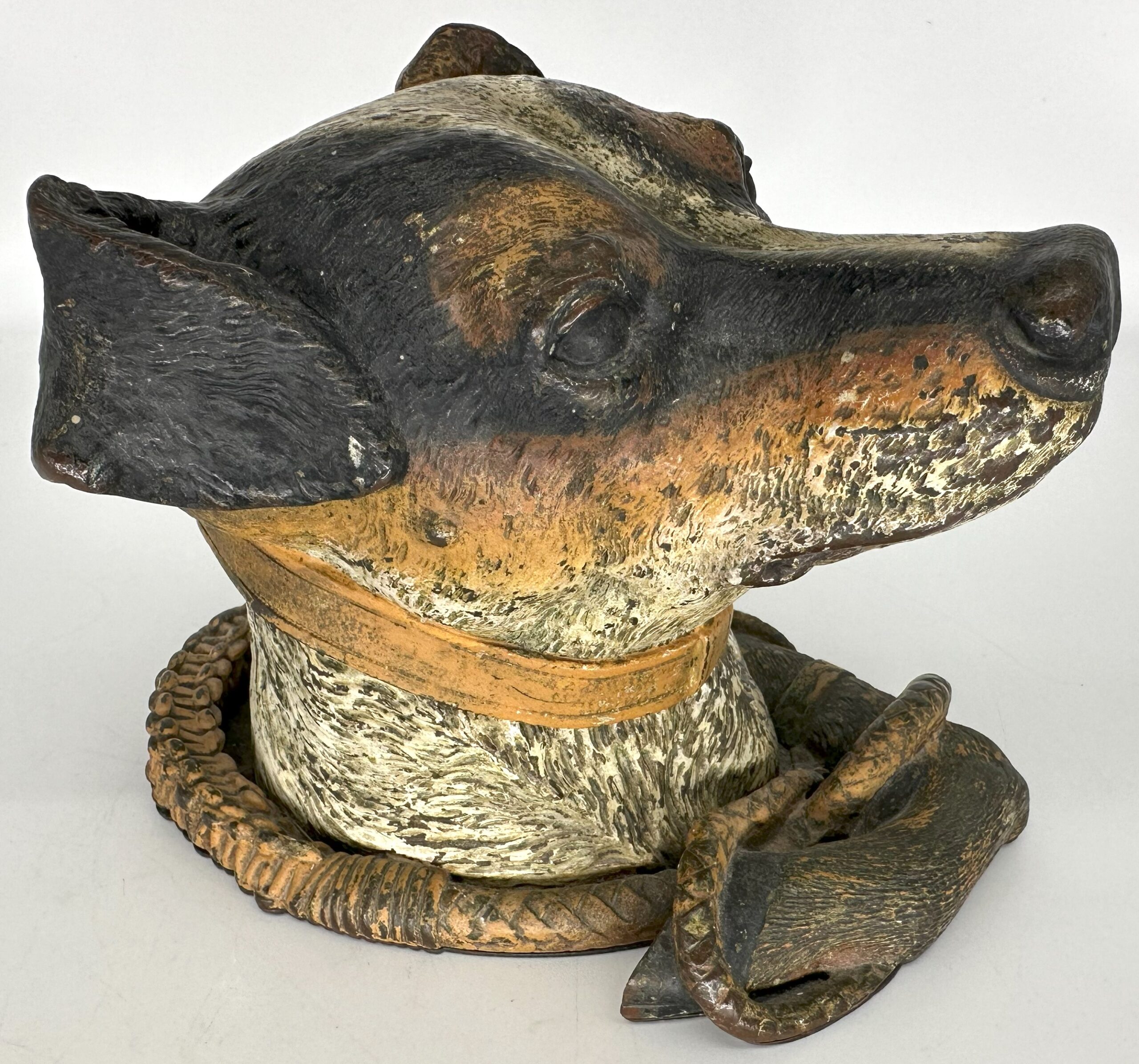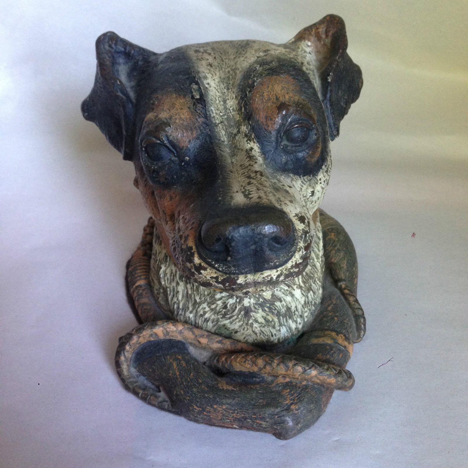 A late 19th Century cold-painted bronze inkwell in the form of a terrier (Jack Russell?) dog with hinged lid and hunting whip to base.