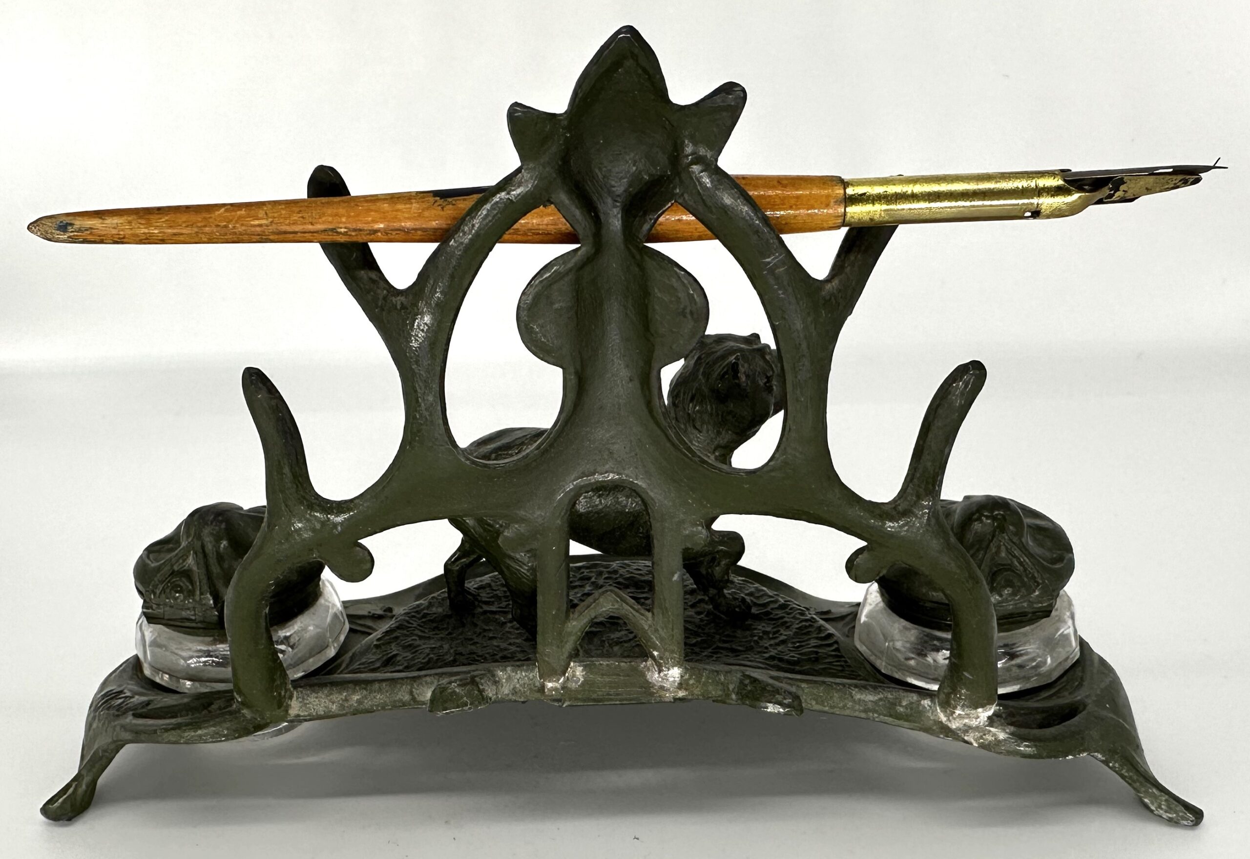 Double inkstand, with pen rack, featuring a bulldog or terrier between to glass stemmed inkwells with hinged lids.