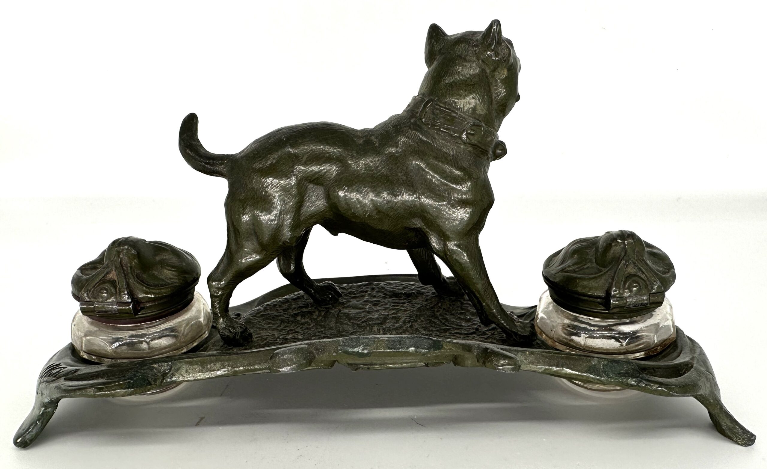 Double inkstand featuring a bulldog between to glass stemmed inkwells with hinged lids.