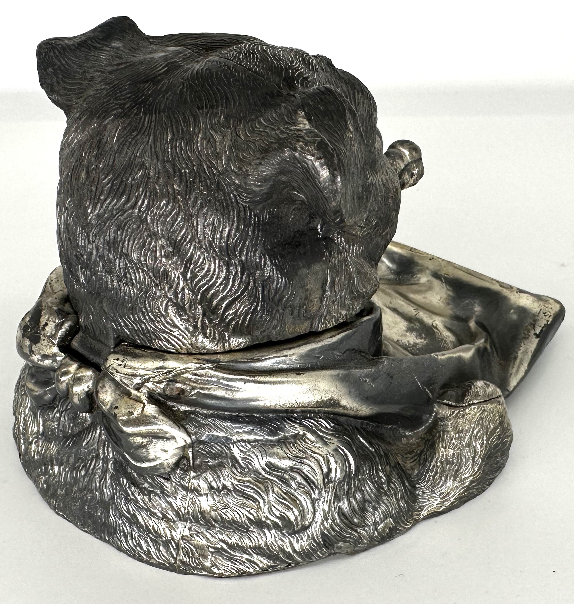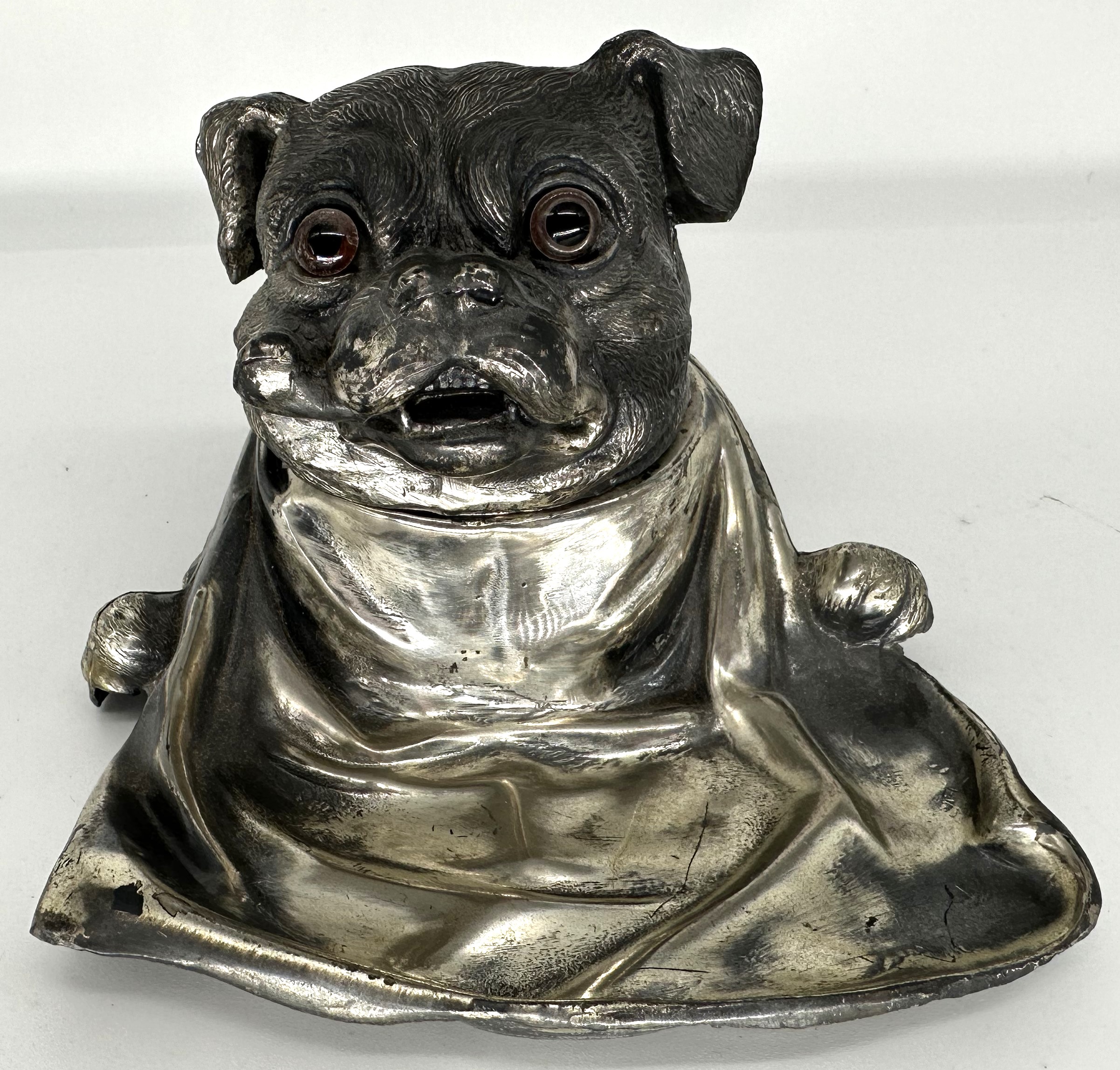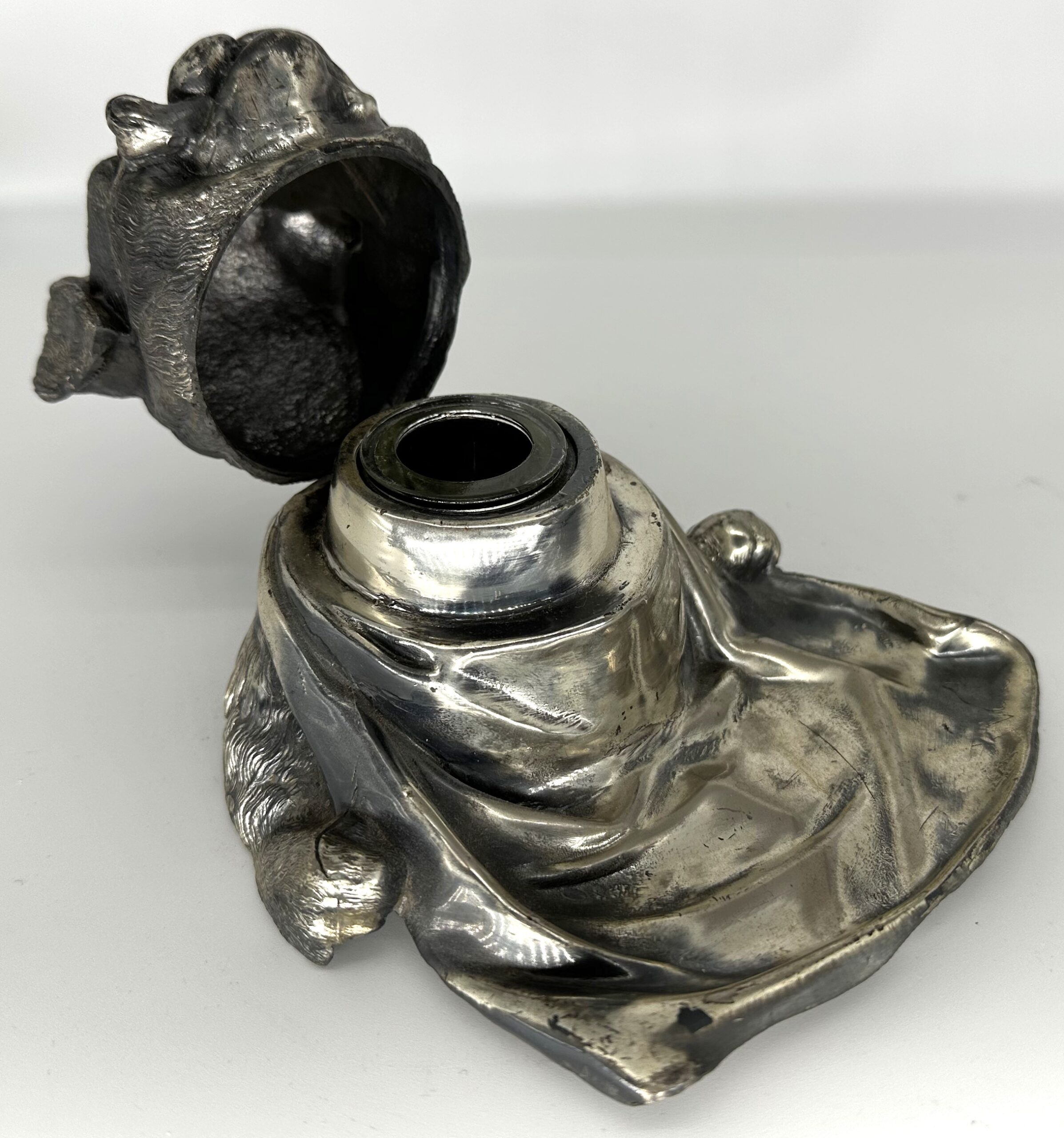 This hungry Bulldog (or pug?) has a bib around his neck tied in the back with a bow and is chomping away at a bone. The bib serves as a pen tray. Lots of detail captured in the expression of his face with its glass eyes, his teeth, the texture of the fur, and folds in the bib. The dog’s head is hinged at the neck and tips back for you to dip your pen in the original glass inkwell inside.
