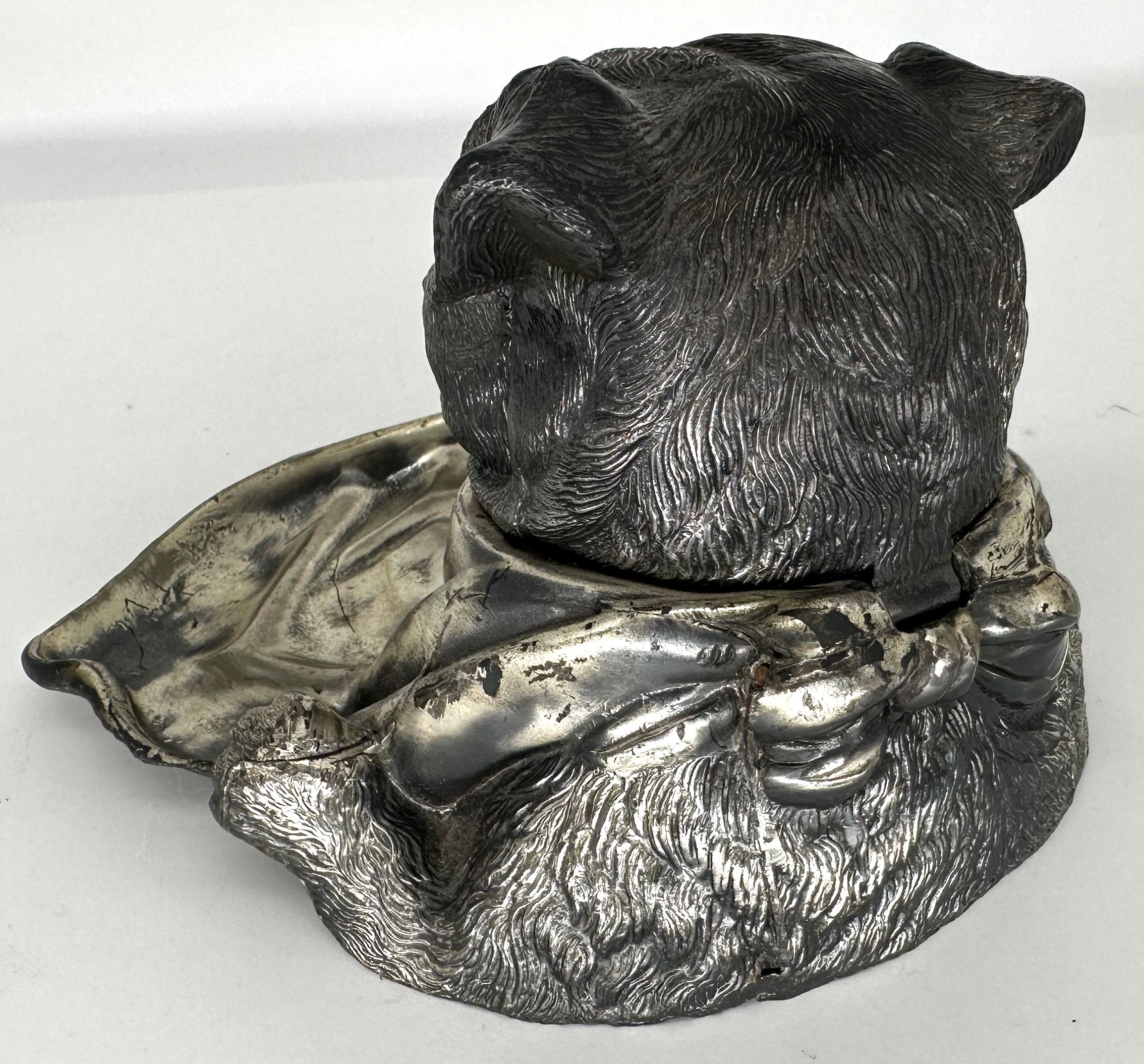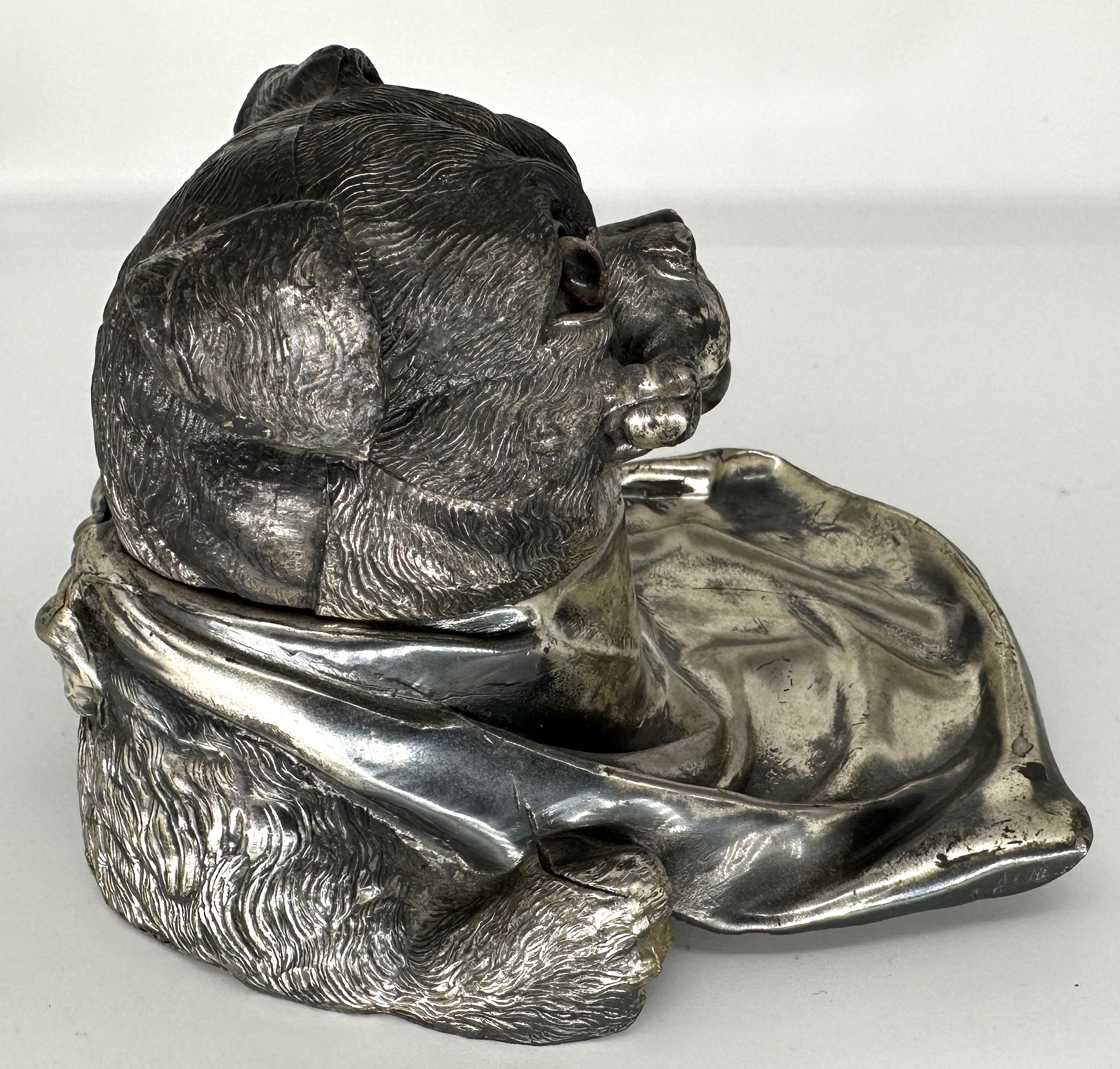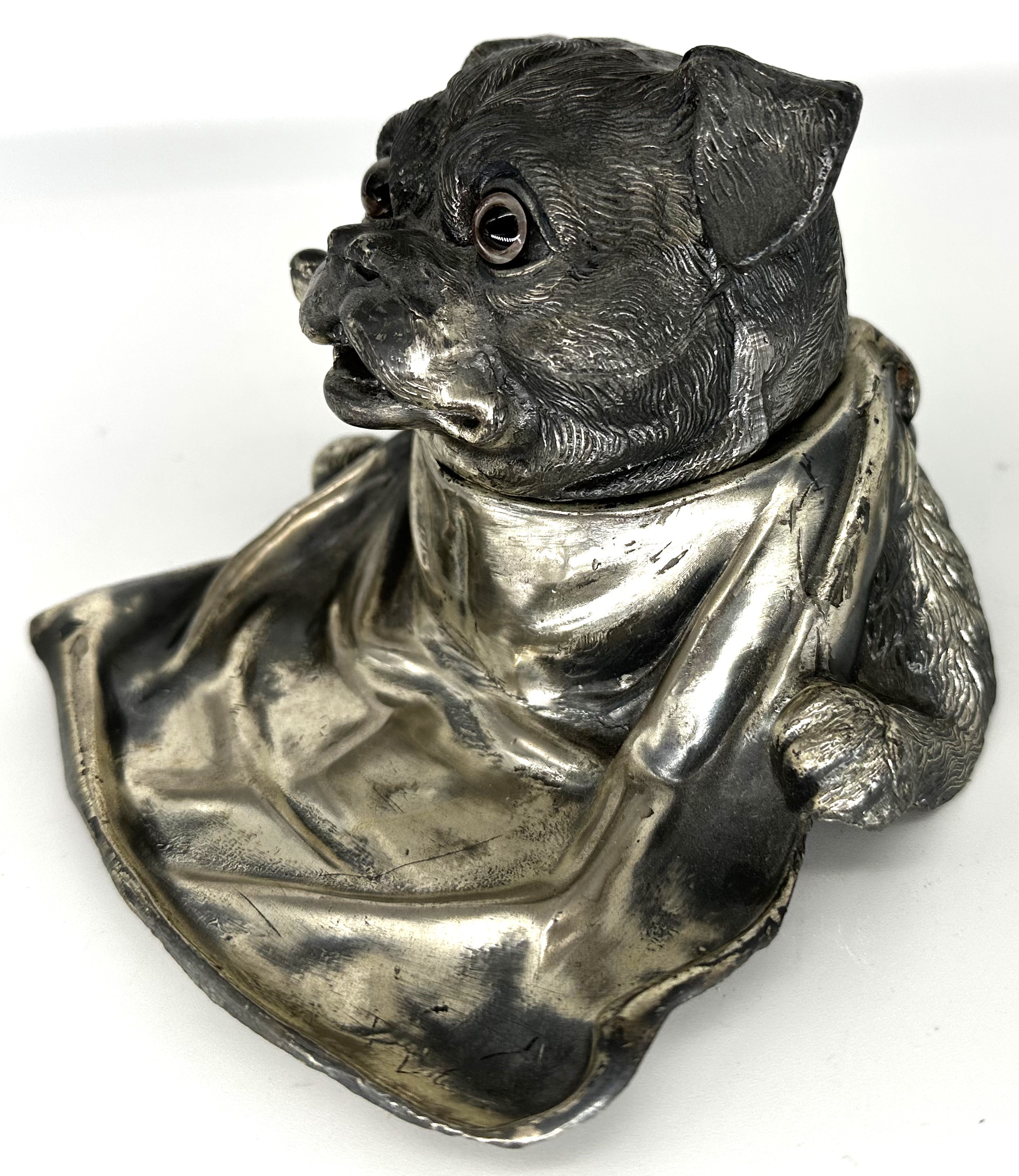 This hungry Bulldog (or pug?) has a bib around his neck tied in the back with a bow and is chomping away at a bone. The bib serves as a pen tray. Lots of detail captured in the expression of his face with its glass eyes, his teeth, the texture of the fur, and folds in the bib. The dog’s head is hinged at the neck and tips back for you to dip your pen in the original glass inkwell inside.