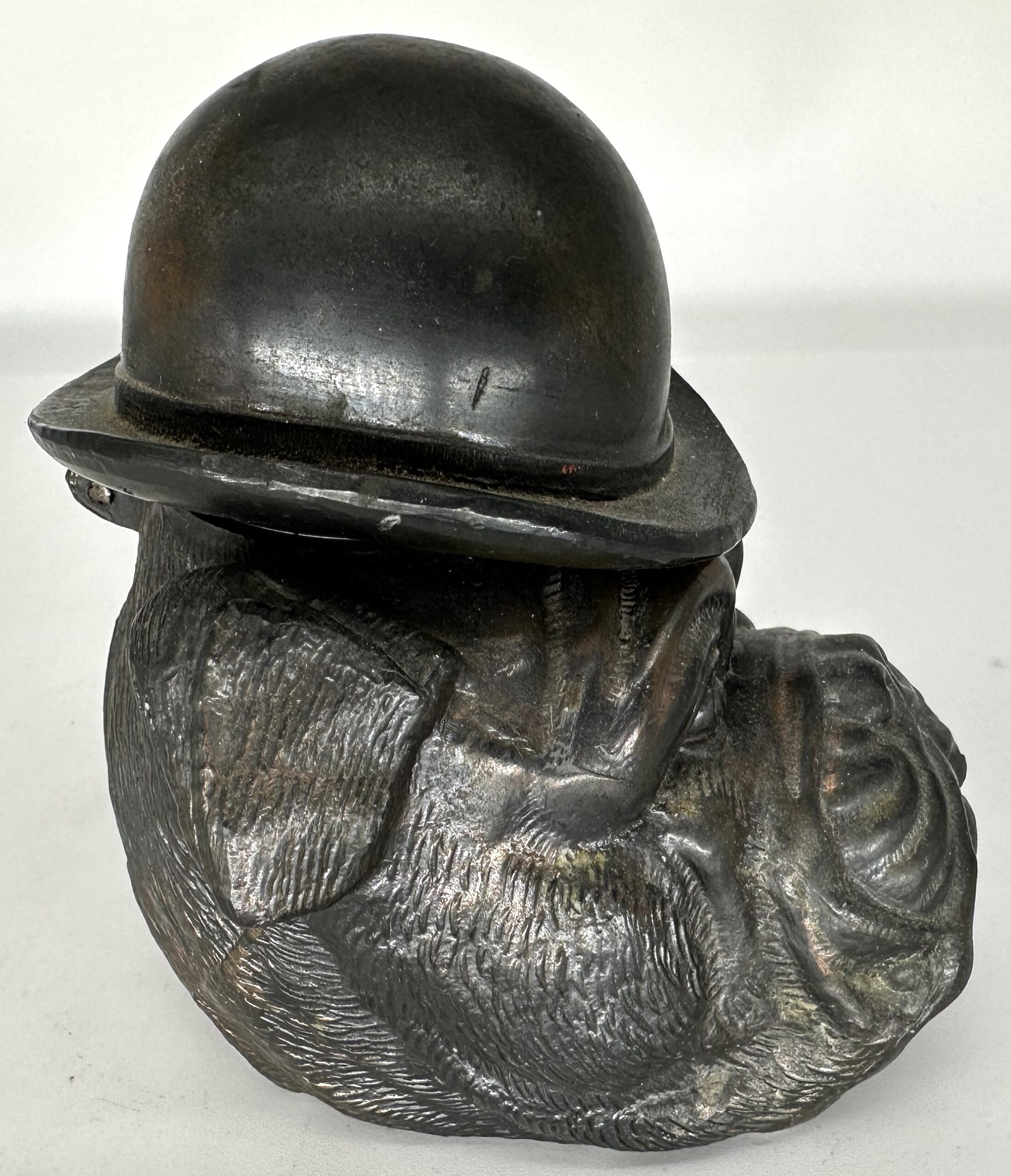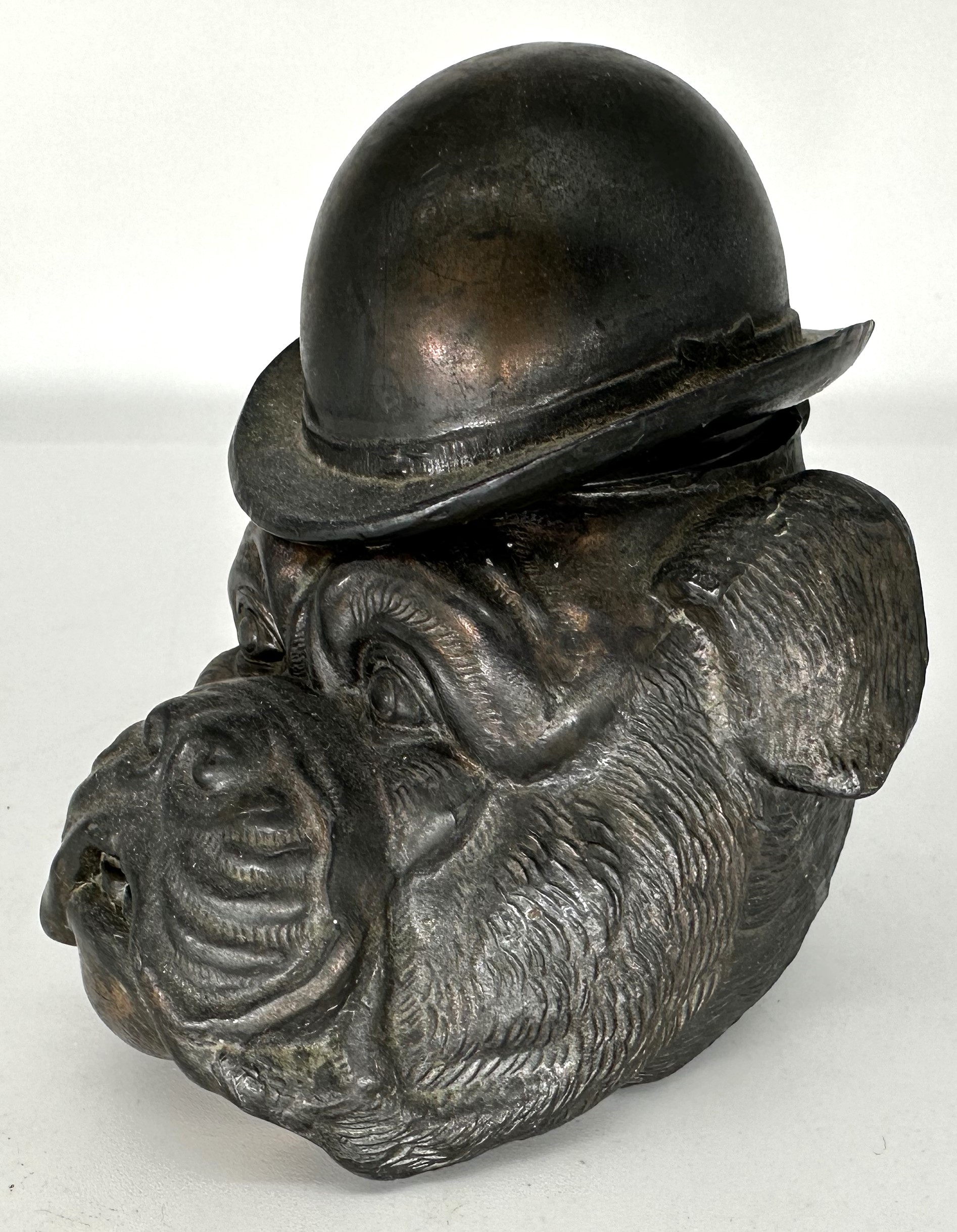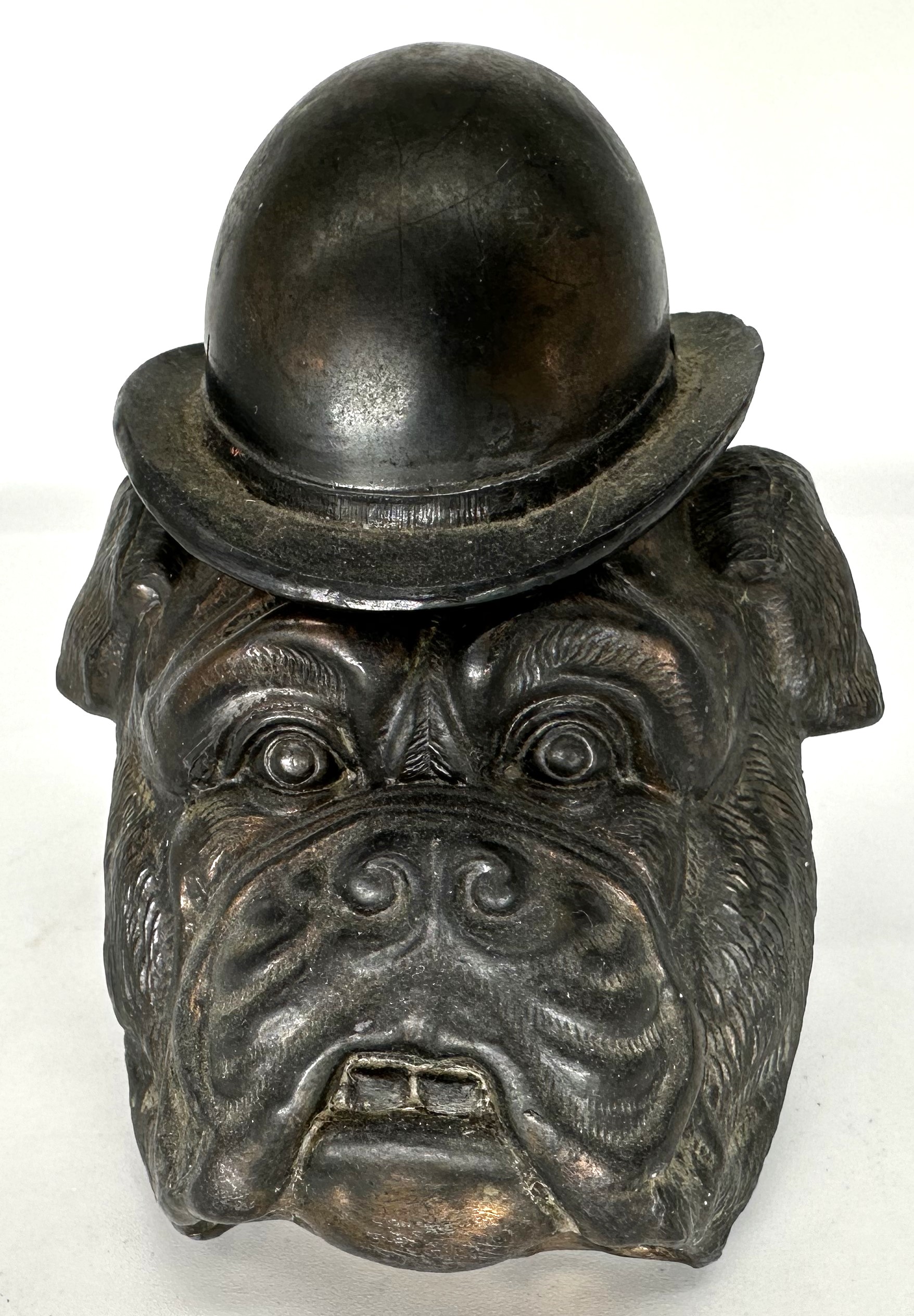 This charming bulldog sports a bowler hat, which lifts to access the inkwell. On the back of the piece, one finds a ribbed striker. The piece may have been designed to be used either as an inkwell or as a match holder.