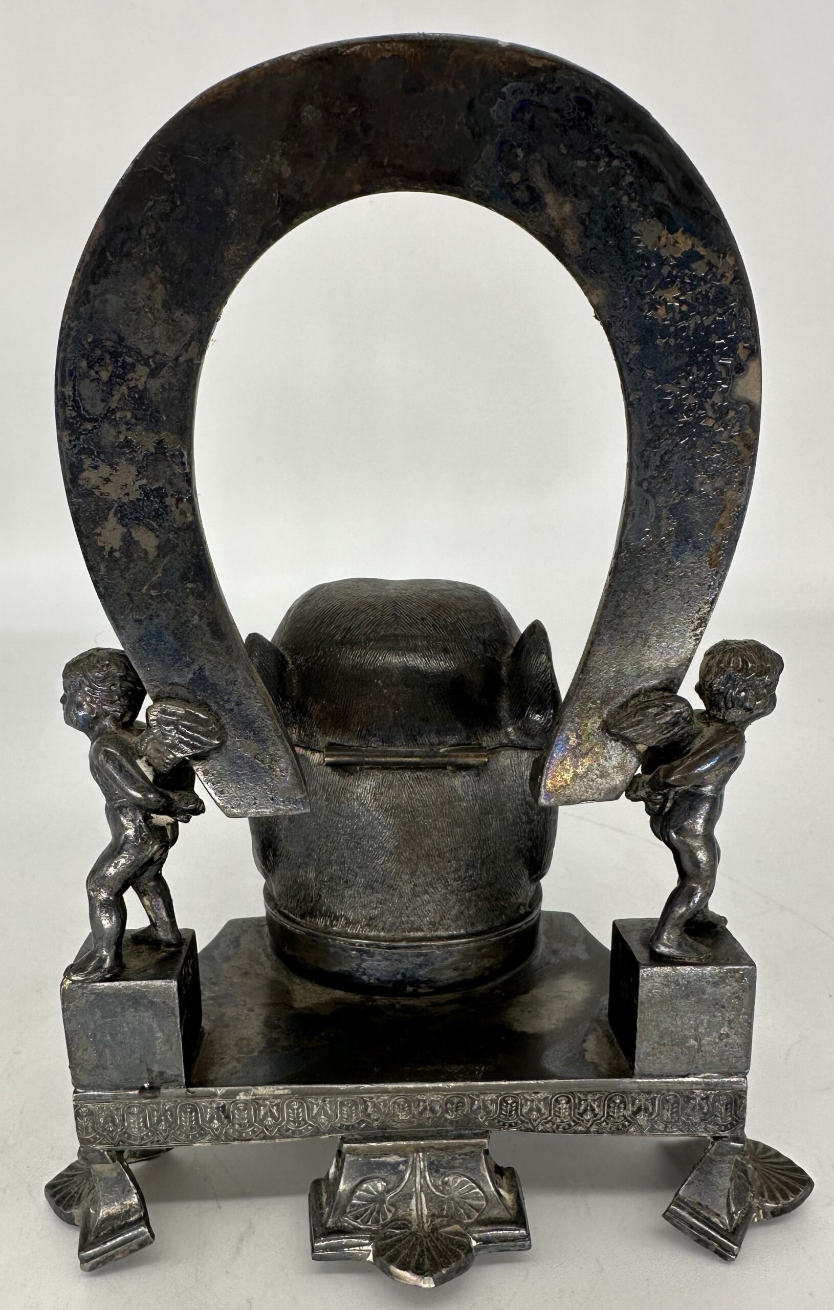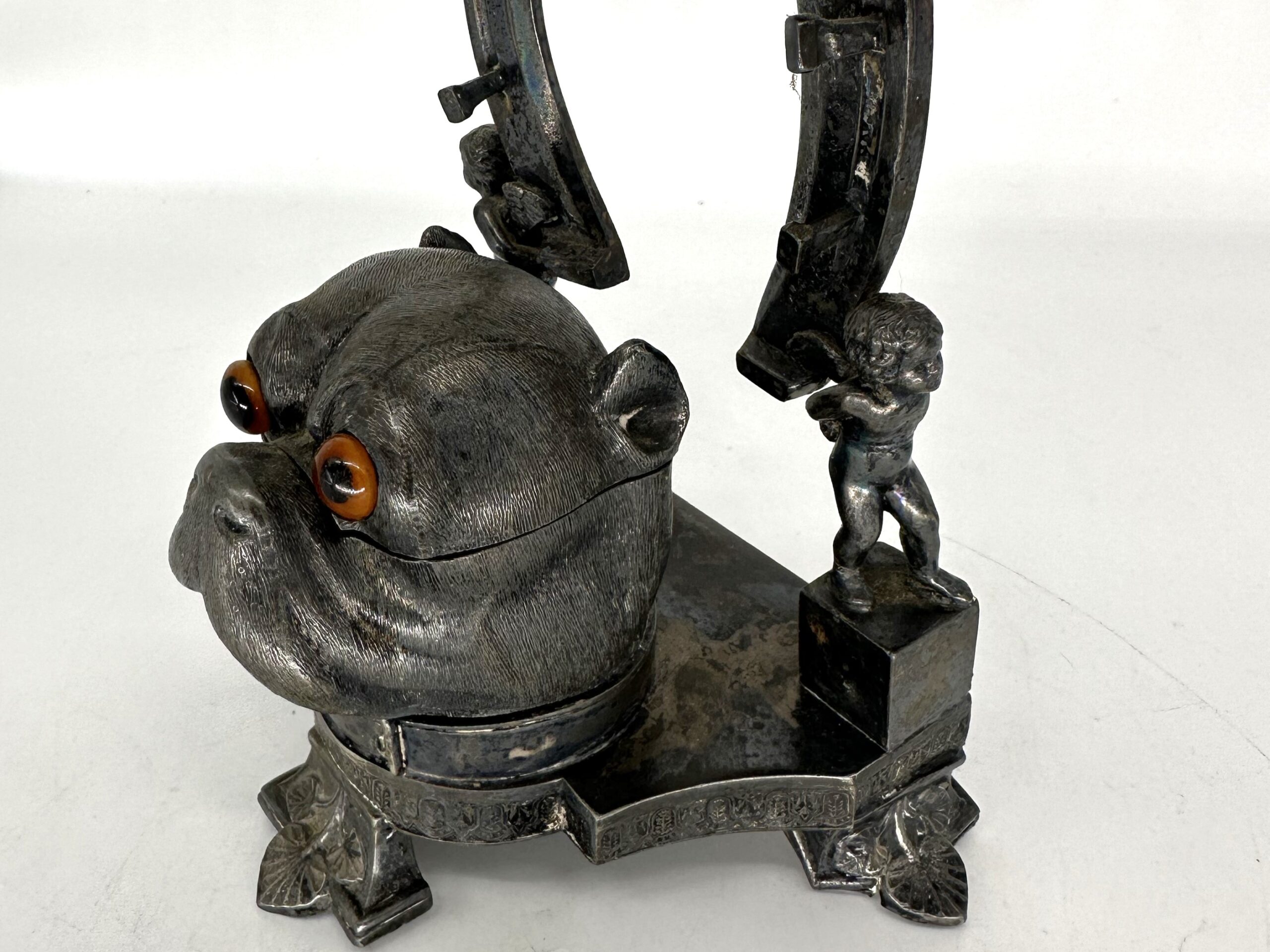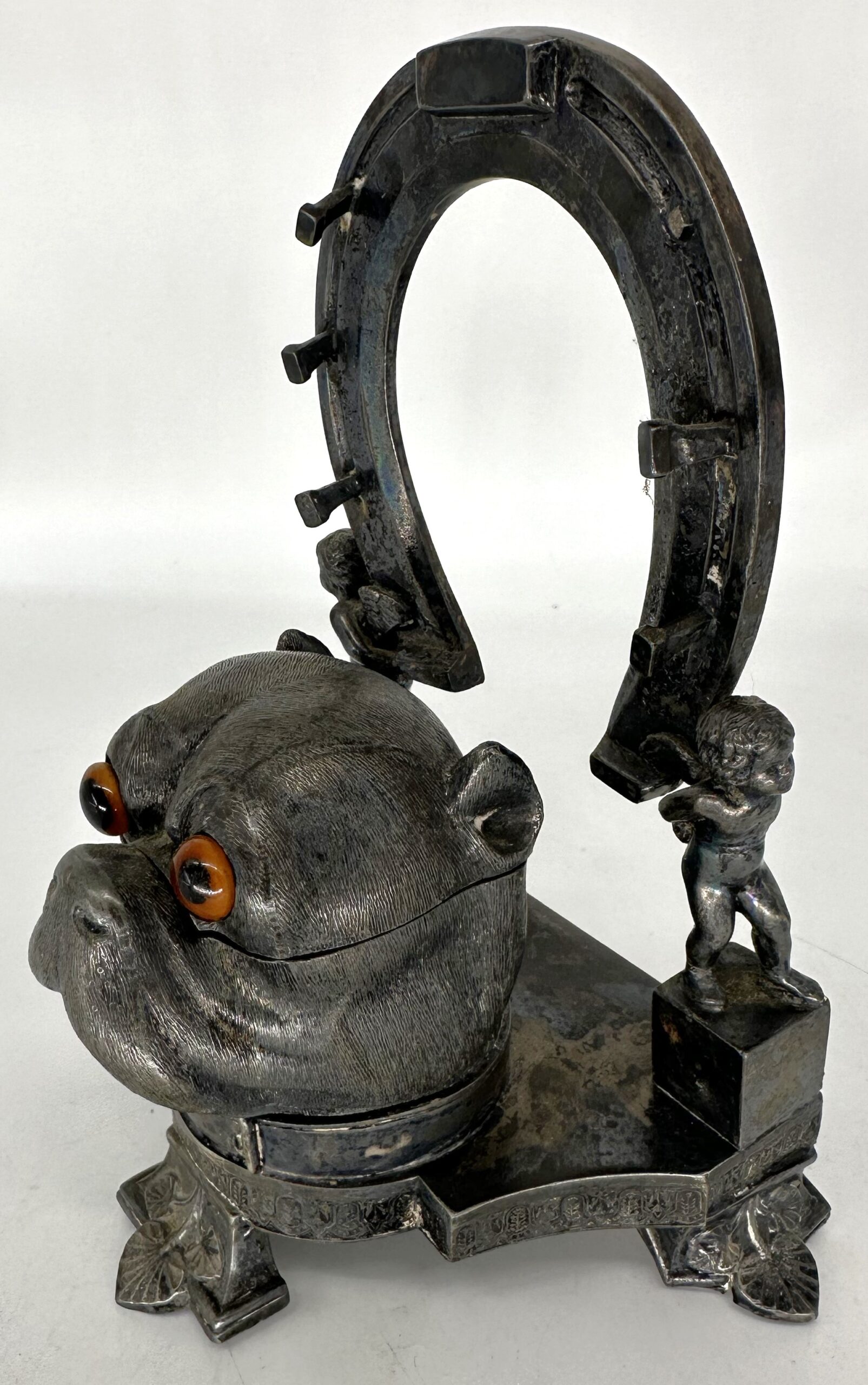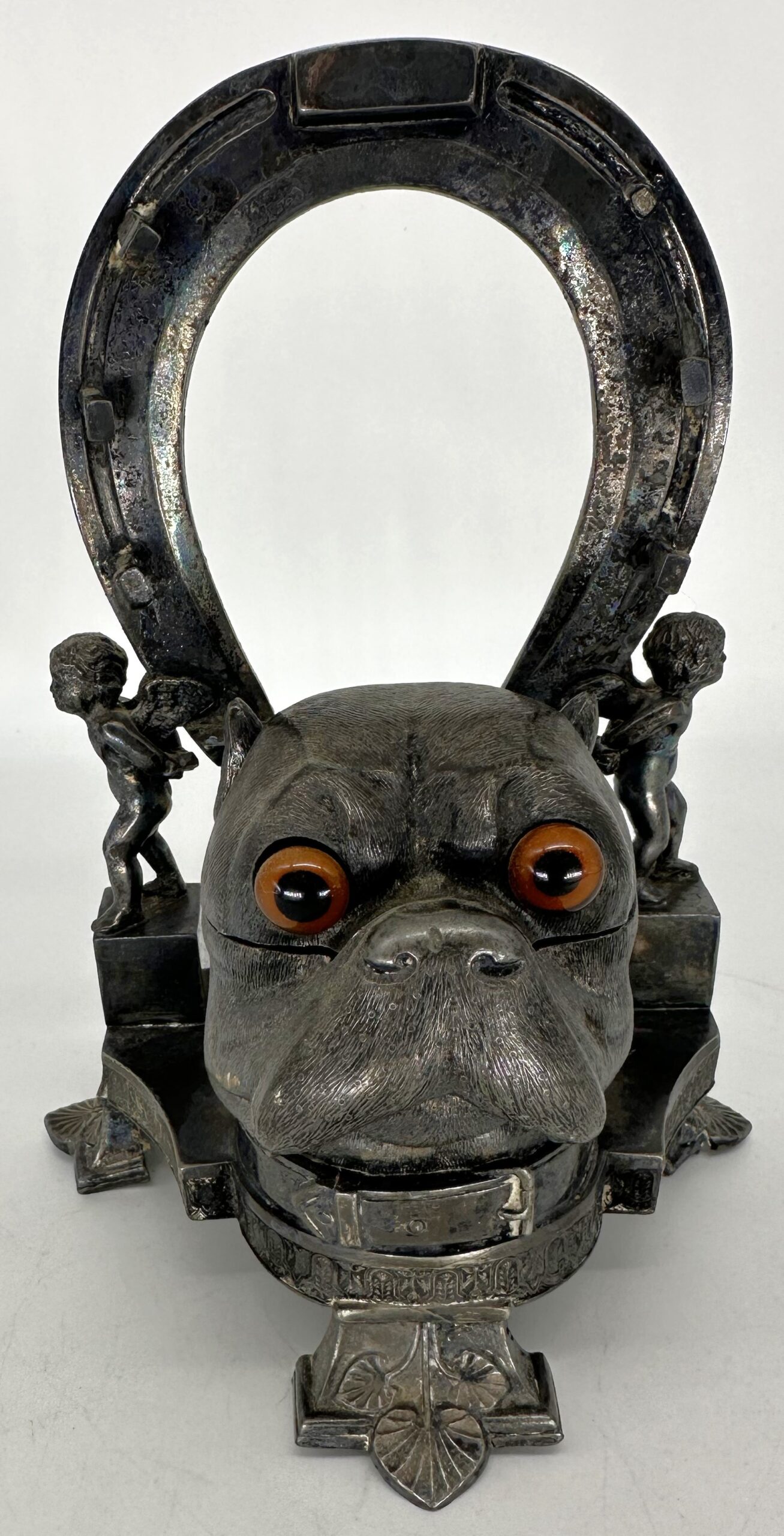 A three-footed base holds a bulldog’s head and a horseshoe supported on each side by cherubs. The bulldog, wearing a nicely detailed collar, has glass eyes which are wired to the interior. The dog’s head lifts to access the inkwell. Two little cherubs do some heavy lifting, holding up the horseshoe embedded with nails to hold pens.