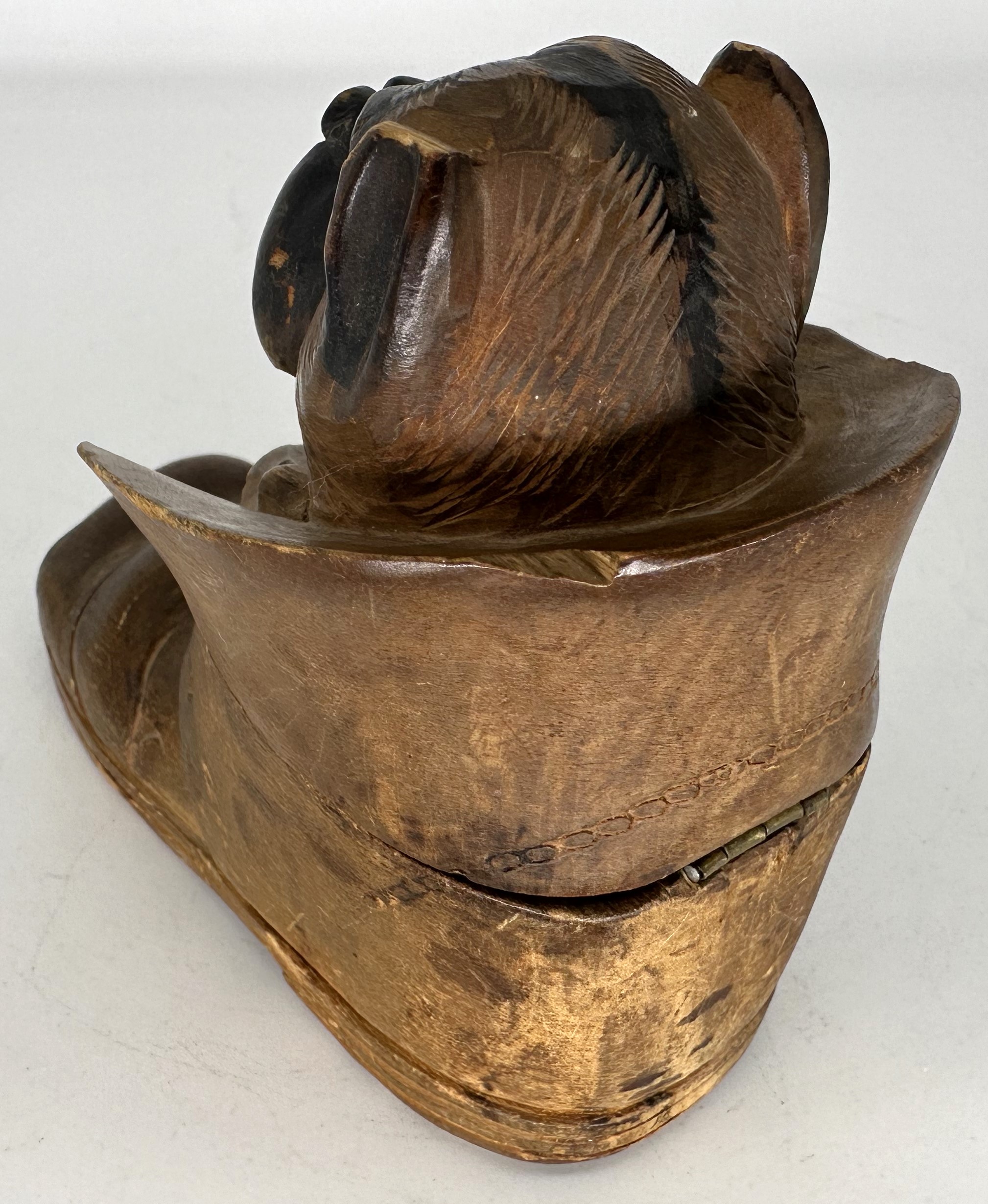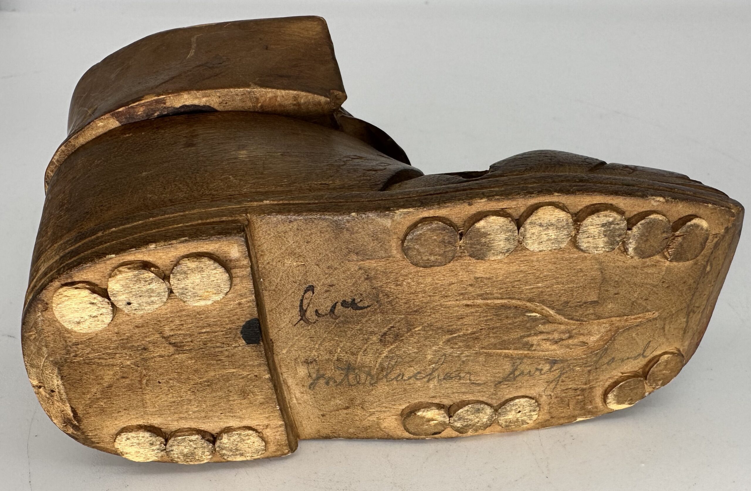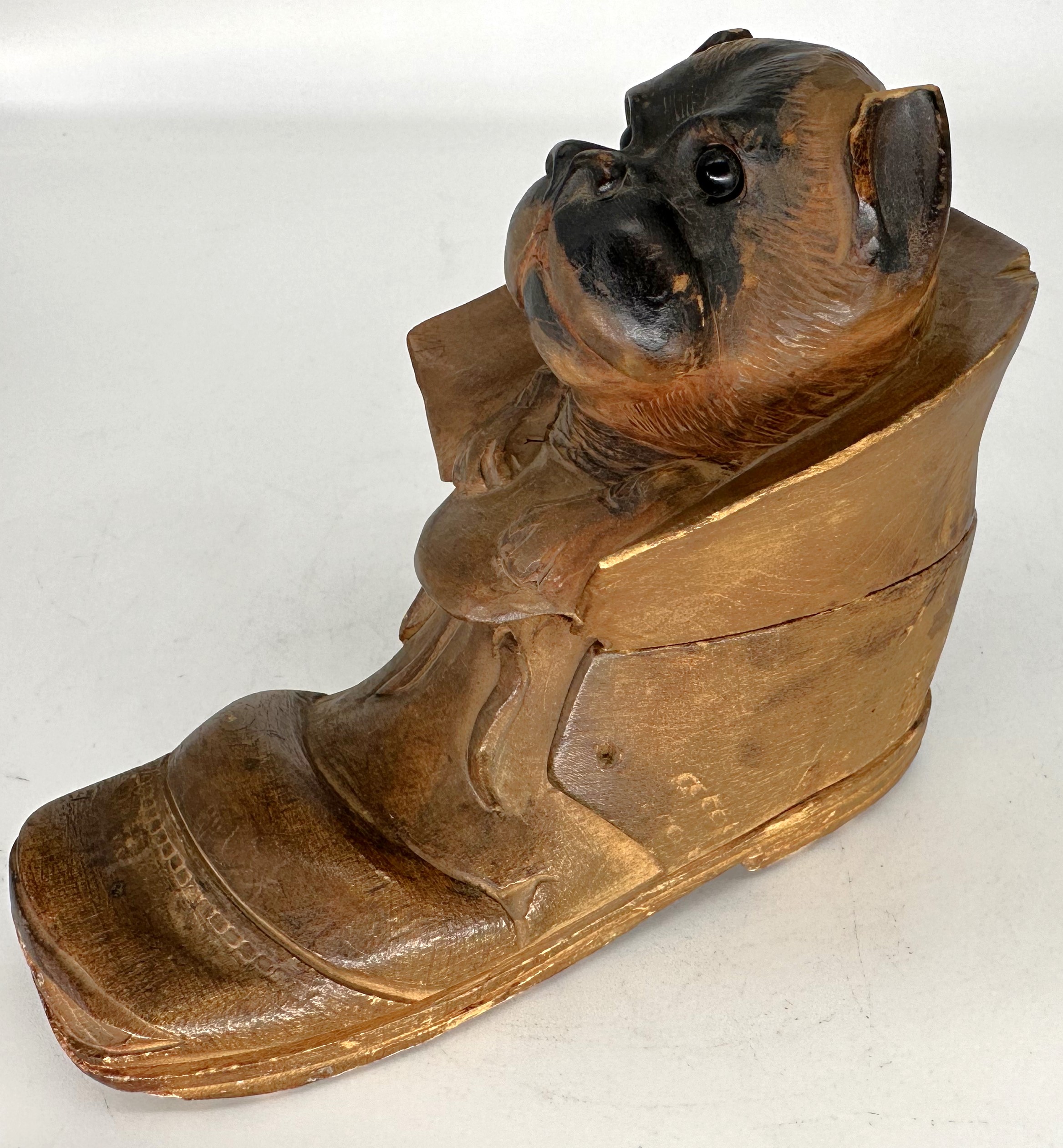 Hand-carved Black Forest inkwell in the form of an old hiking boot with a dog sitting inside. The dog’s head (with glass eyes) is hinged and opens to reveal a fitted glass inkwell. On the bottom, written in pencil is “Interlaken Switzerland”, apparently a souvenir. There is also an incised image of an abstract bird-like form – perhaps the carver’s mark.