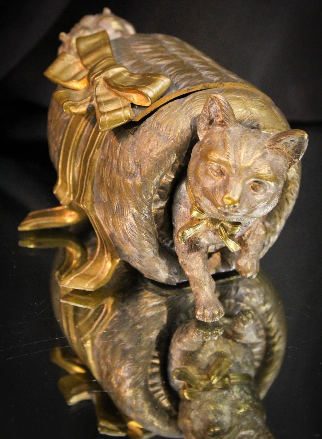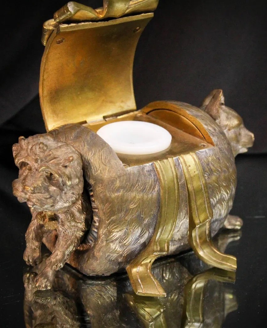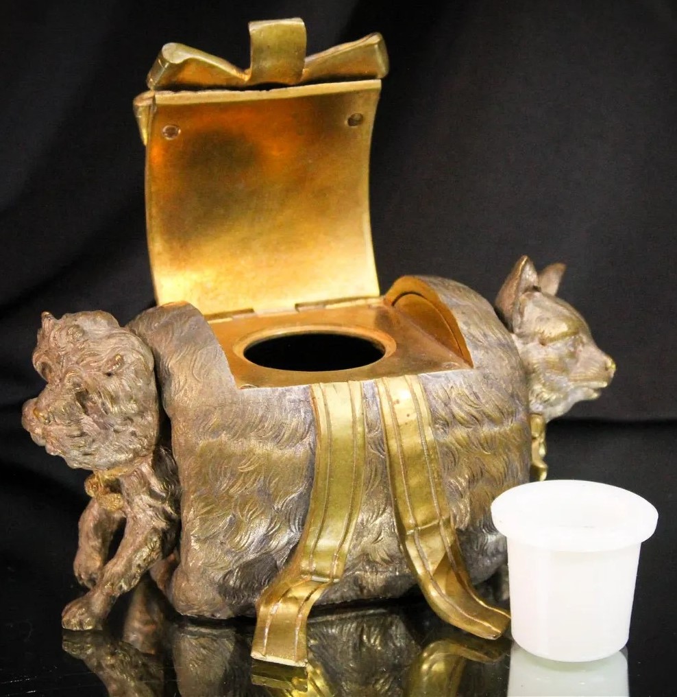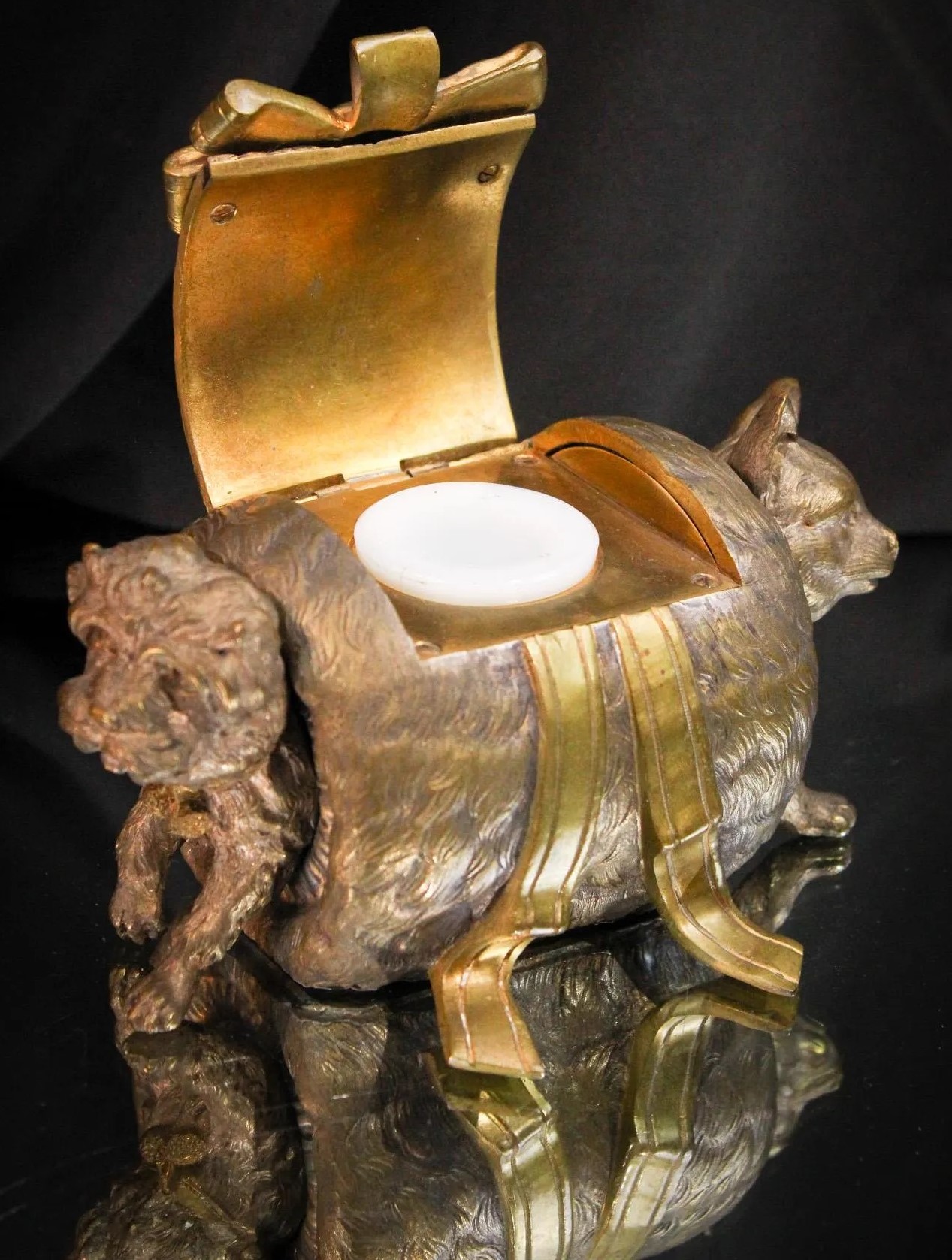 Bronze figural inkwell in the form of a hand muff adorned with a ribbon. Emerging at each end of the muff is a dog or a cat.