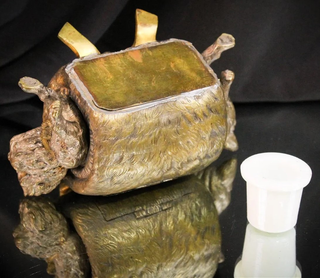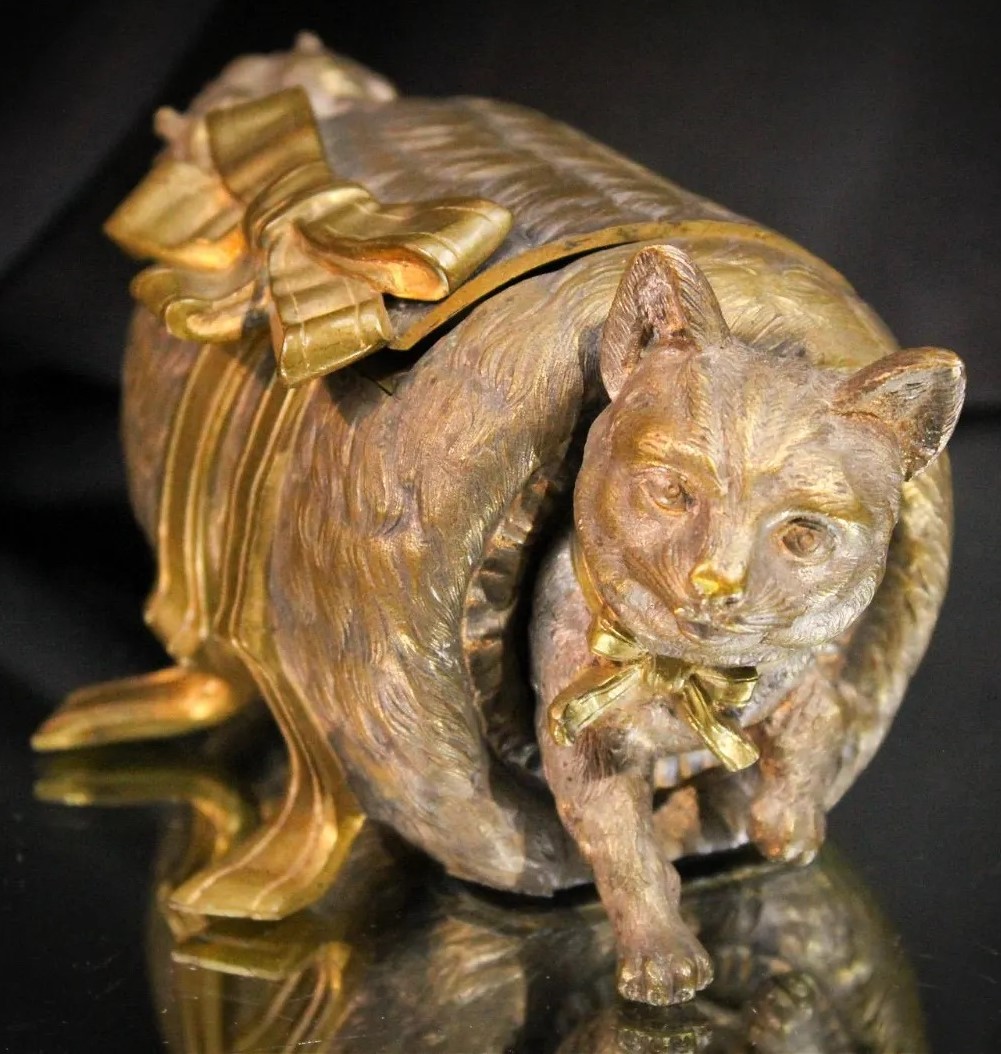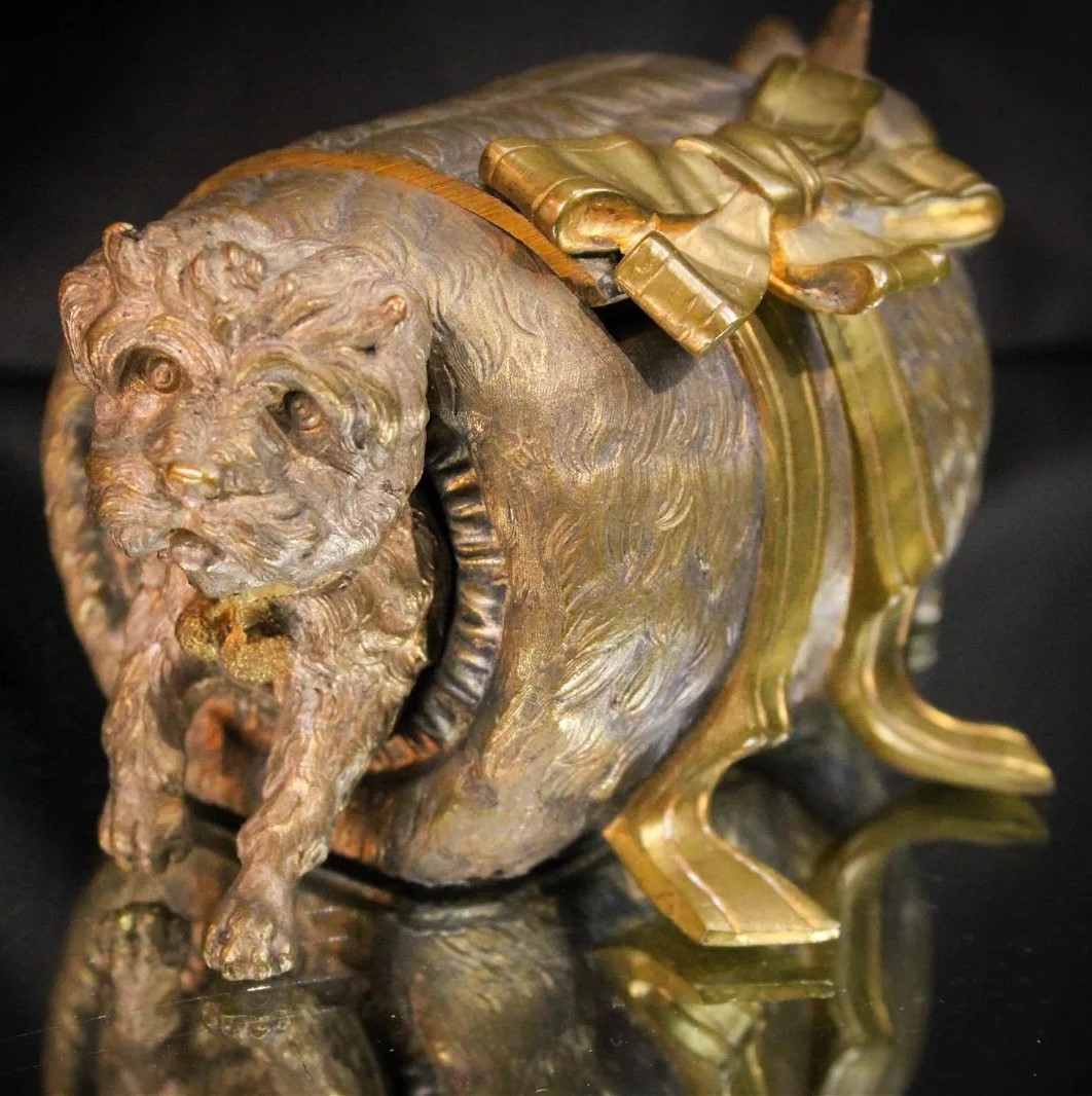 Bronze figural inkwell in the form of a hand muff adorned with a ribbon. Emerging at each end of the muff is a dog or a cat.
