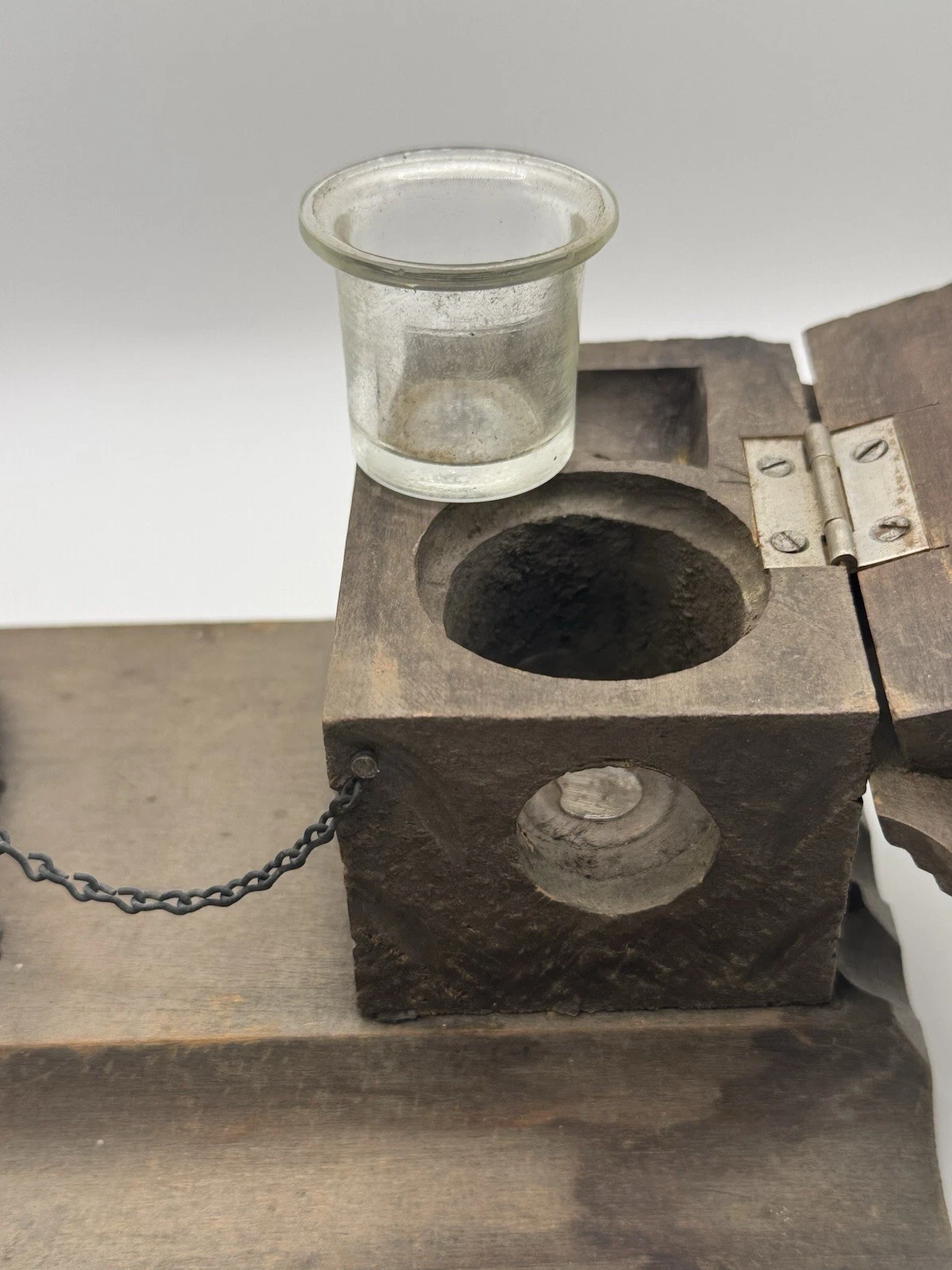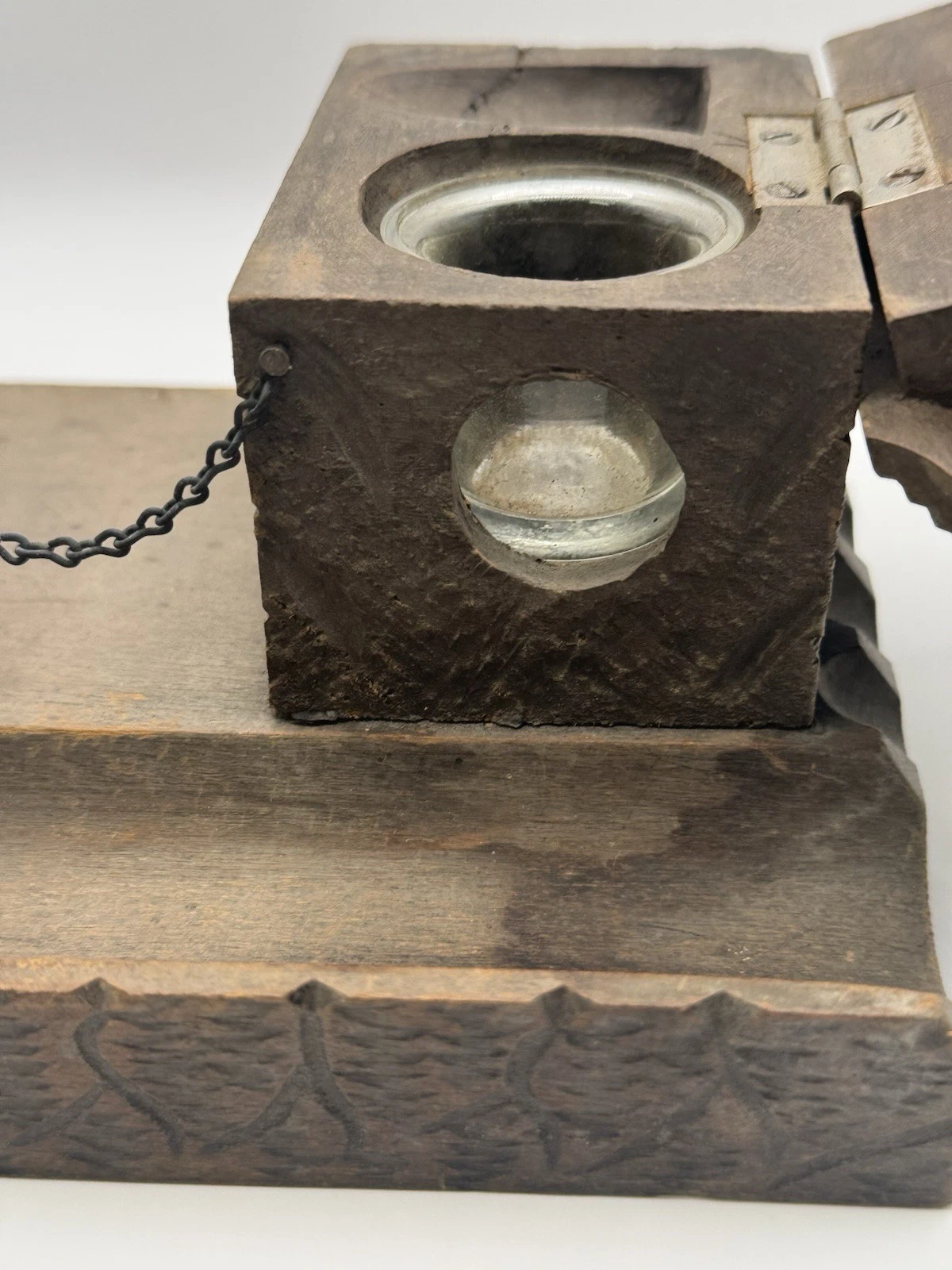 Hand-carved Collie dog stands chained next to his dog house. The roof of the dog house opens to access the inkwell.