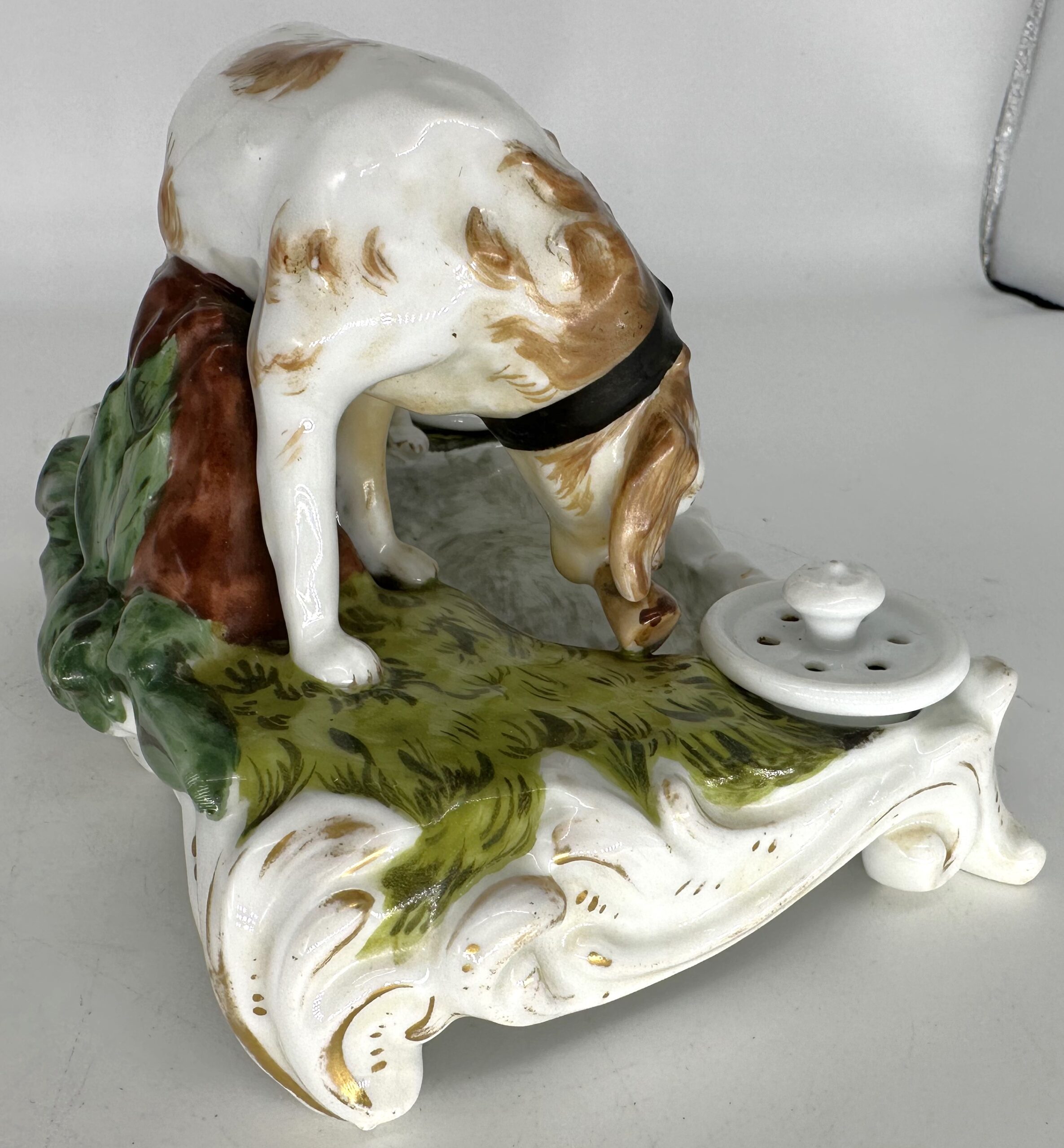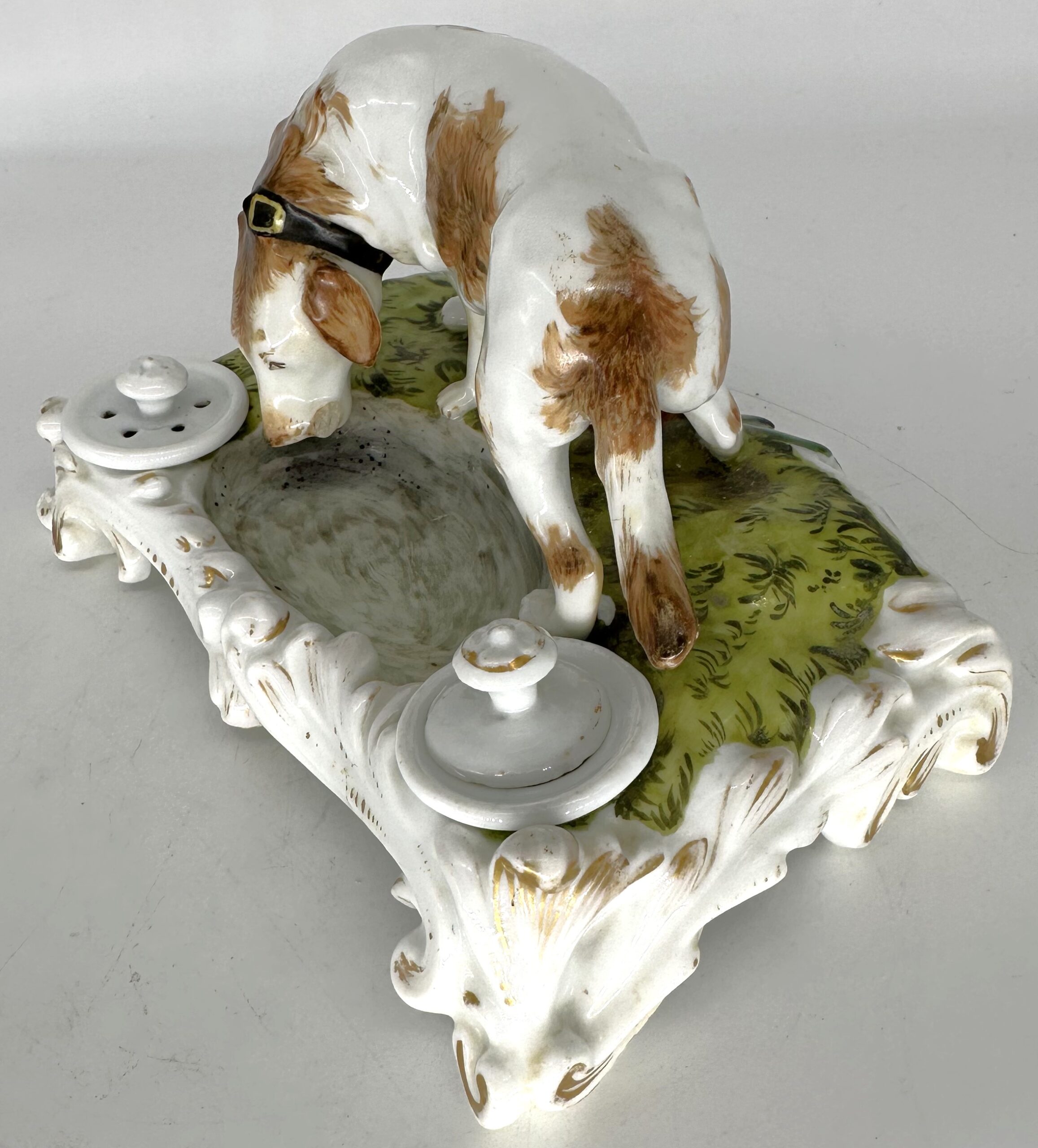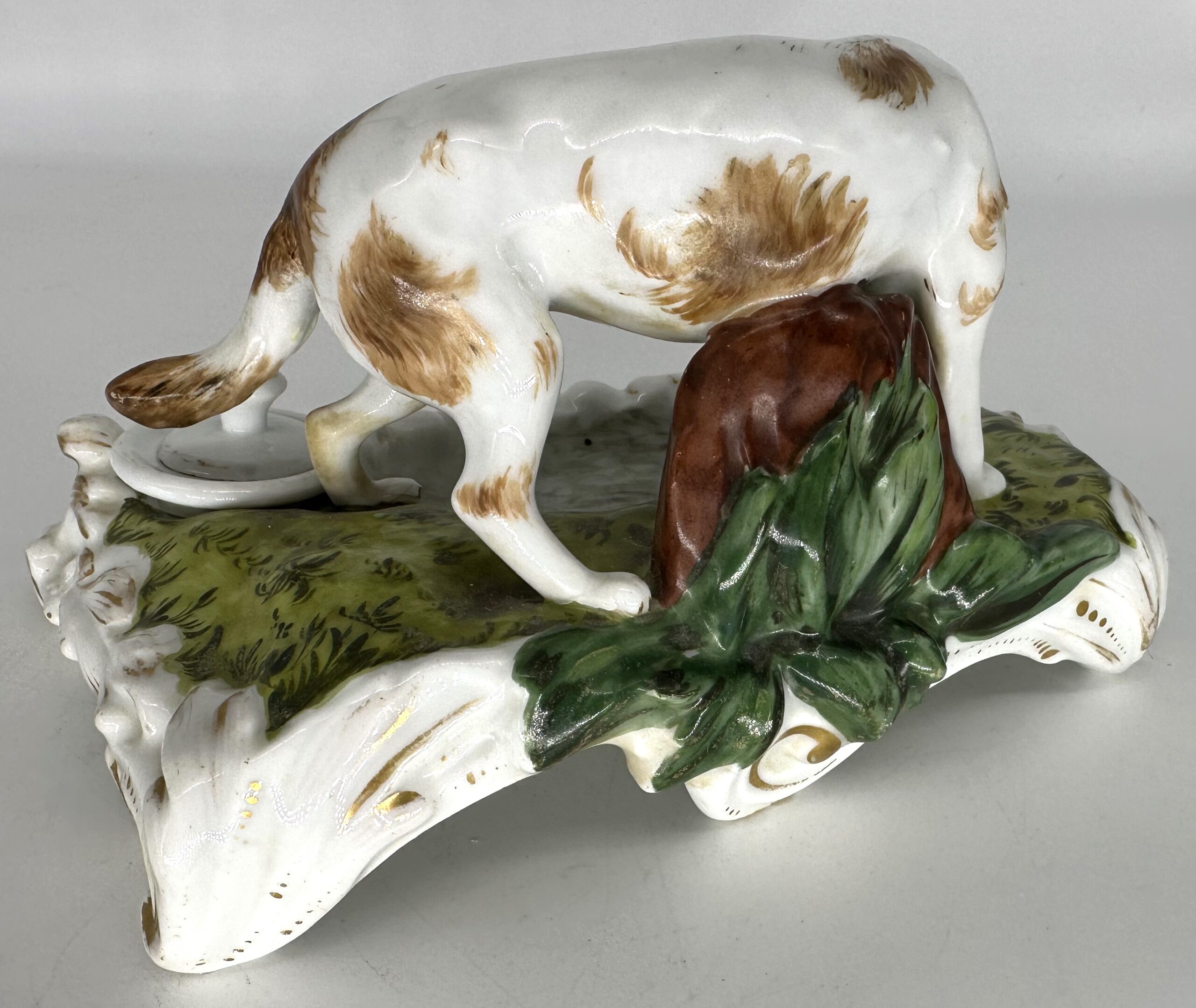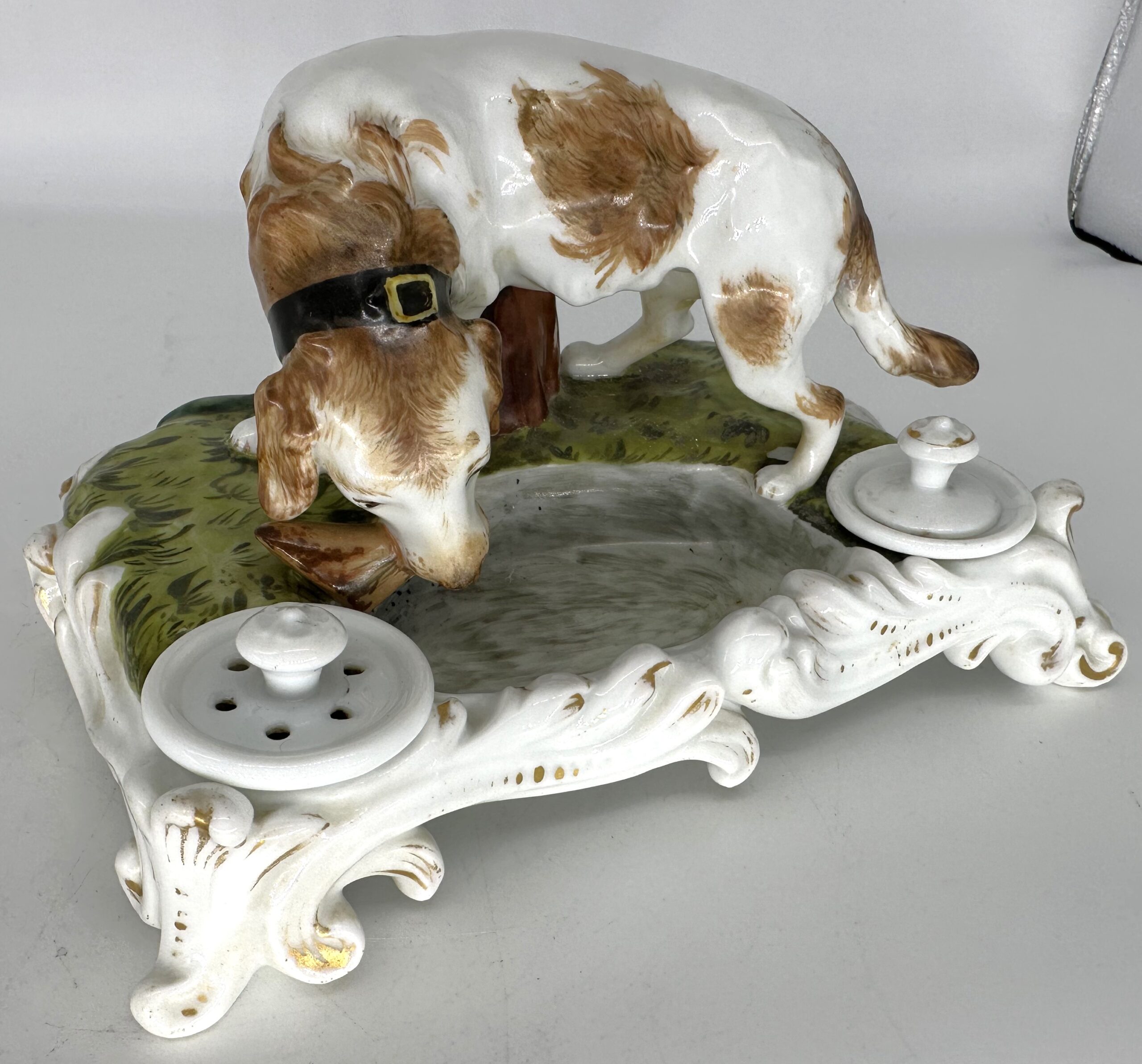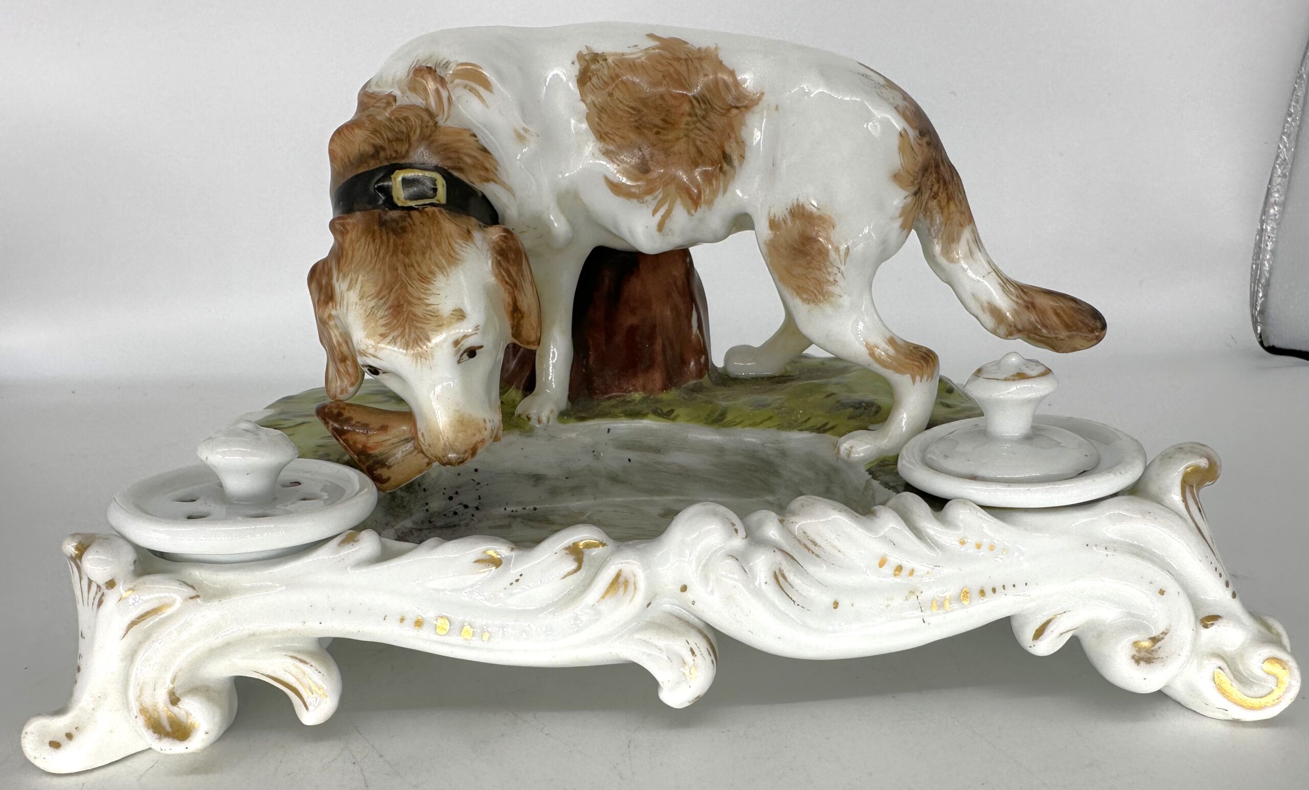 A hand-painted 19th Century porcelain inkstand with the large figure of a brown and white dog. The dog has a wide collar with gilt buckle and carries a piece of meat in his mouth. He stands on a grassy base next to a pool of water. Behind him is a tree stump. In front is a sander and an inkwell with a detached lid.