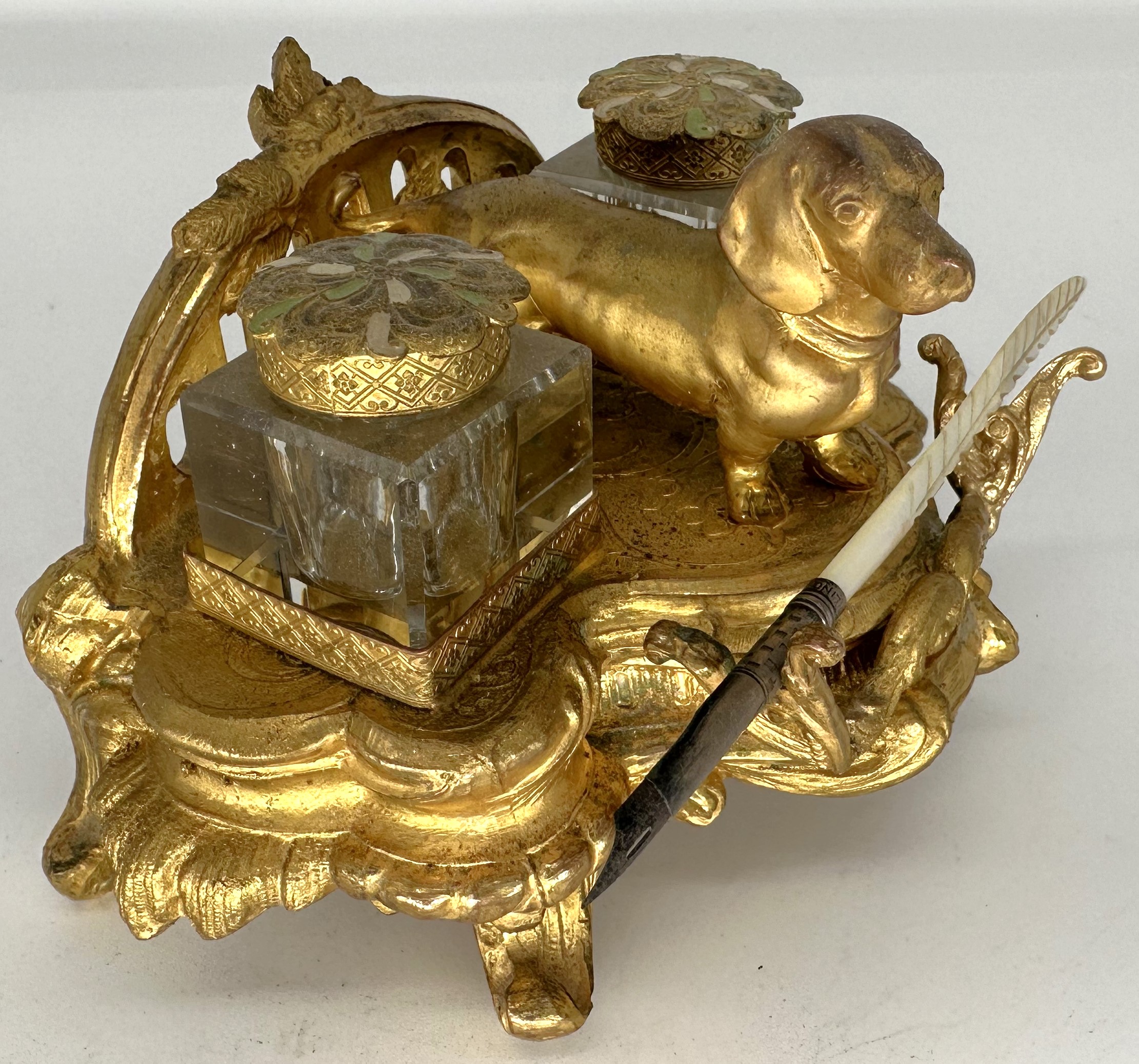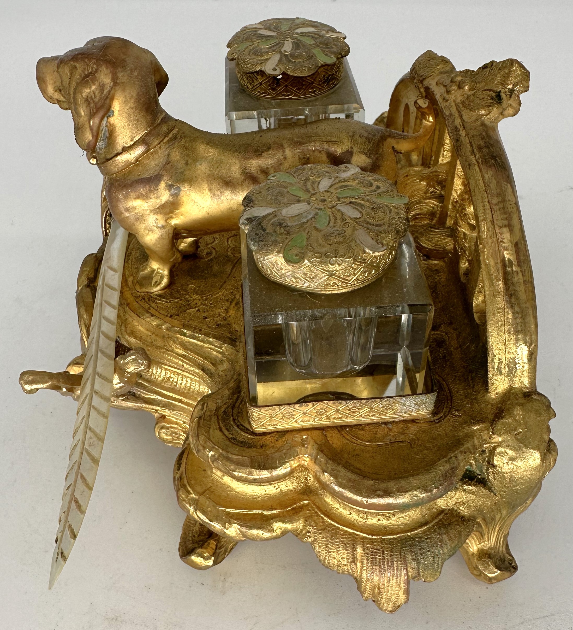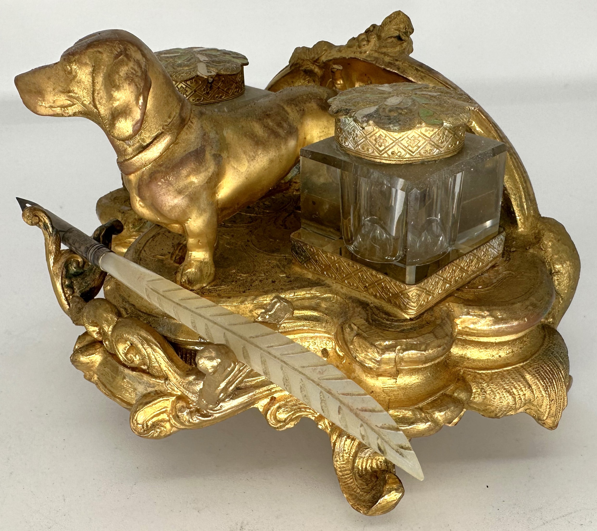 This brass and gilt metal double inkstand features a dachshund standing between two inkwells. The glass inkwells with enameled lids fit perfectly on the base. There is a pen holder in the front.