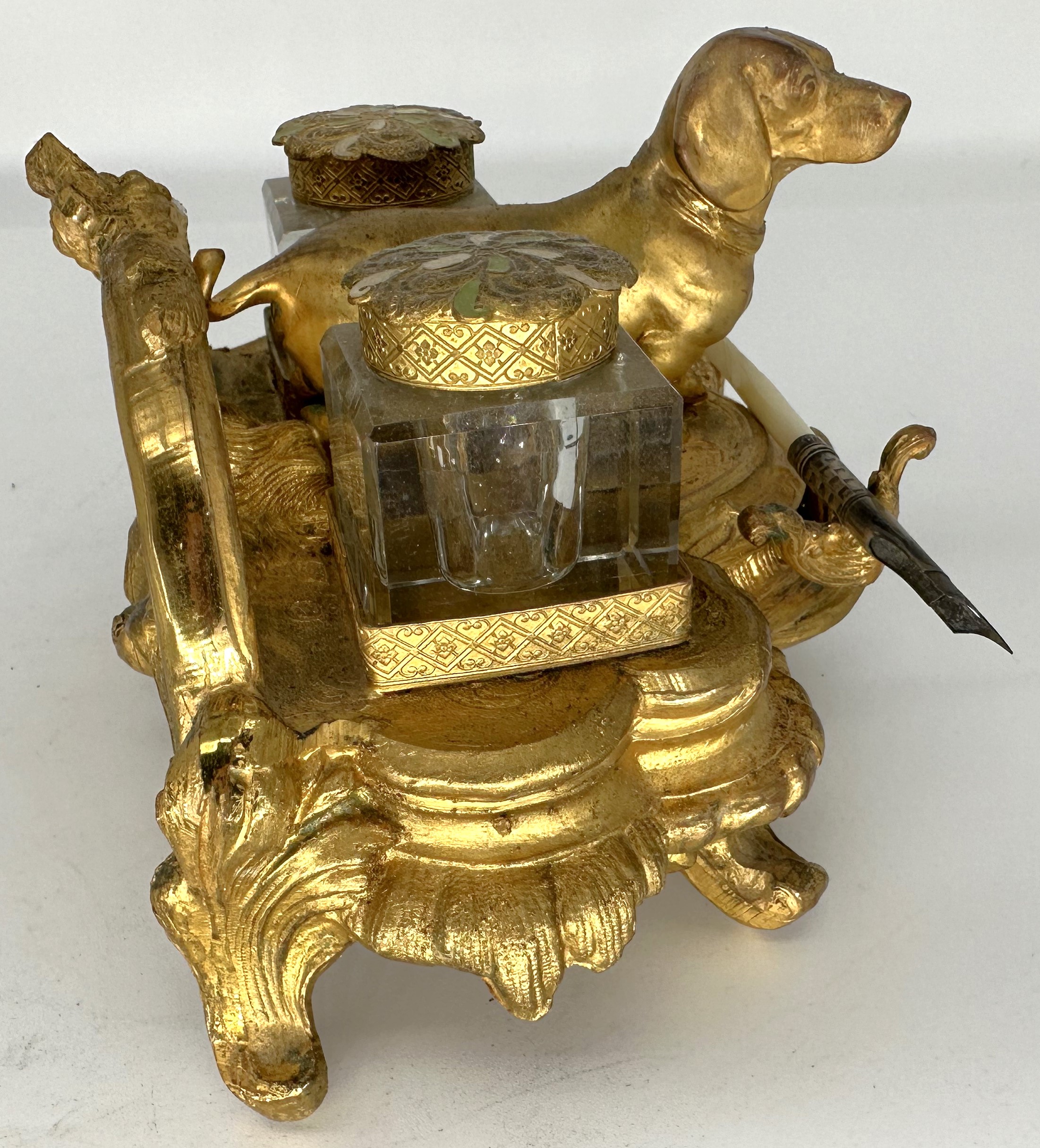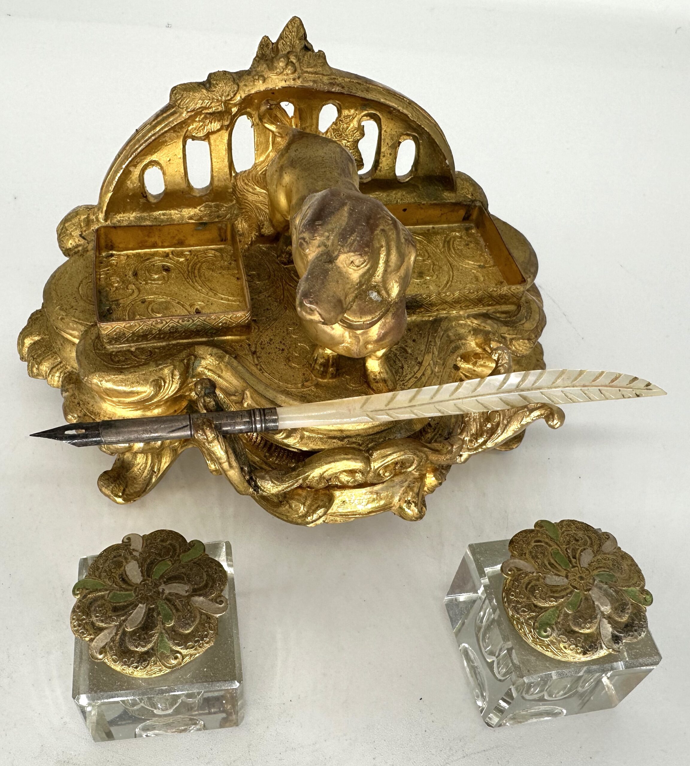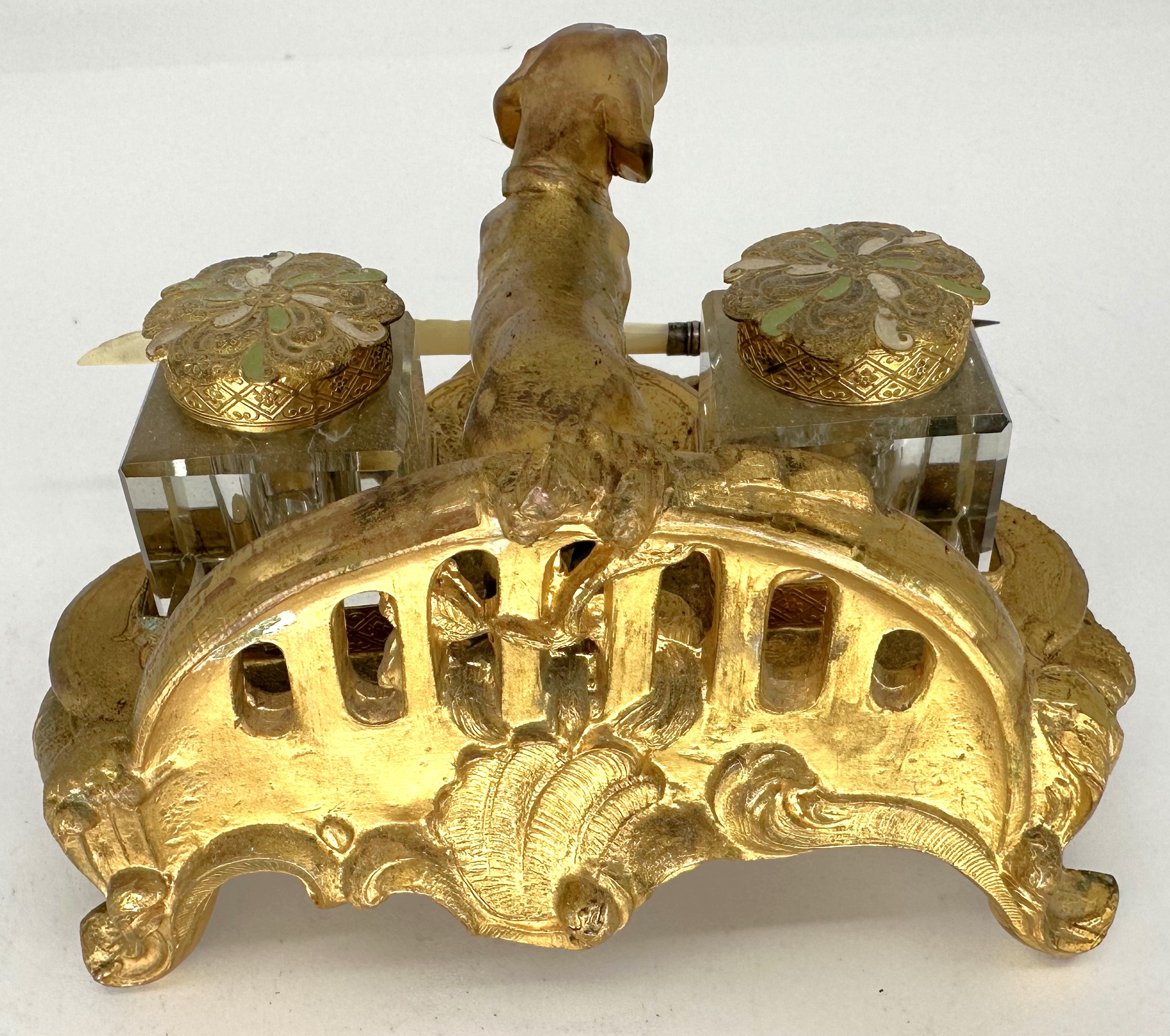 This brass and gilt metal double inkstand features a dachshund standing between two inkwells. The glass inkwells with enameled lids fit perfectly on the base. There is a pen holder in the front.