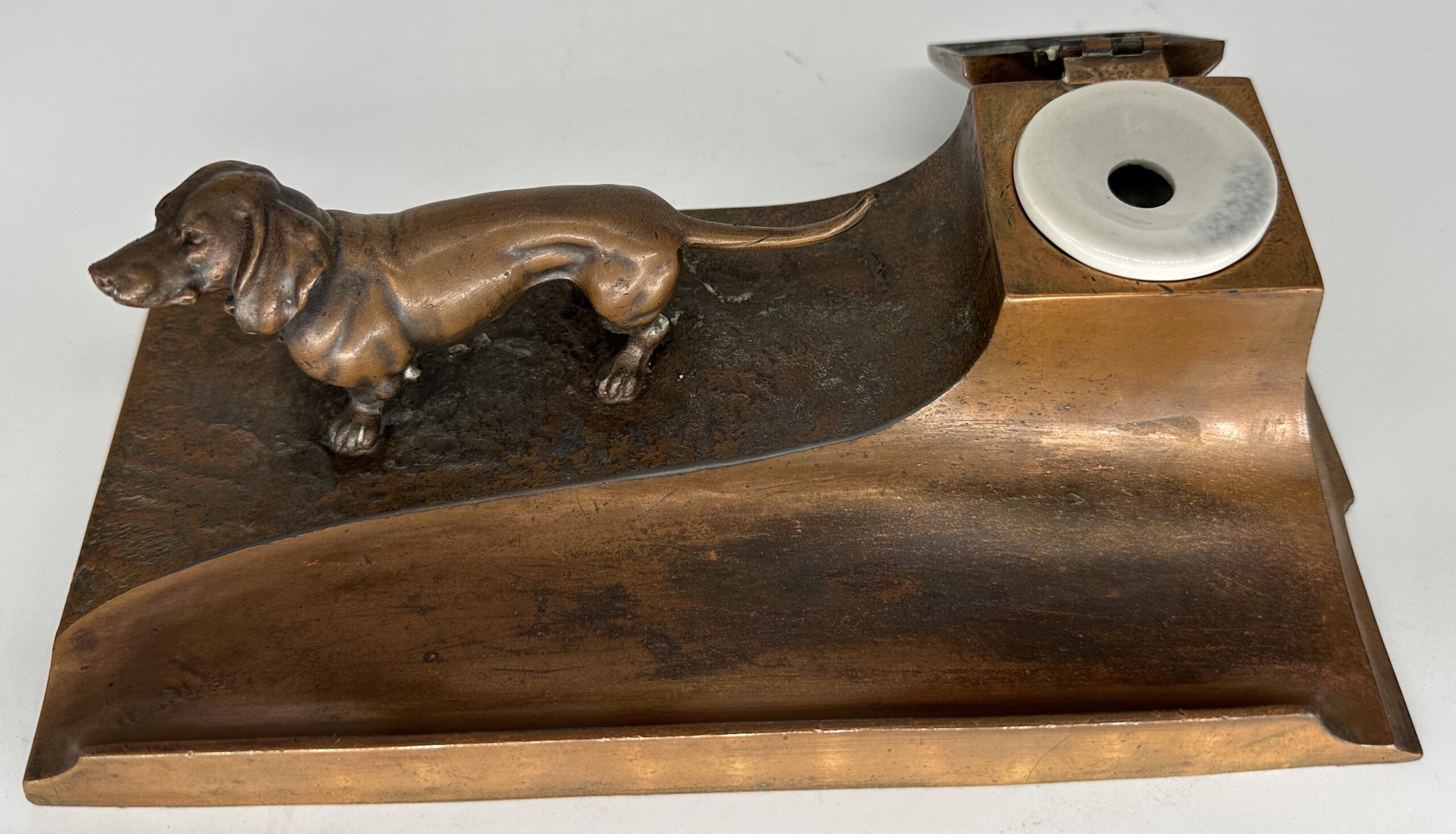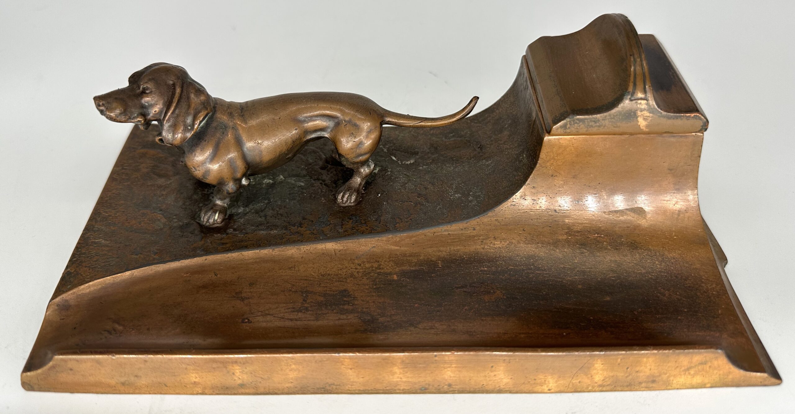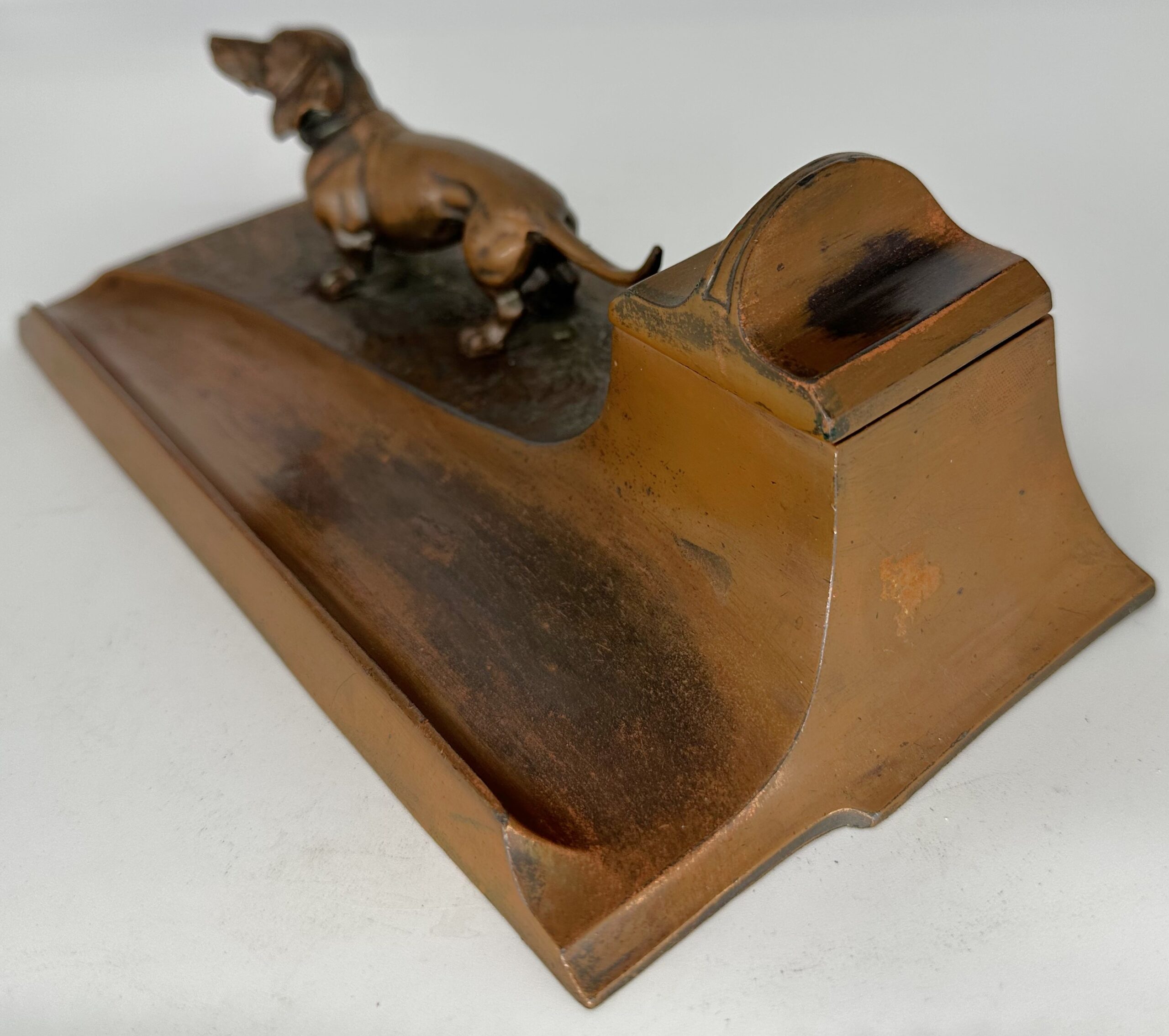 A bronze dachshund stands on an inkstand. Copper finish to pen tray and lid is worn. Numbered on the bottom “1228”