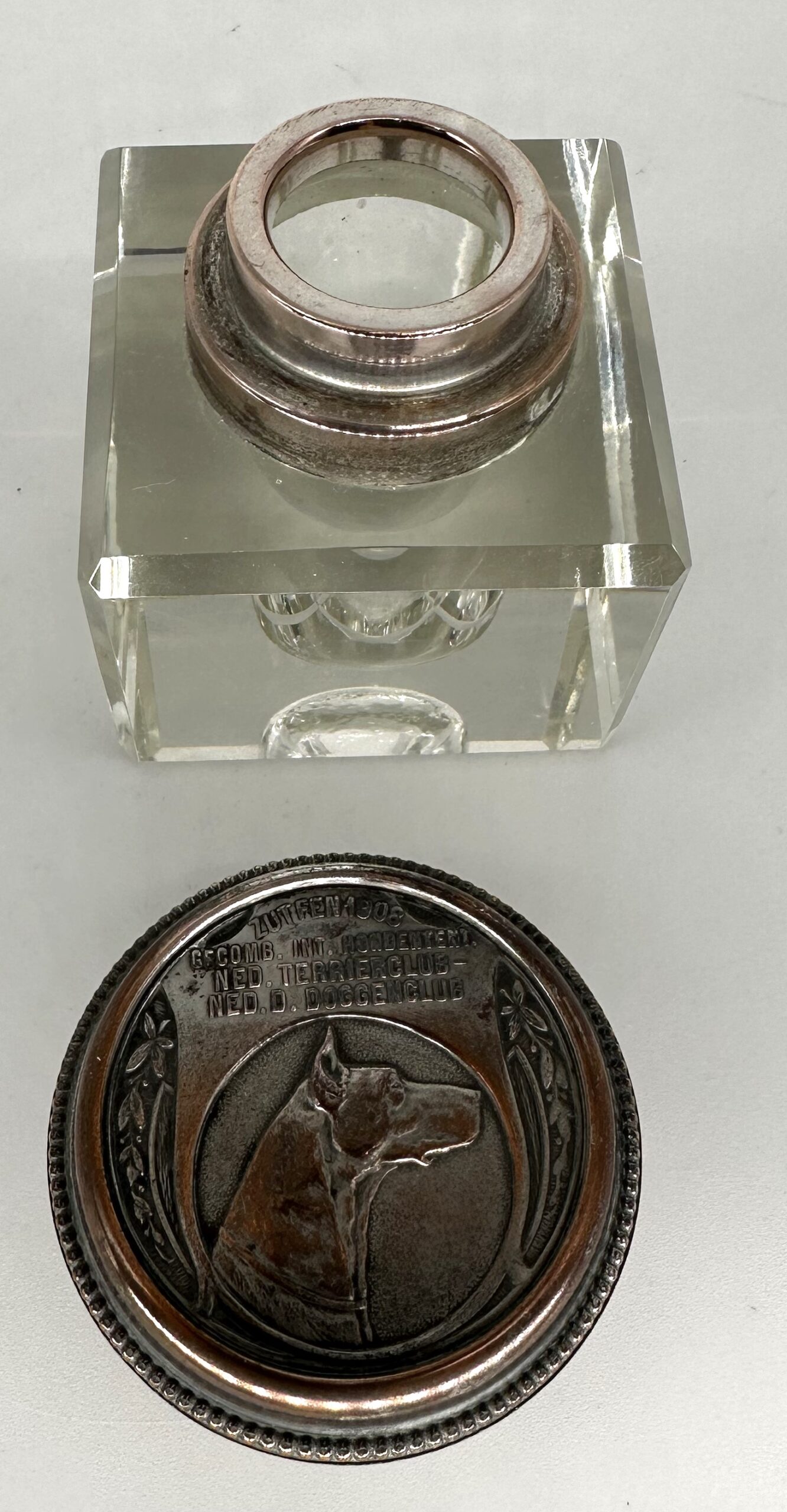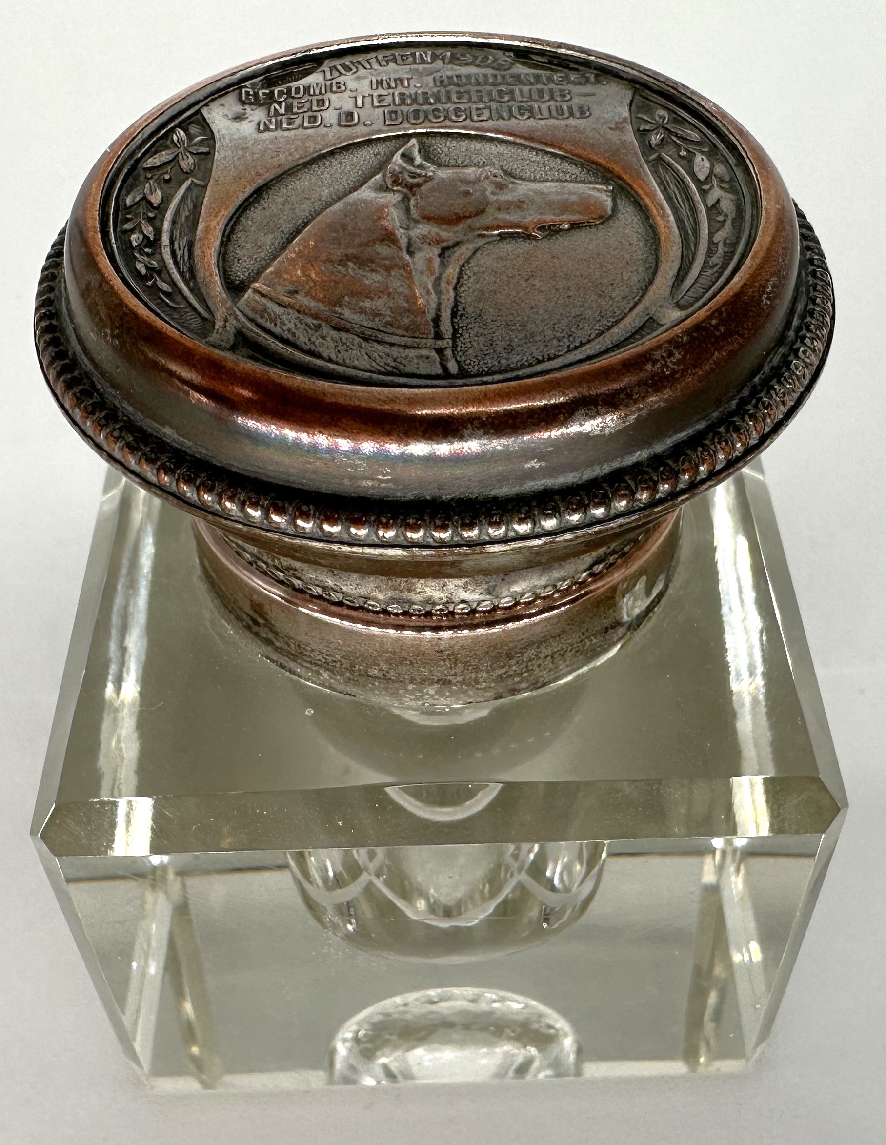 Glass inkwell with pull-off silverplated copper top. The top, with an engraved framed dog and laurel border, is inscribed in Dutch: “ZUTFEN 1908; GECOMB. INT. HONDENTENT; NED TERRIERCLUB; NED. D. DOGGENCLUB”. The silverplate is mostly gone, worn to the copper base metal.