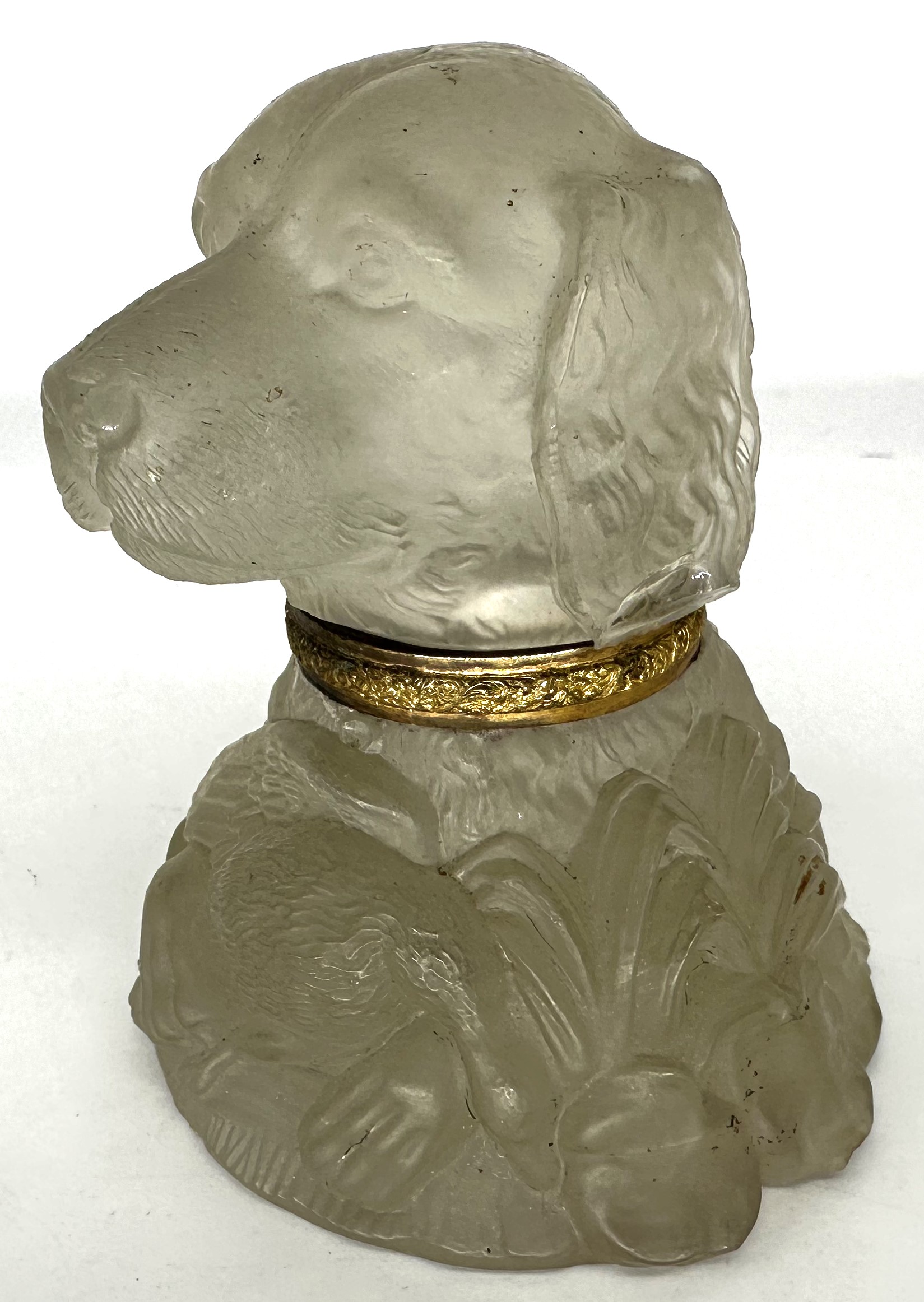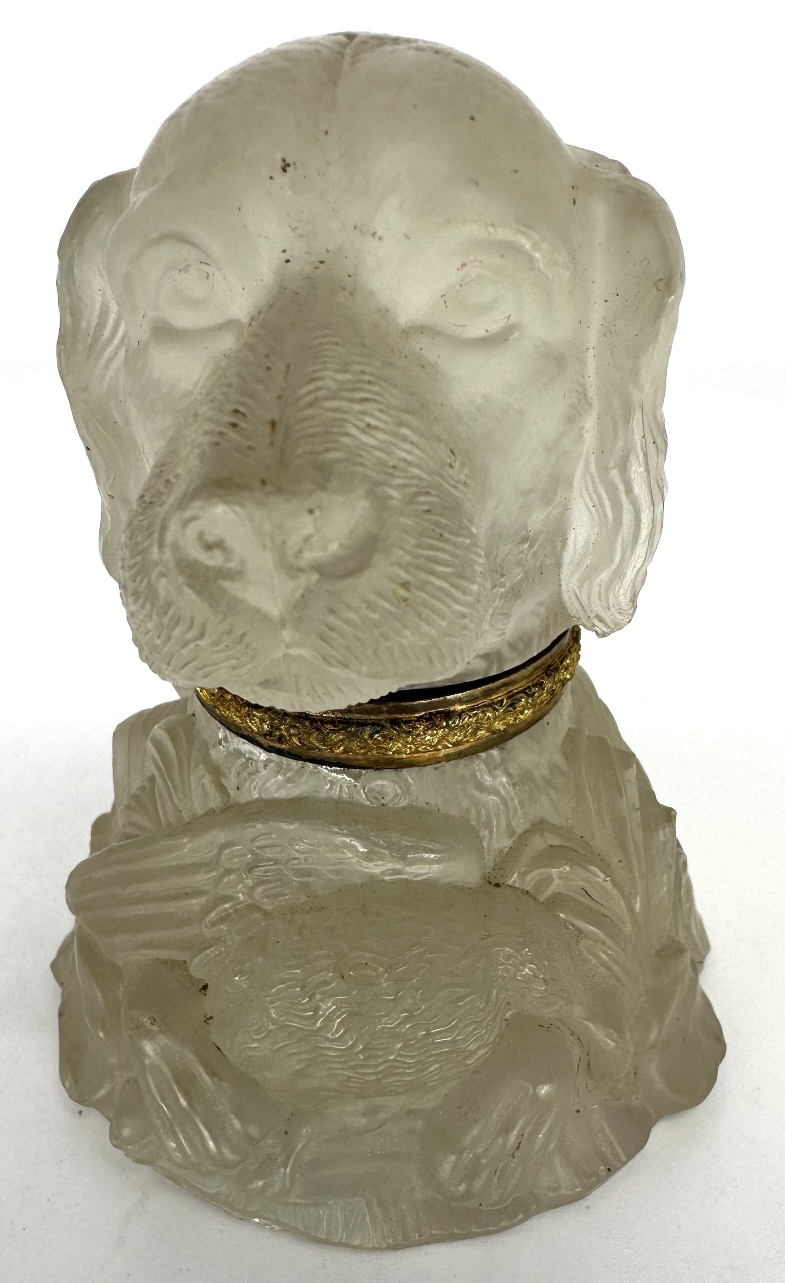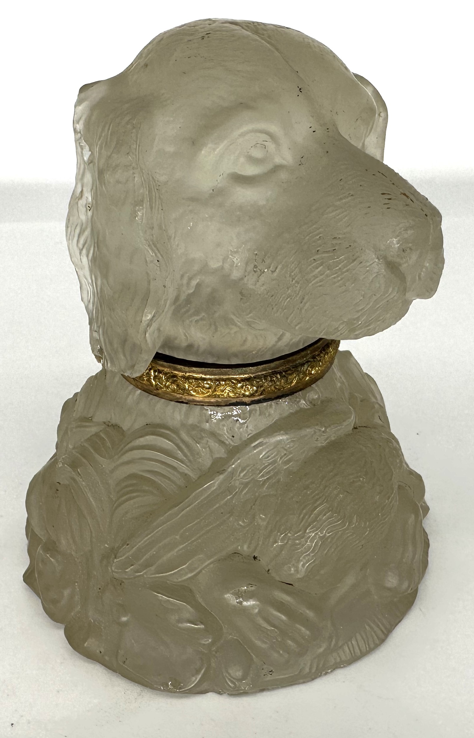 A retriever’s bust with captured fowl between his paws made in satin glass. The gold hinge also serves as a collar.