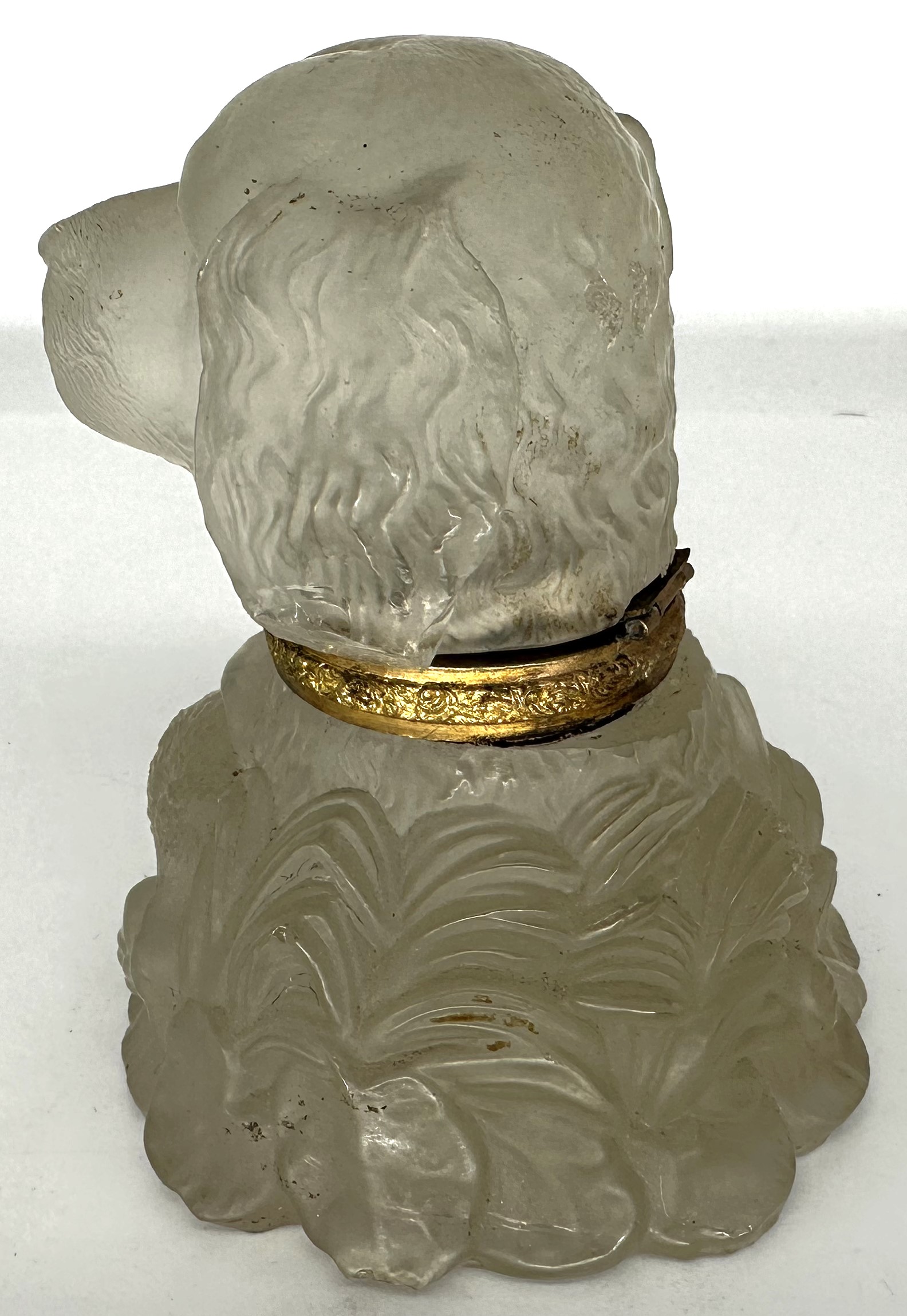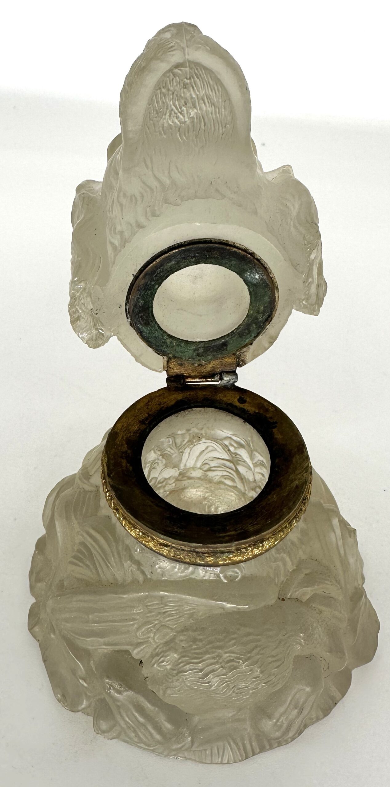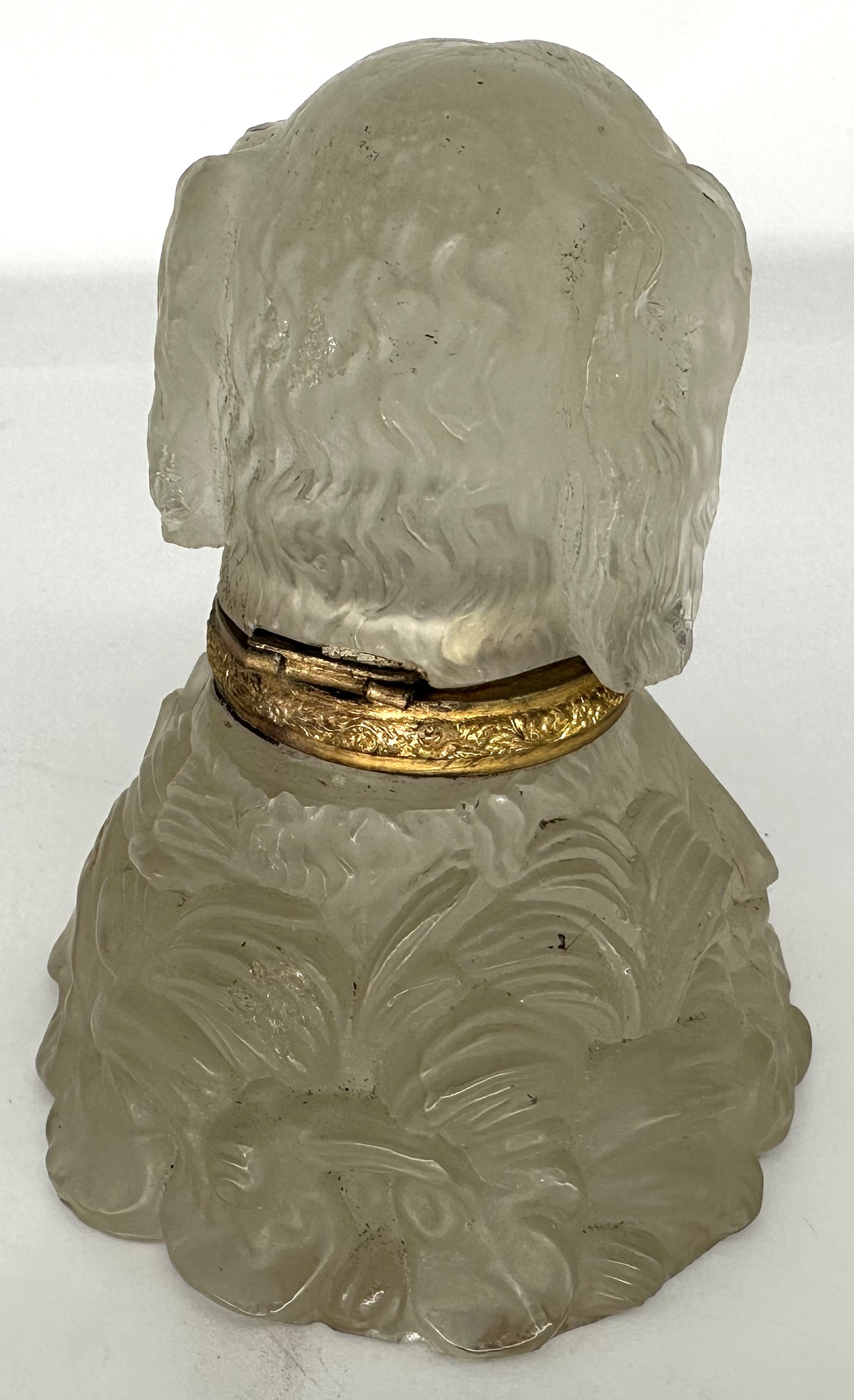 A retriever’s bust with captured fowl between his paws made in satin glass. The gold hinge also serves as a collar.