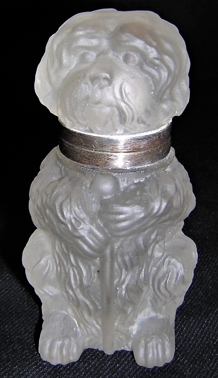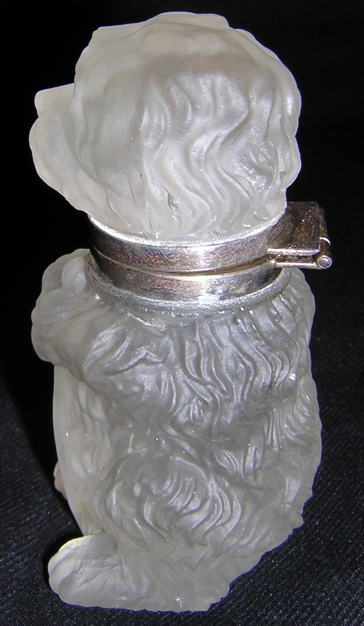 This fine cast frosted glass dog figural inkwell features a Spaniel standing, holding a cane. His head tips back to reveal a reservoir for ink.  The fur, paws and face of the dog are beautifully delineated.
