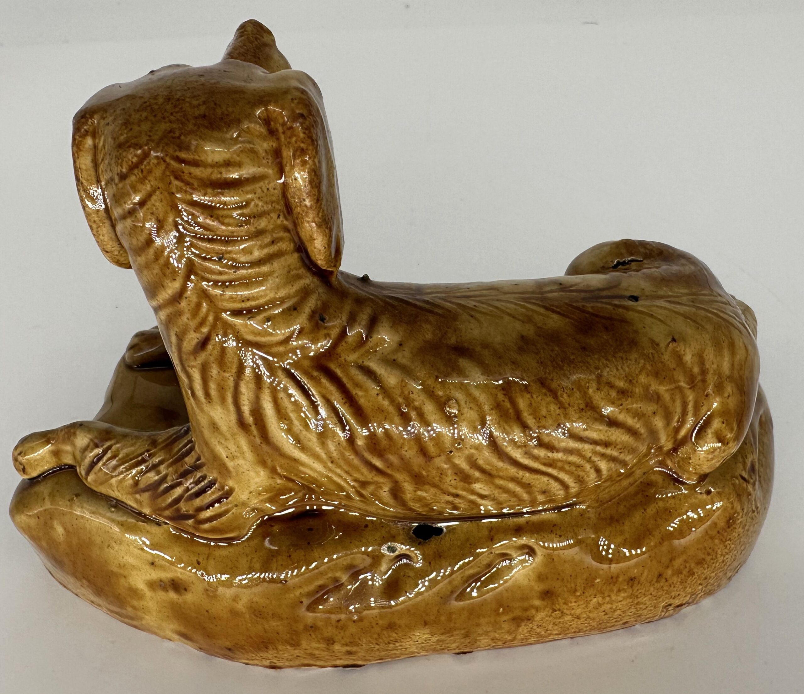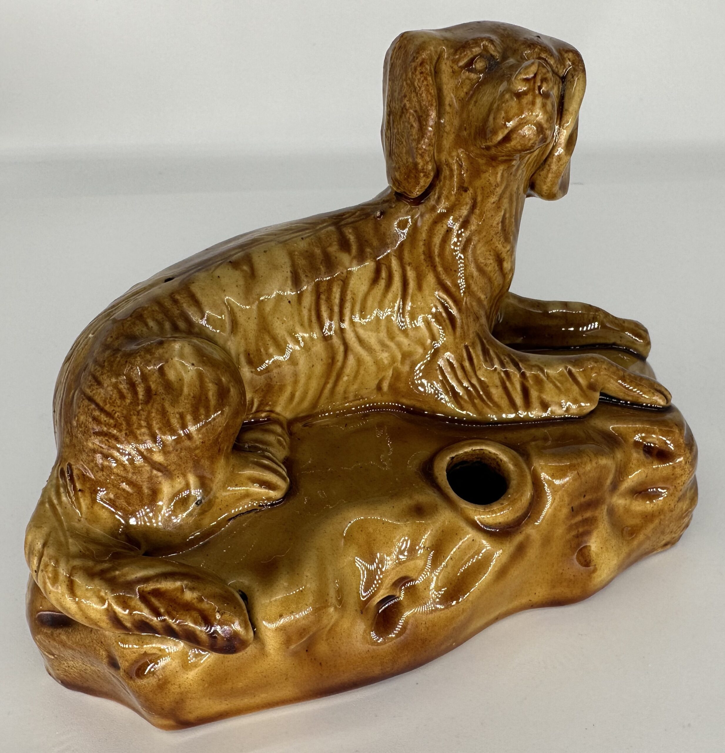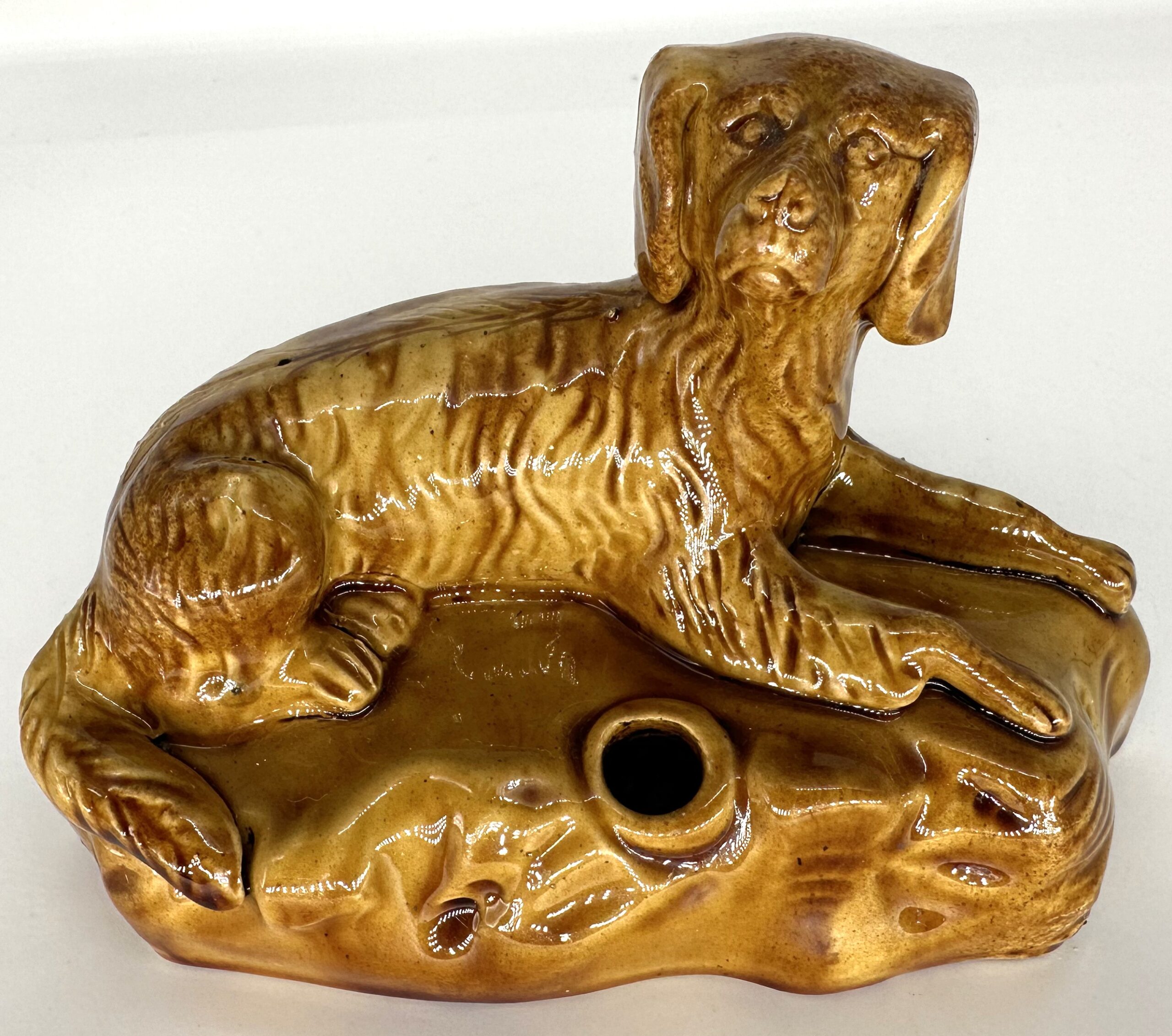 19th Century English treacle glaze recumbent dog on base inkwell.