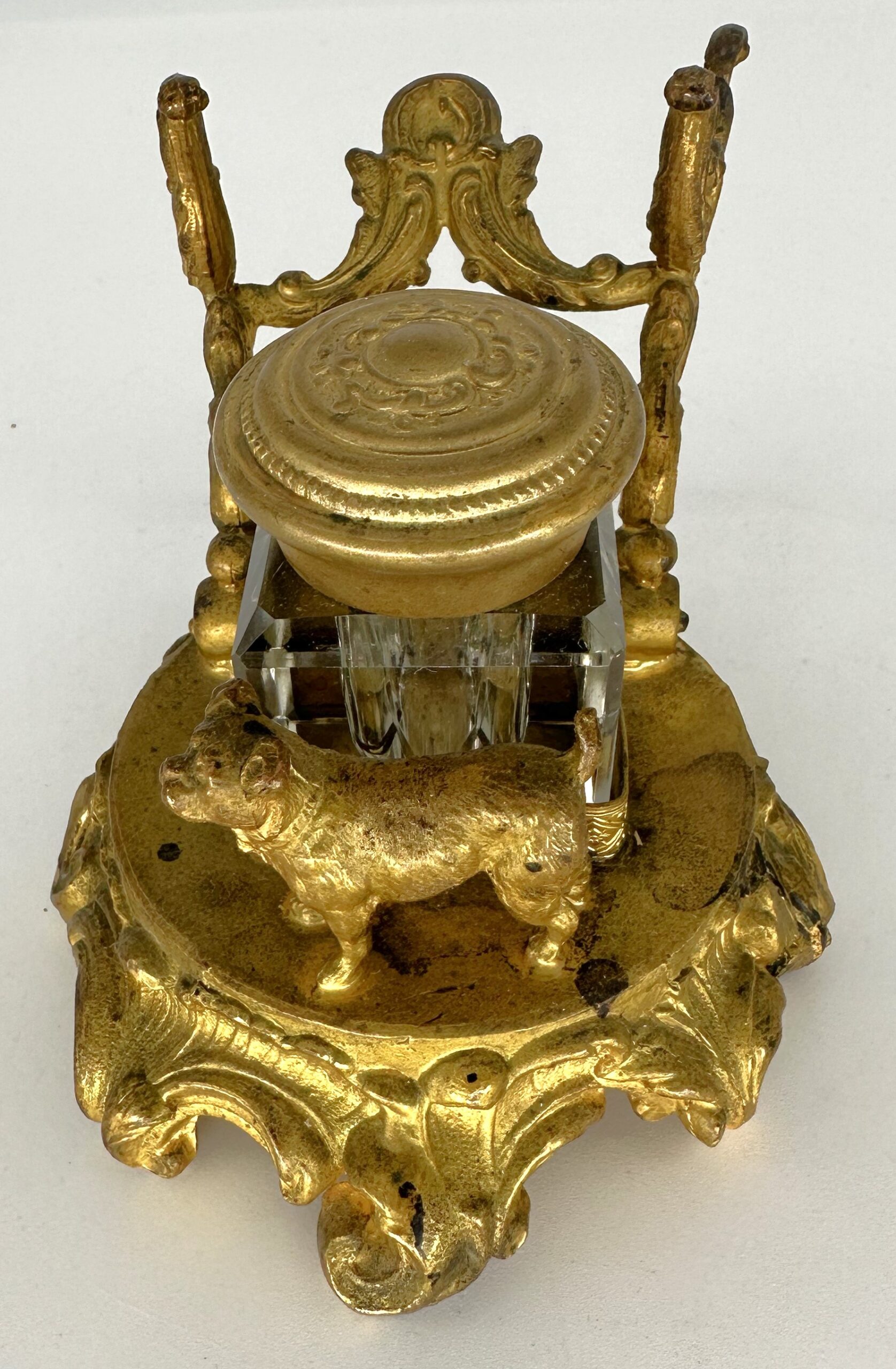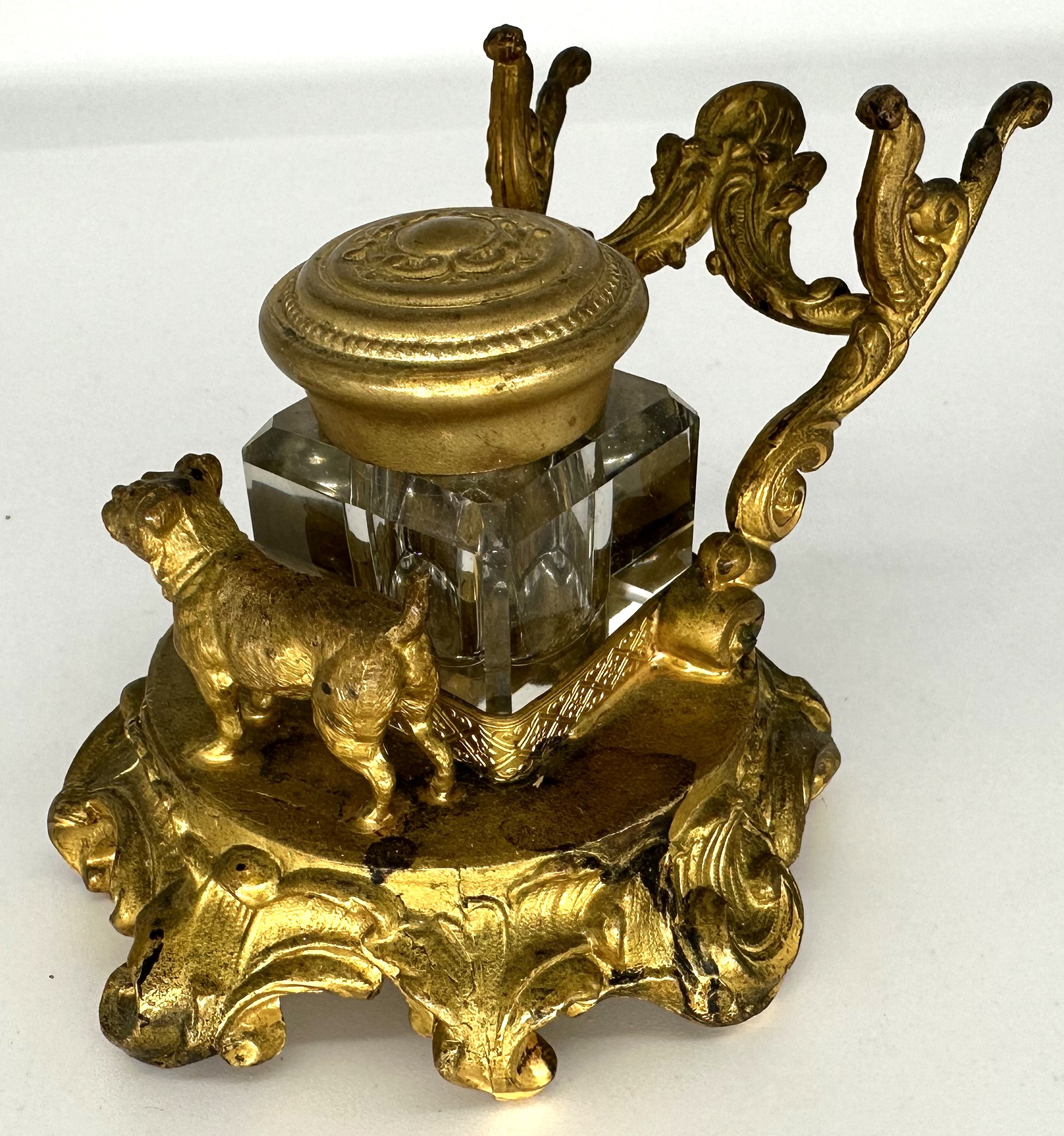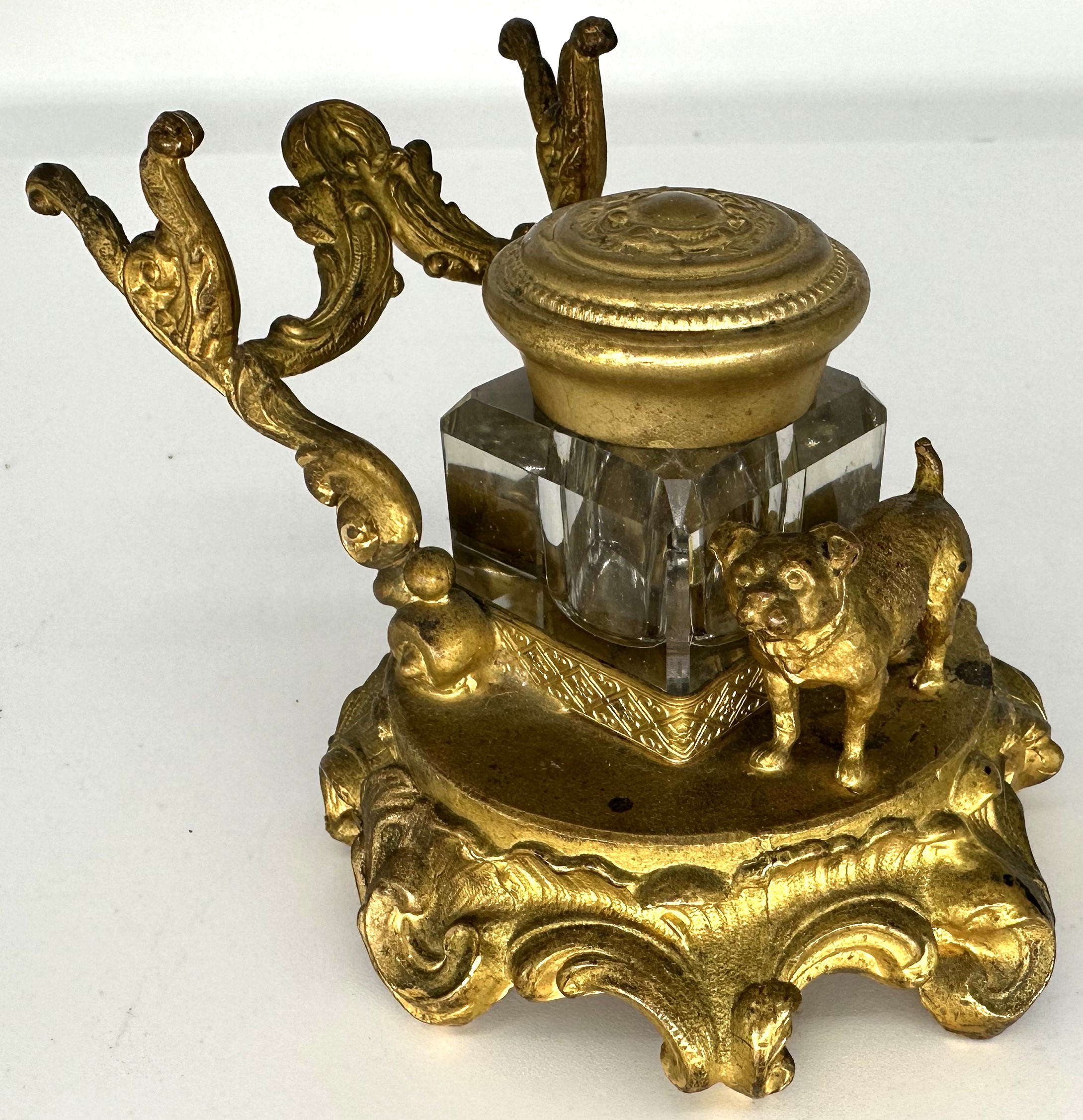 The full figure of a small dog (pug, French bulldog) stands in front of the inkwell. The glass inkwell has a loose brass lid and is held in a frame. An ornate pen holder completes the gilded brass inkstand with a circular base.