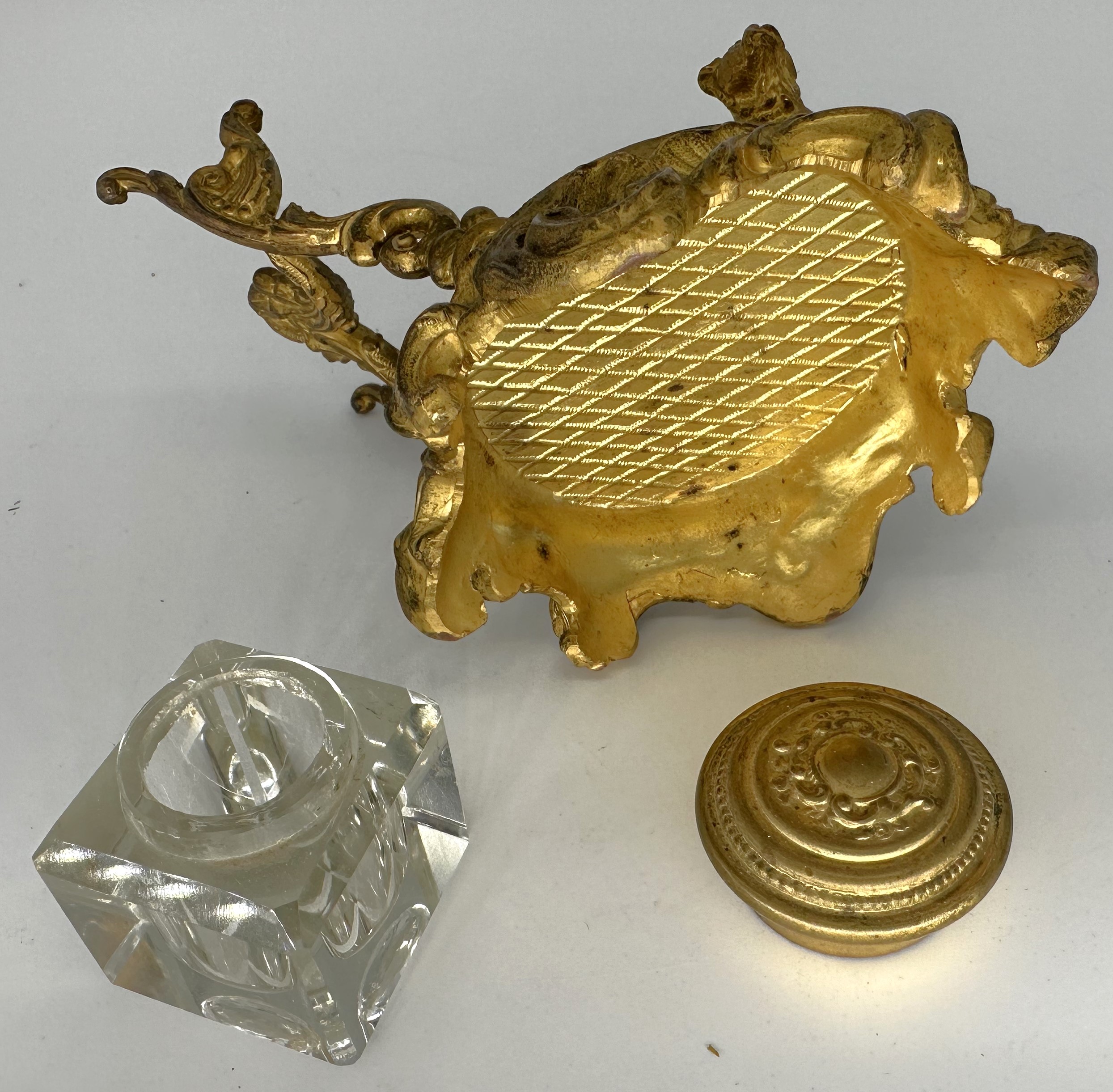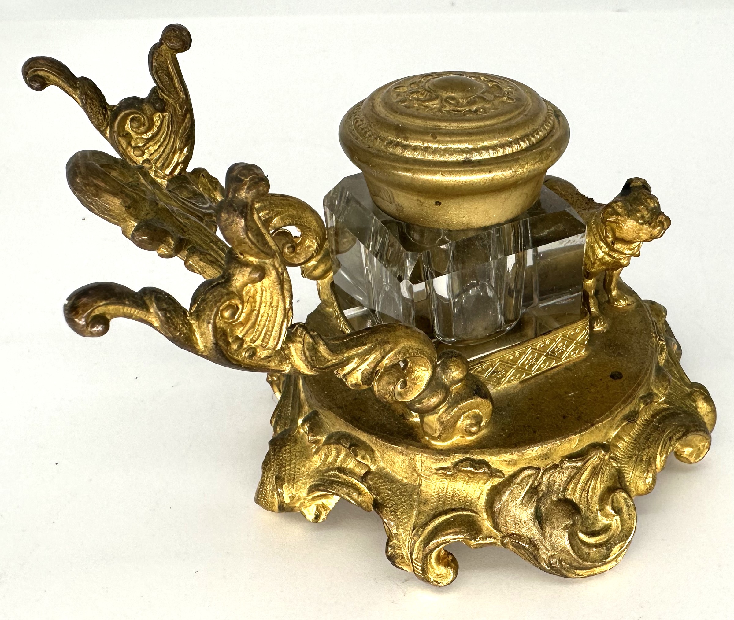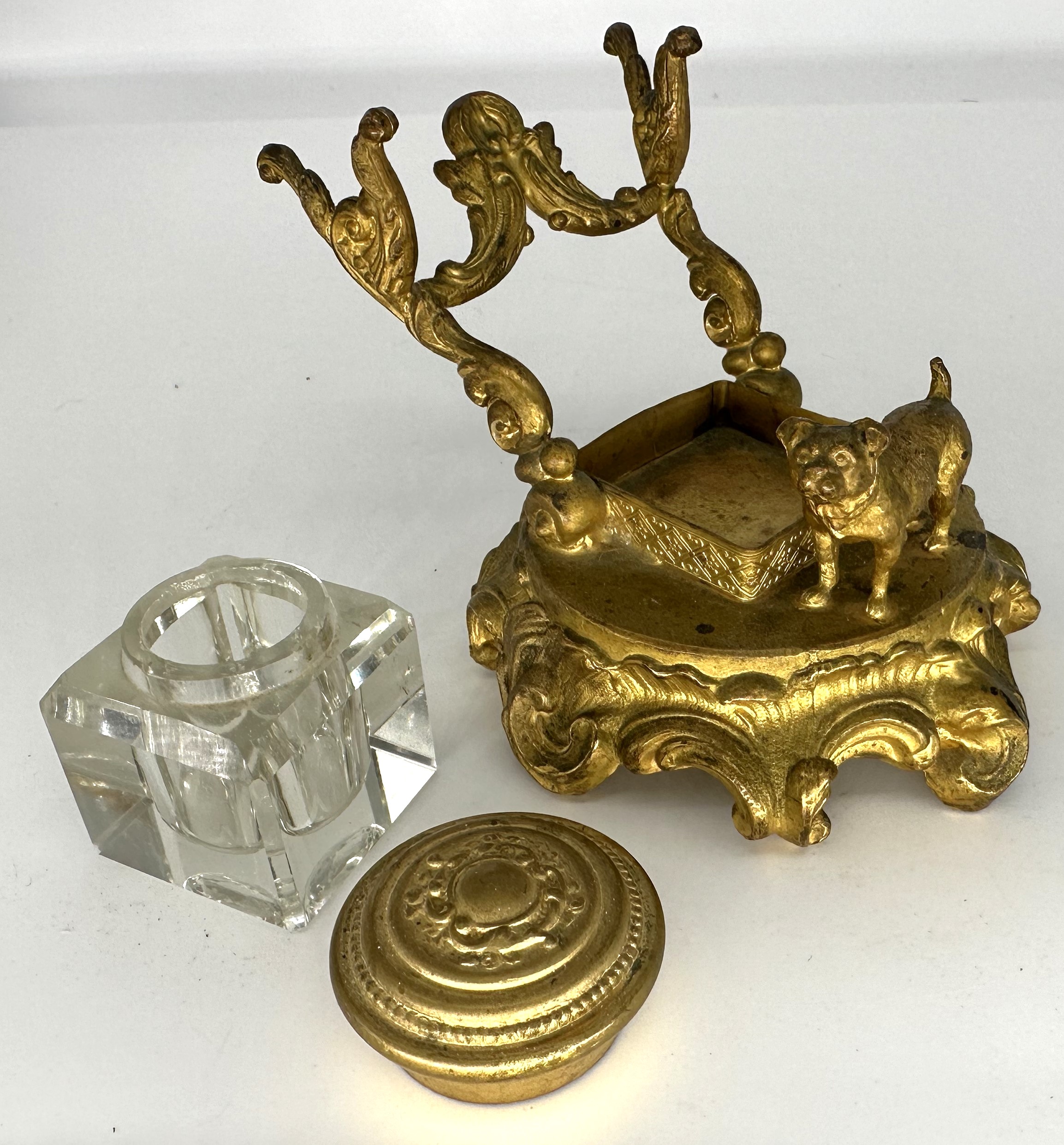 The full figure of a small dog (pug, French bulldog) stands in front of the inkwell. The glass inkwell has a loose brass lid and is held in a frame. An ornate pen holder completes the gilded brass inkstand with a circular base.