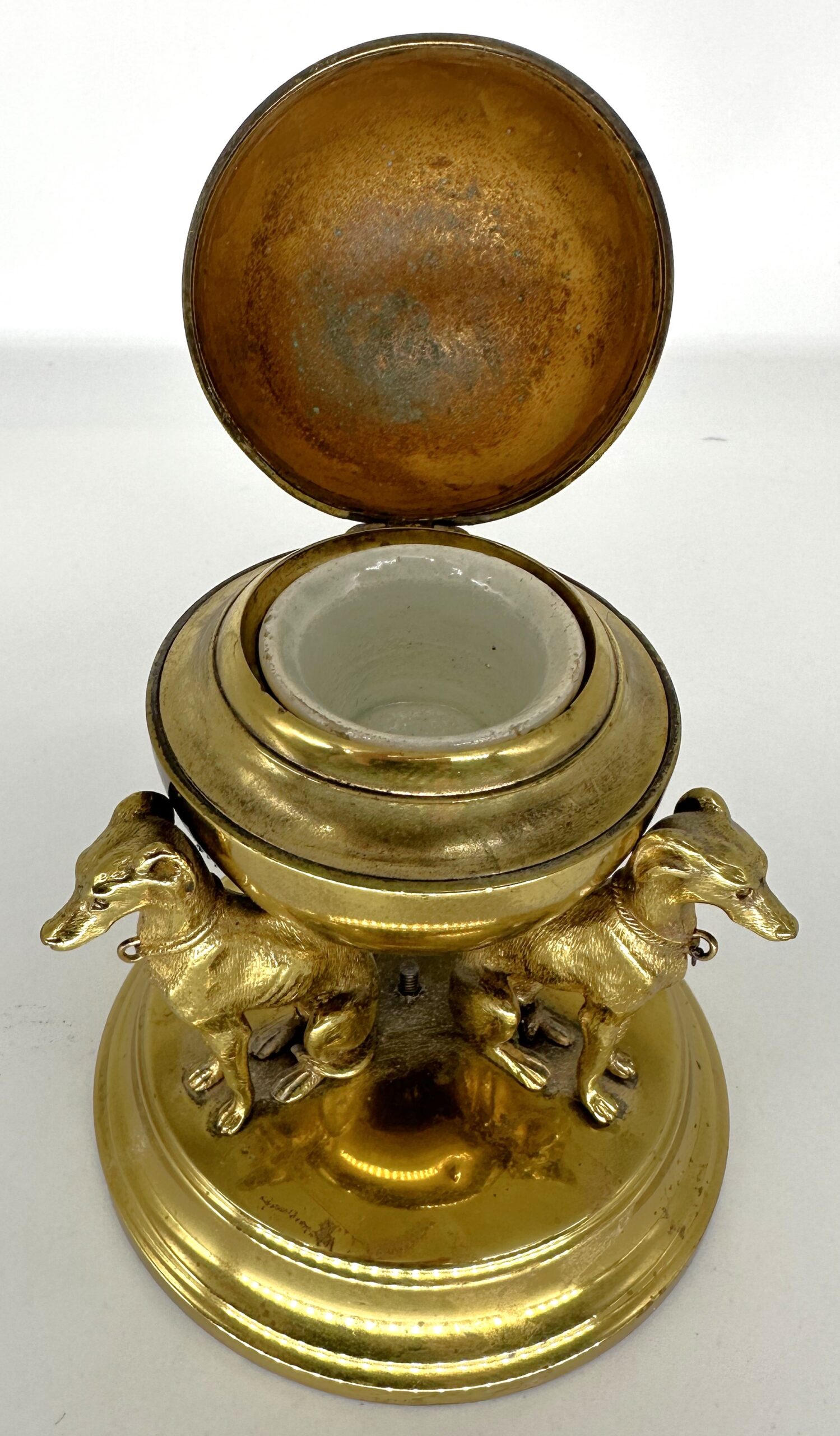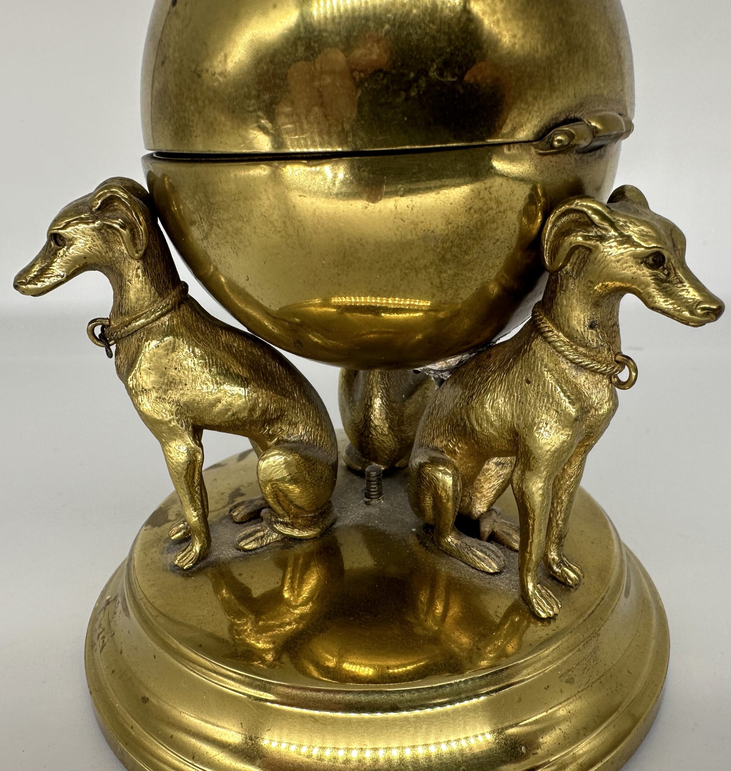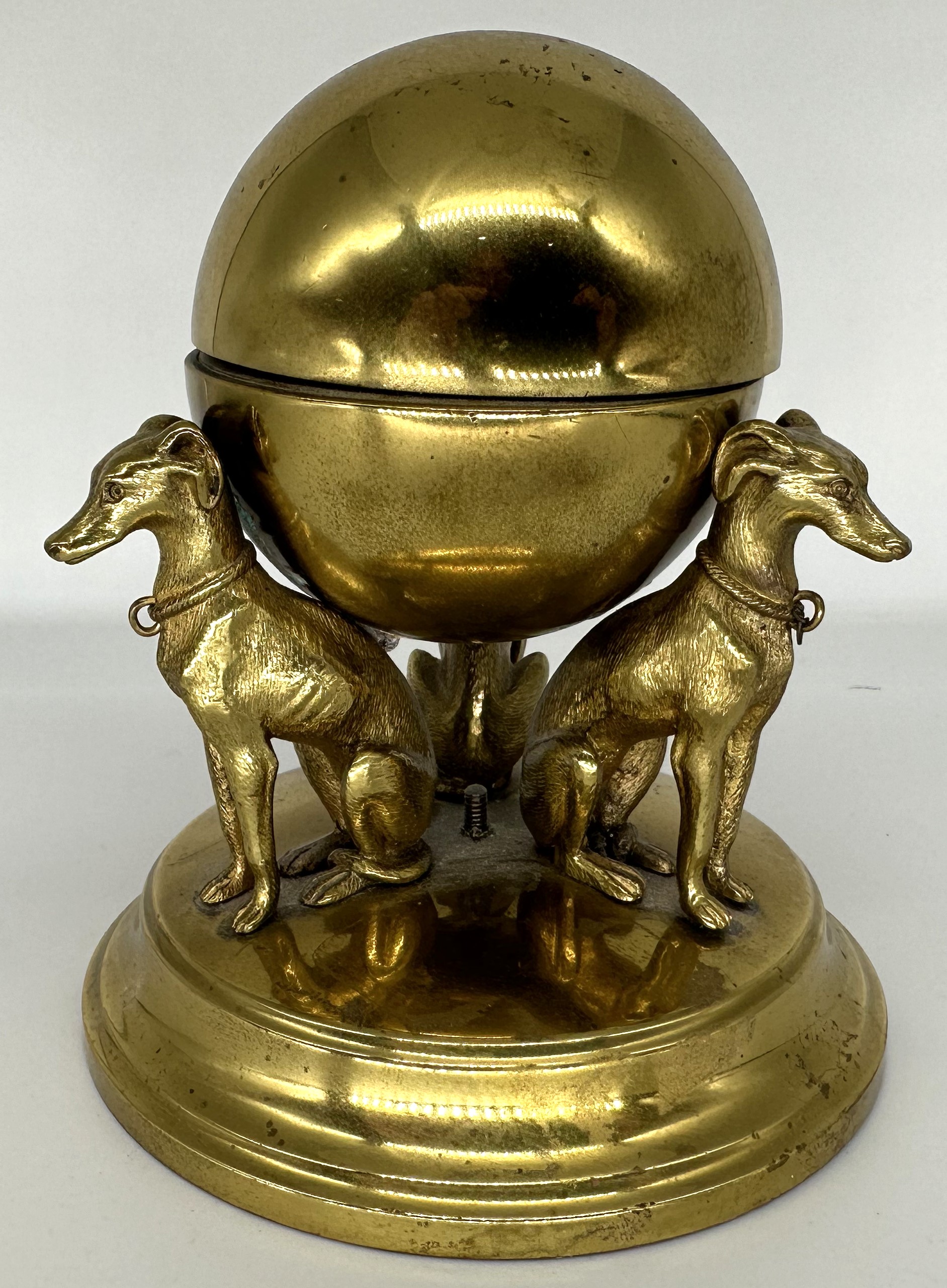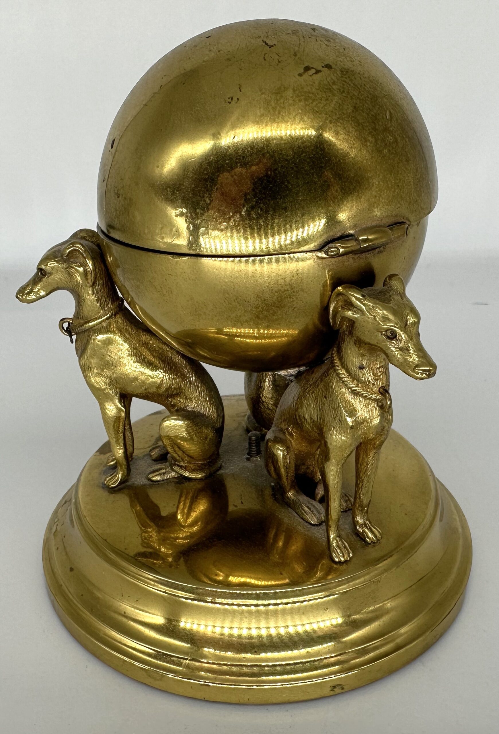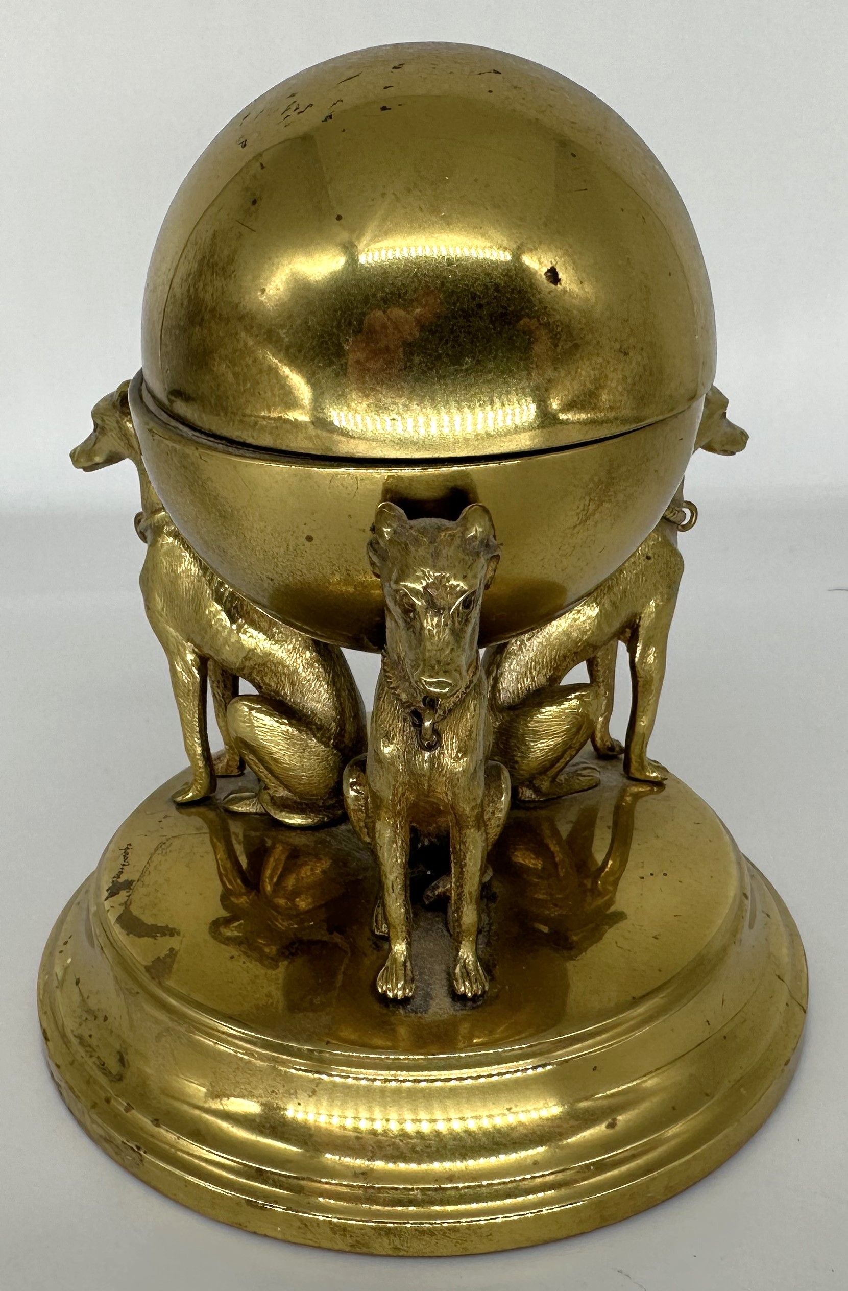Antique brass inkwell features a sphere / globe mounted to three nicely detailed greyhounds (or whippets) with ringed collars. The hinged sphere opens to access the inkwell.