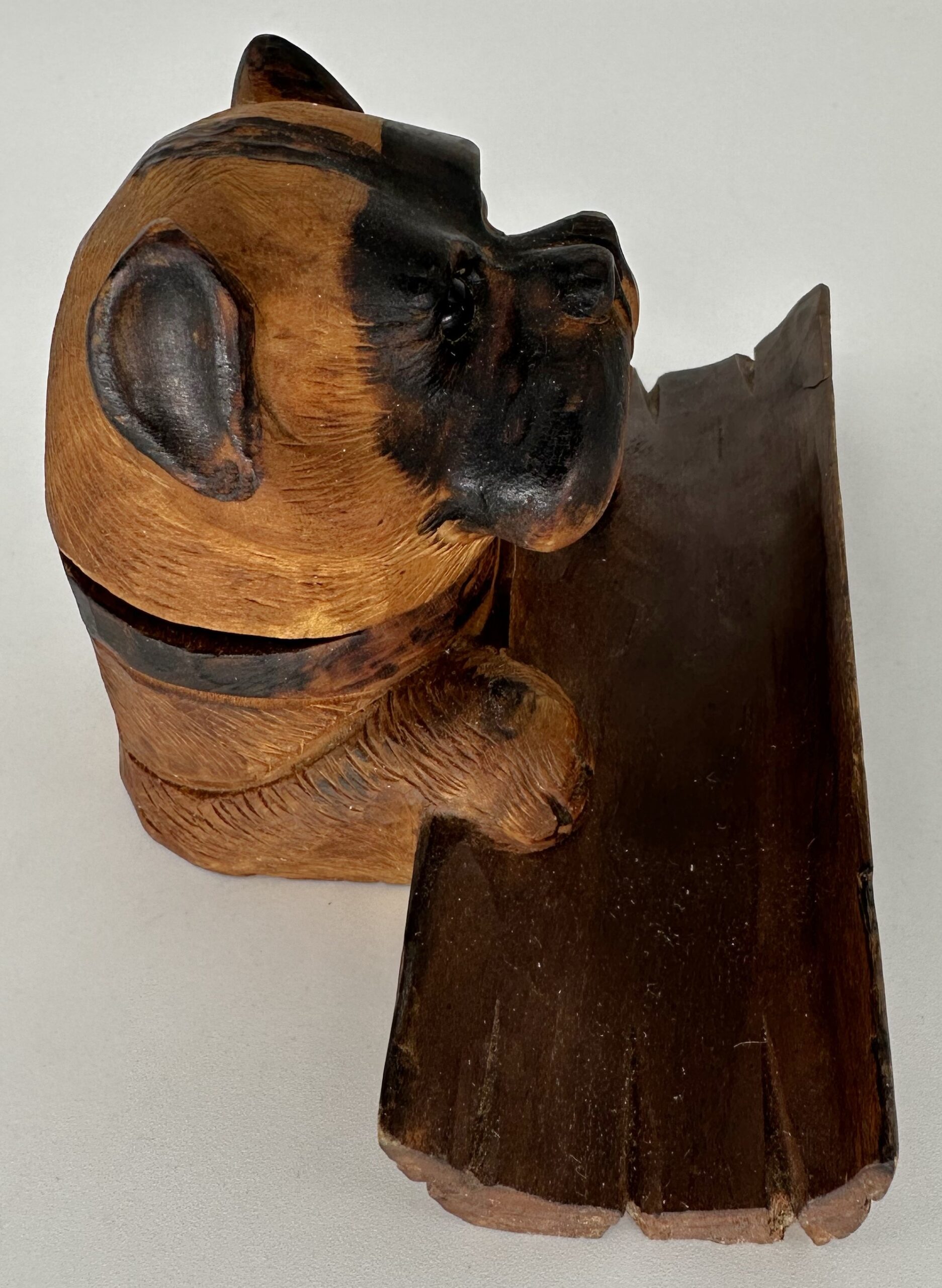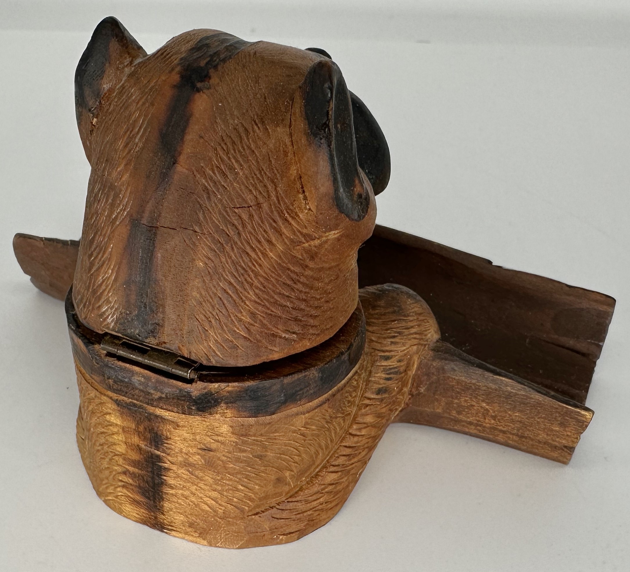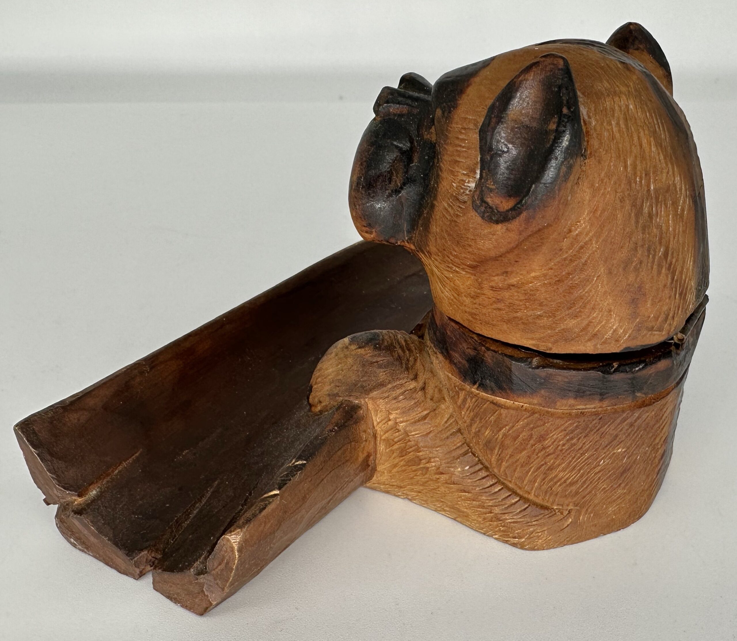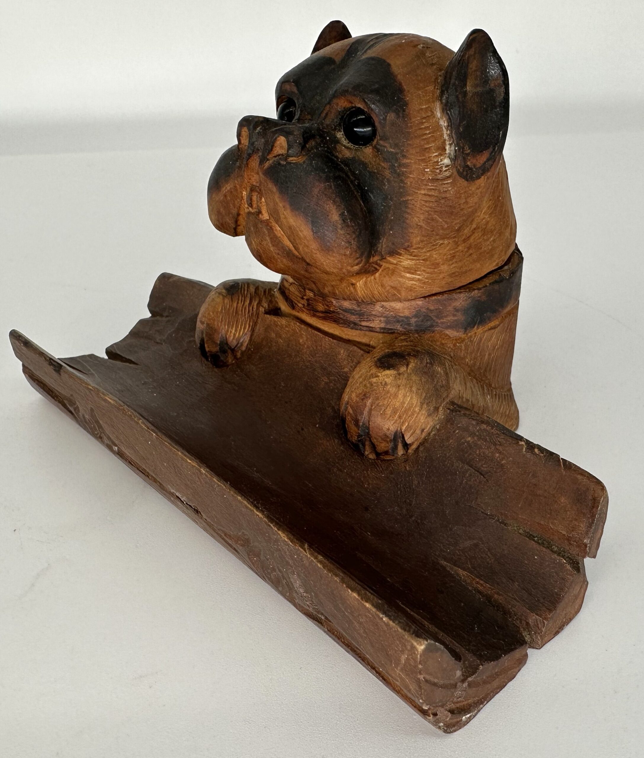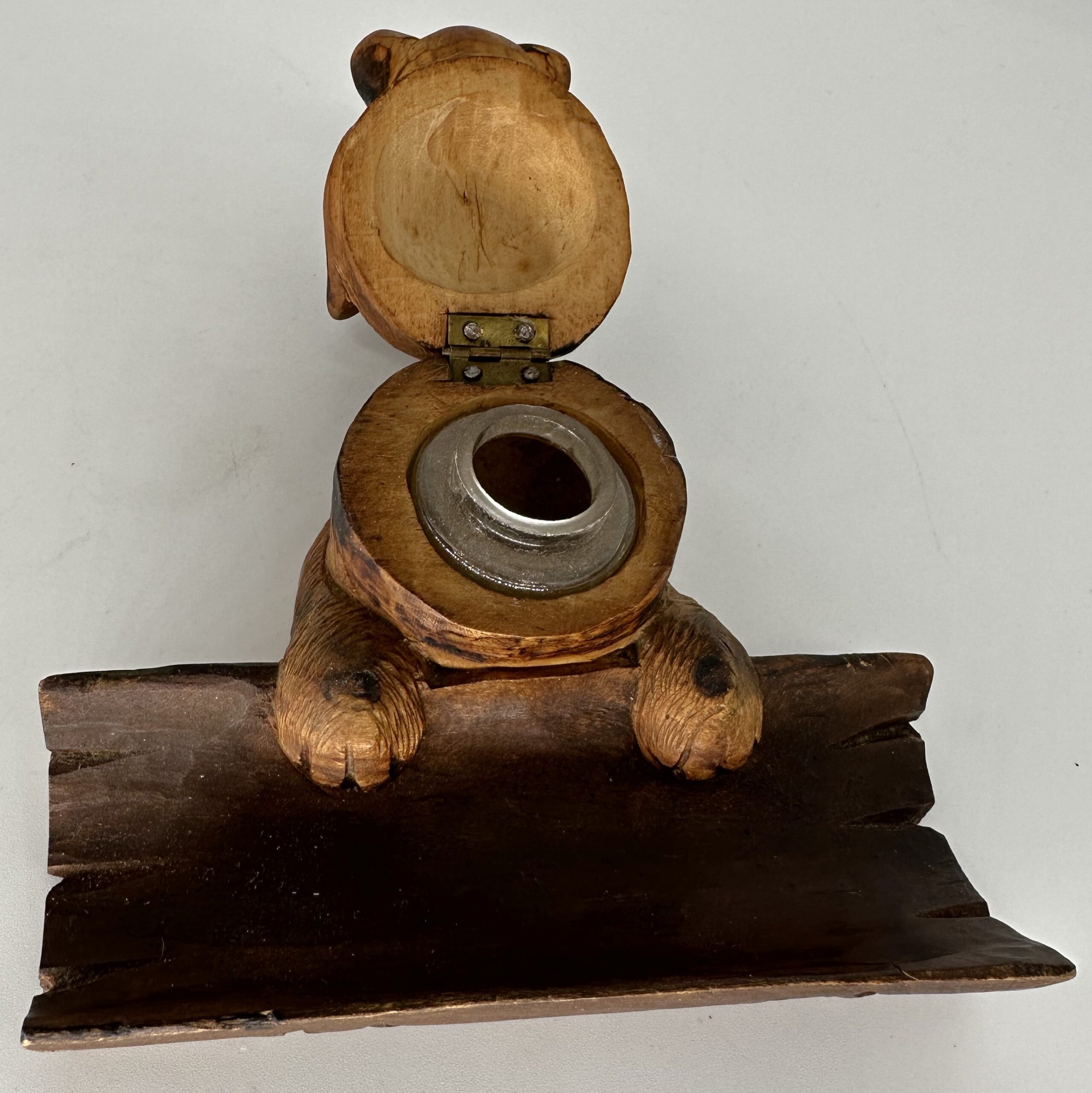 Black Forest hand-carved dog (Boxer) with glass eyes and expressive face. The dog’s paws grasp a hollowed-out tree half, which serves as a pen tray. The hinged head lifts to access the ink bottle.