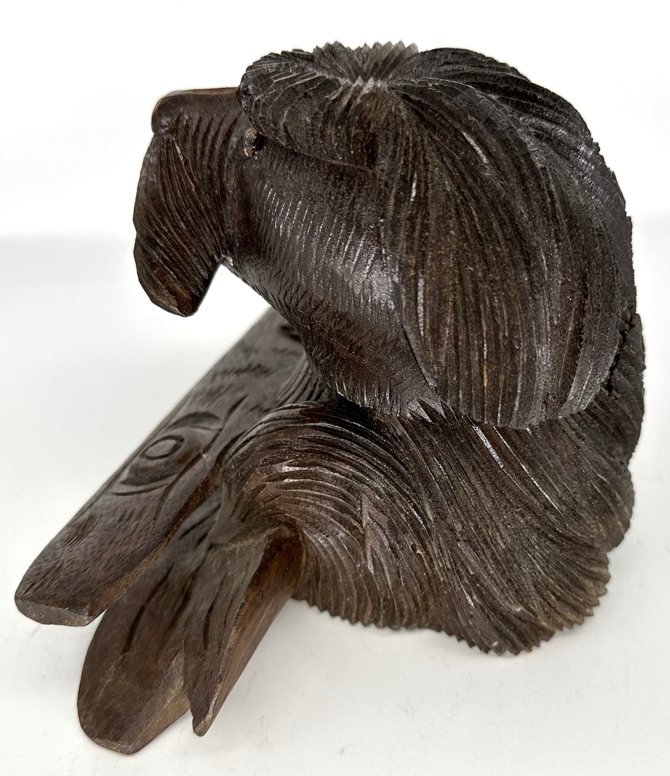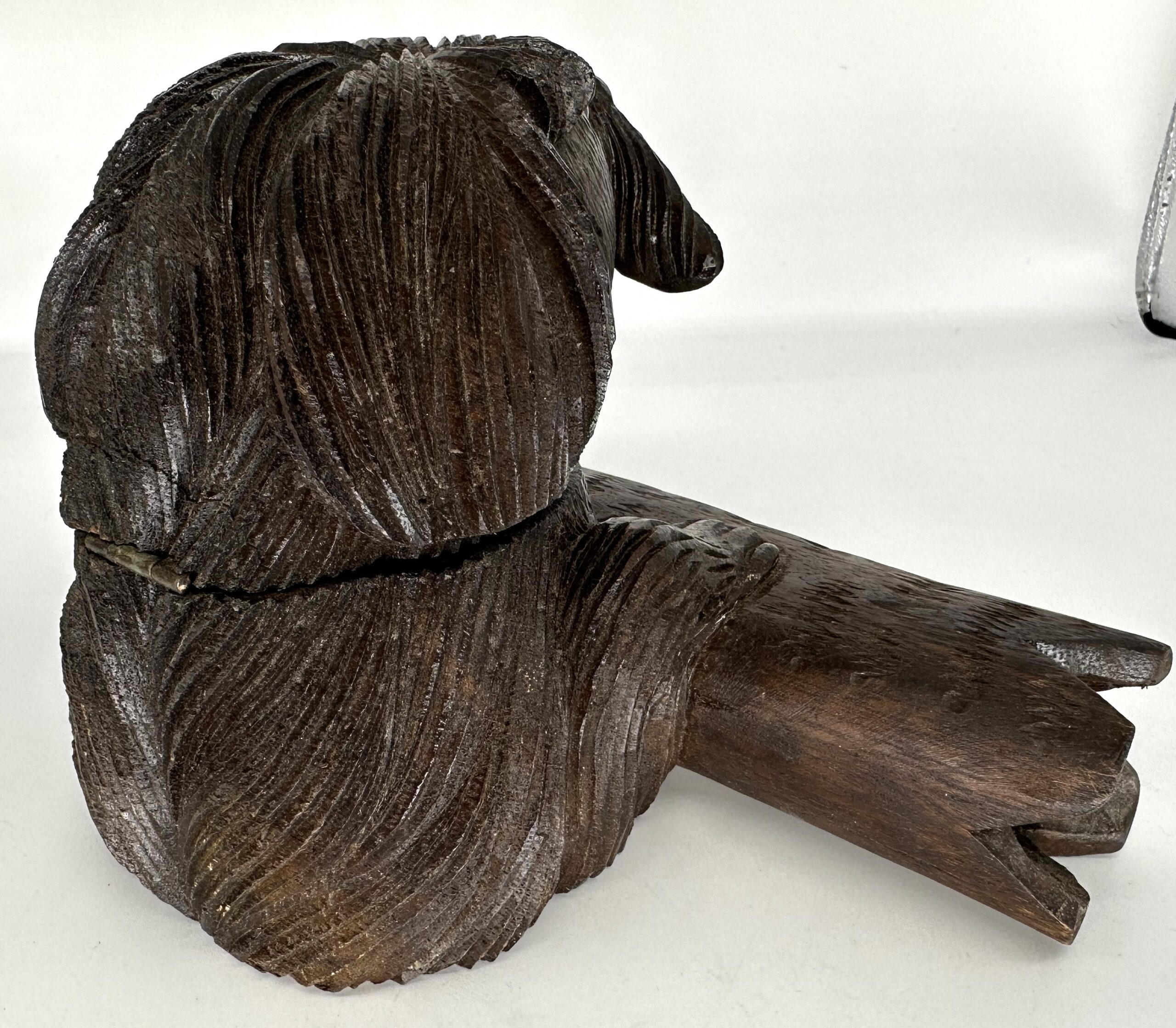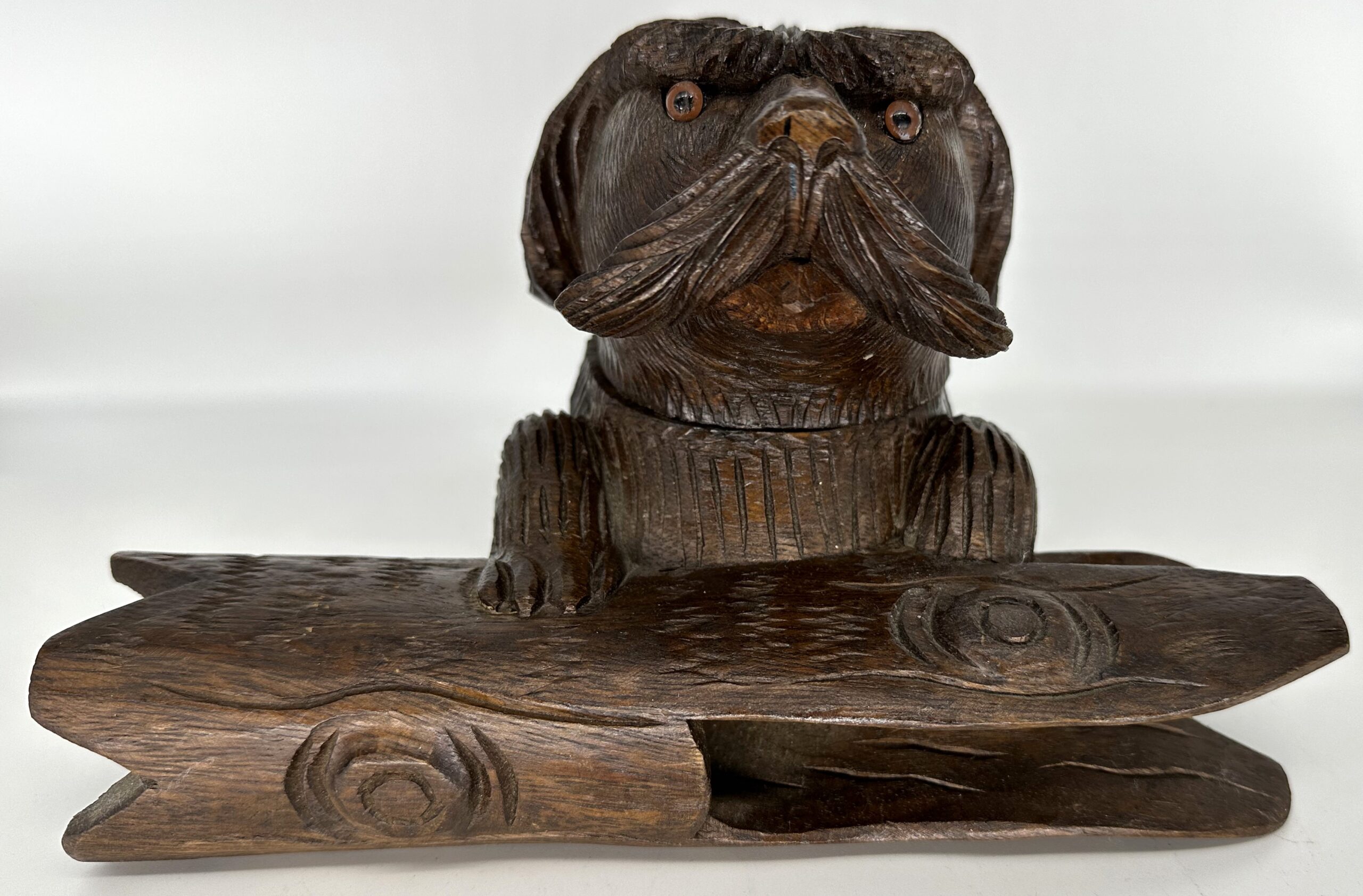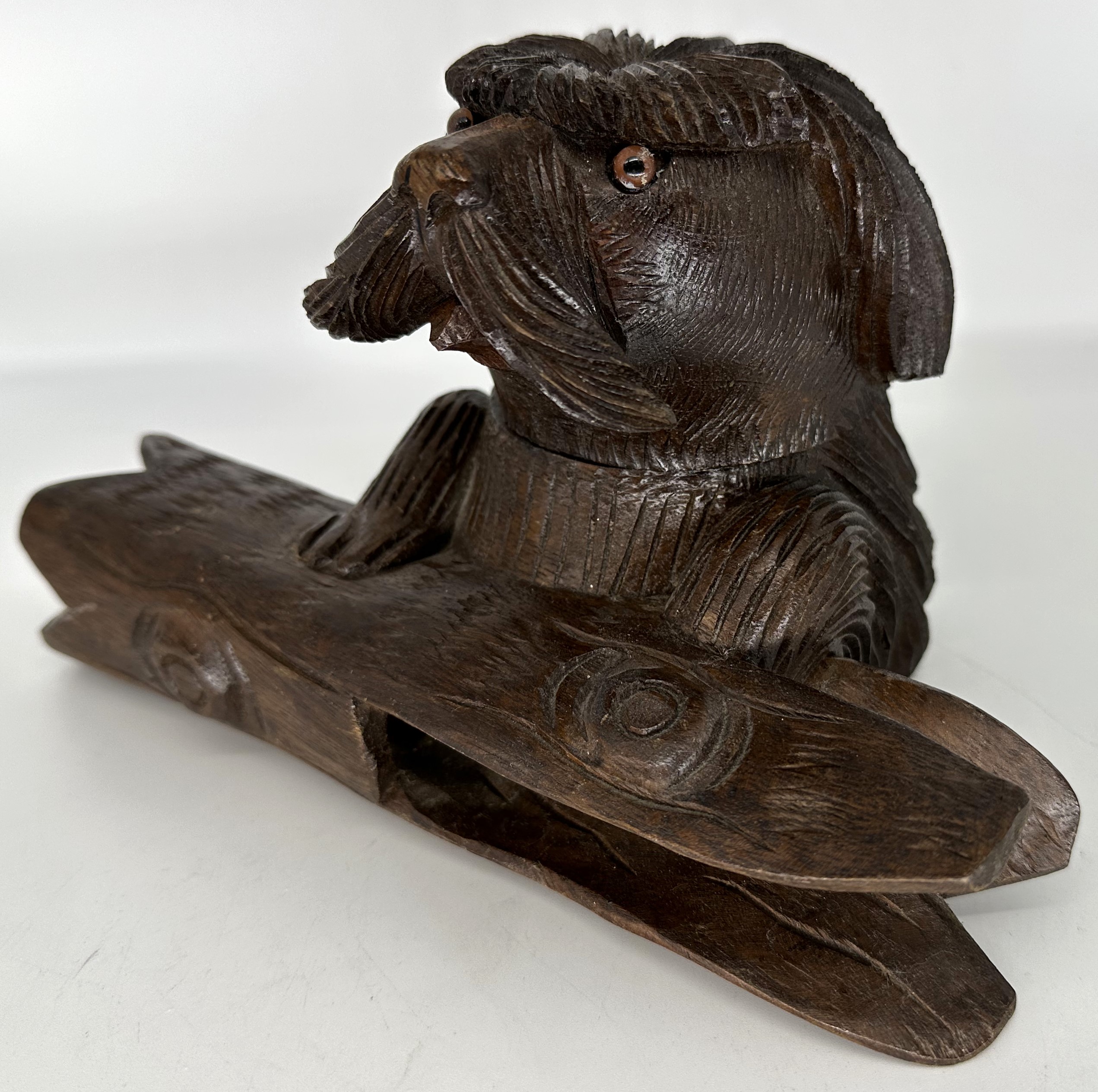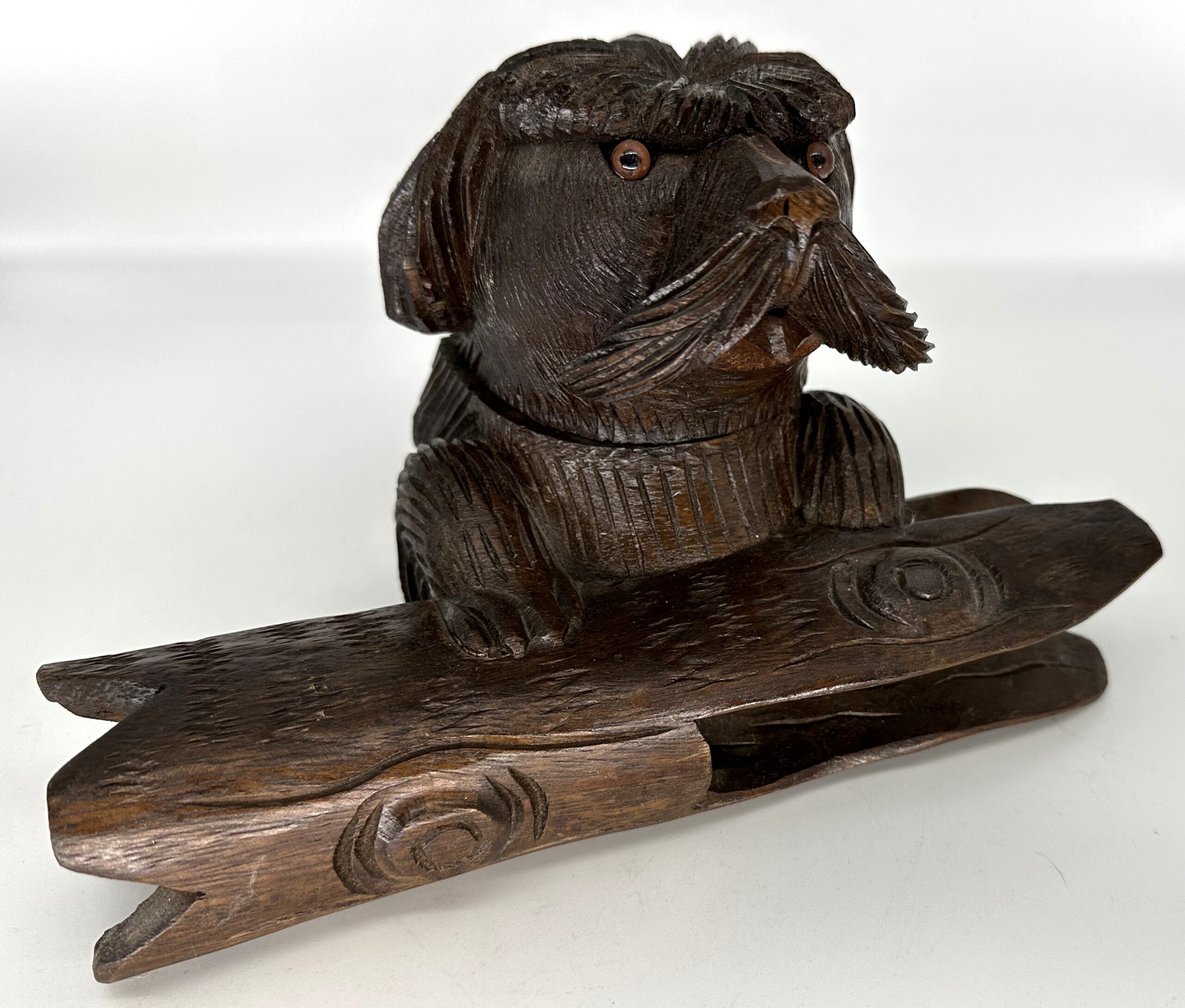Carved Black Forest dog, with a huge mustache and glass eyes, has his paws resting on (and in) a hollowed-out log (pen rest). His head is hinged and opens to access the inkwell.