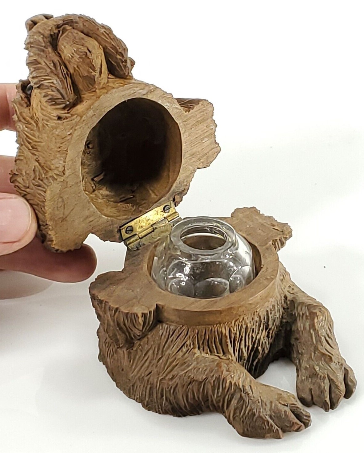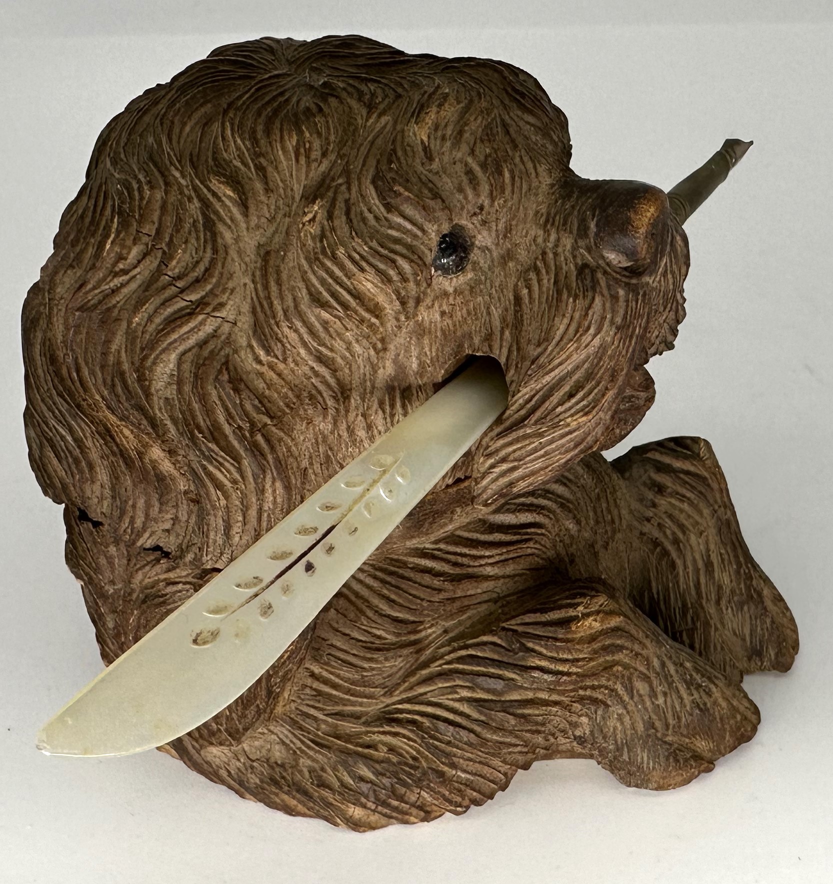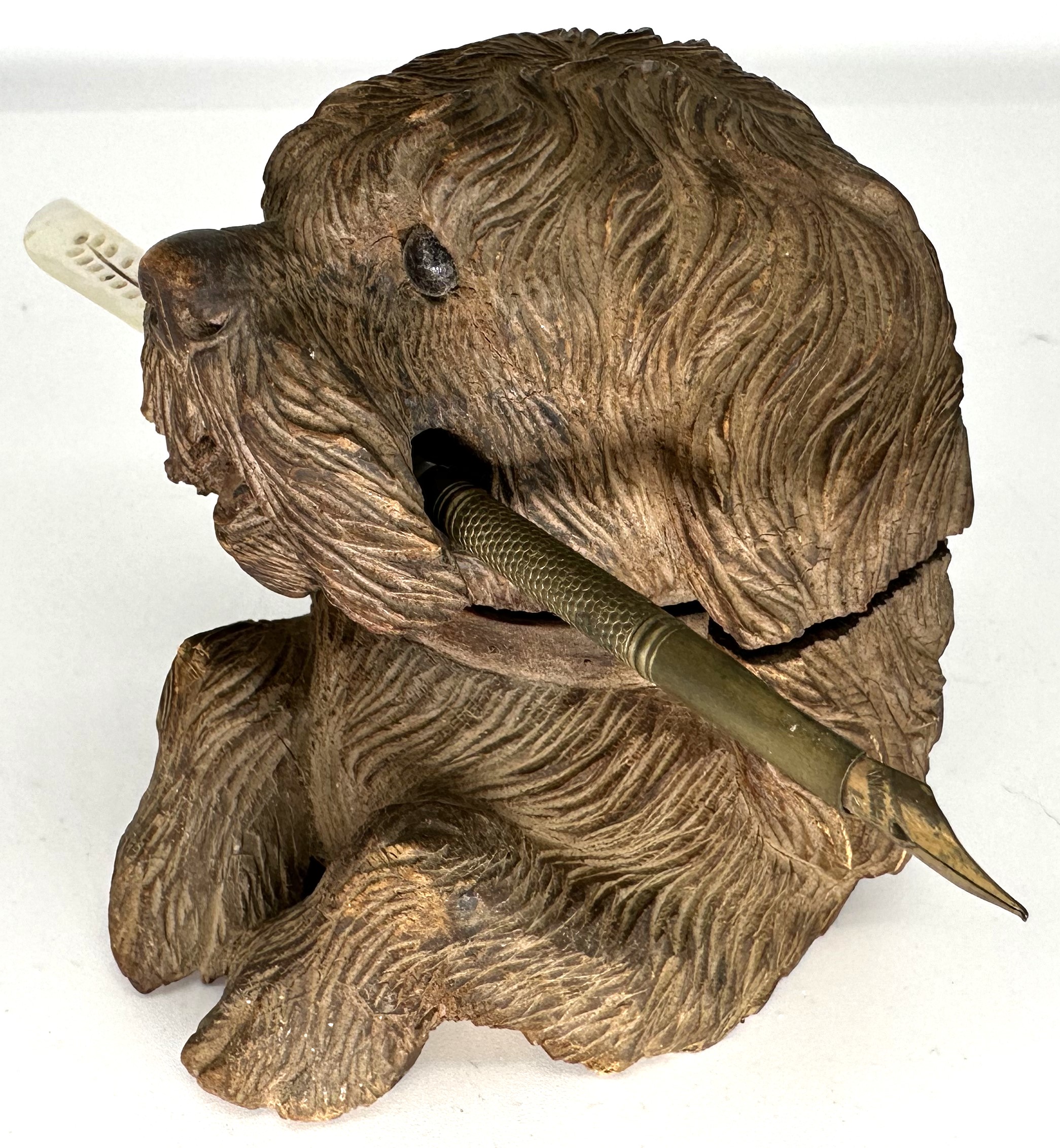 This cute dog is begging to offer you pen and ink. Beautifully carved with an expressive face and hole in his snout to hold a pen, he comes from the Black Forest region.