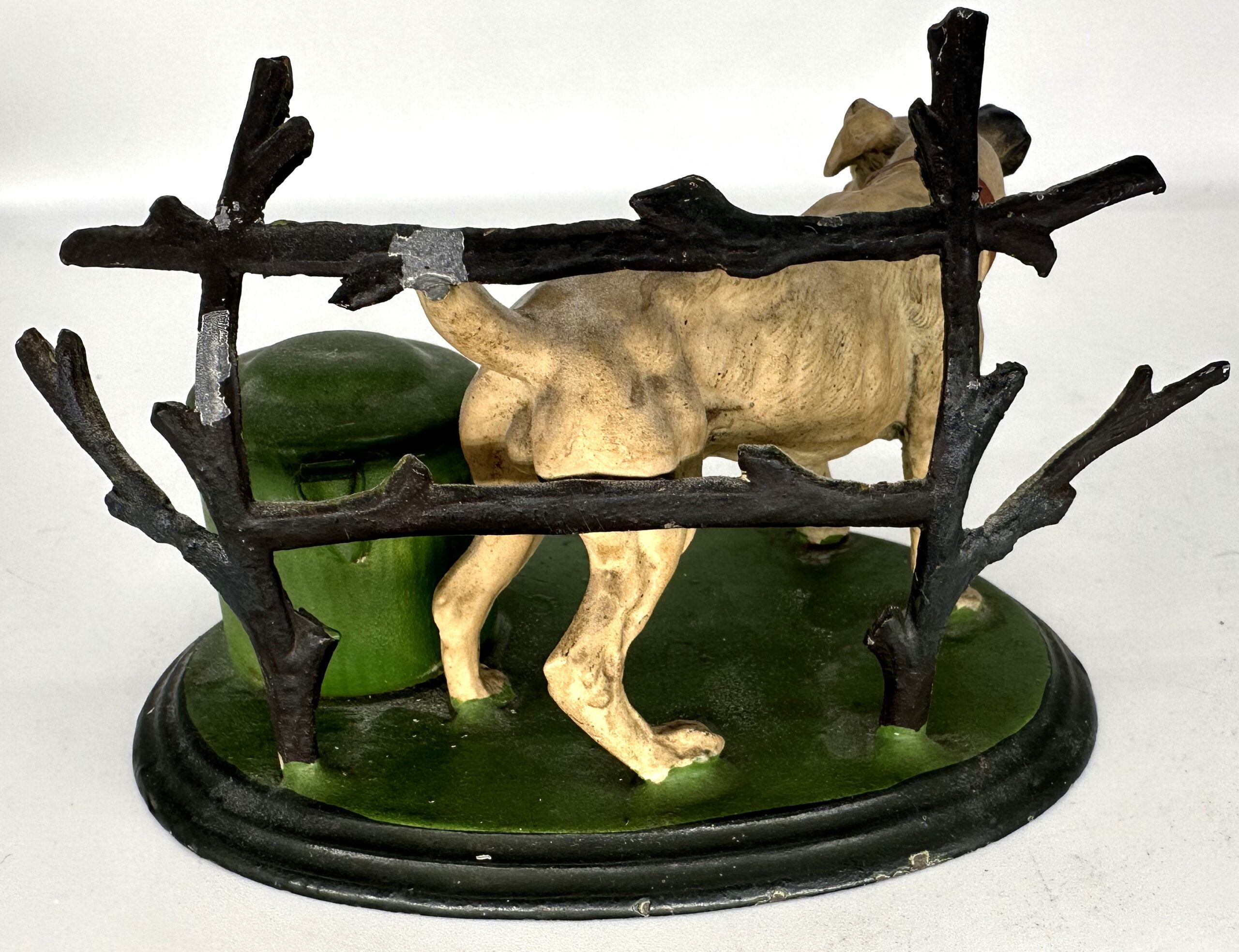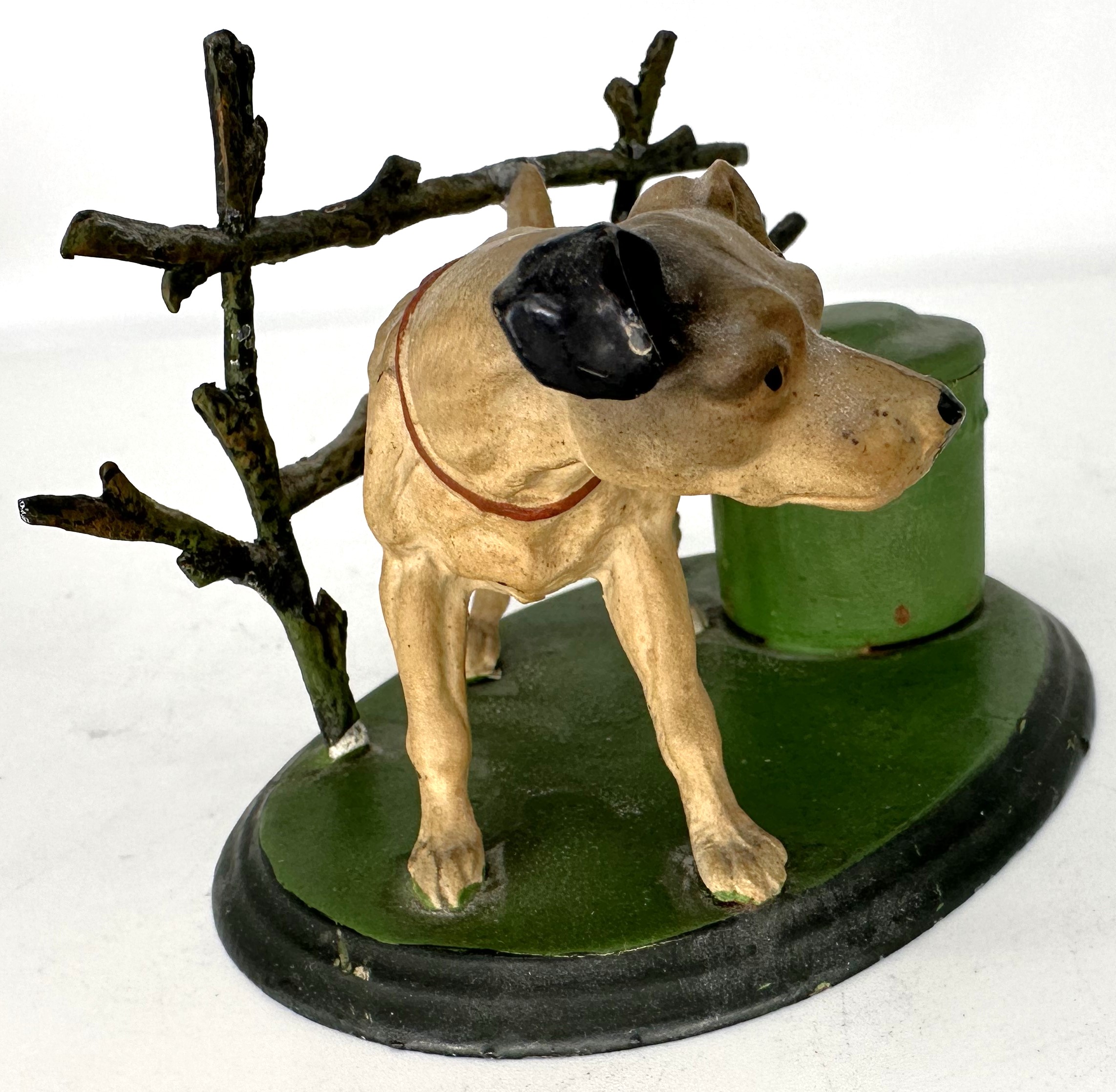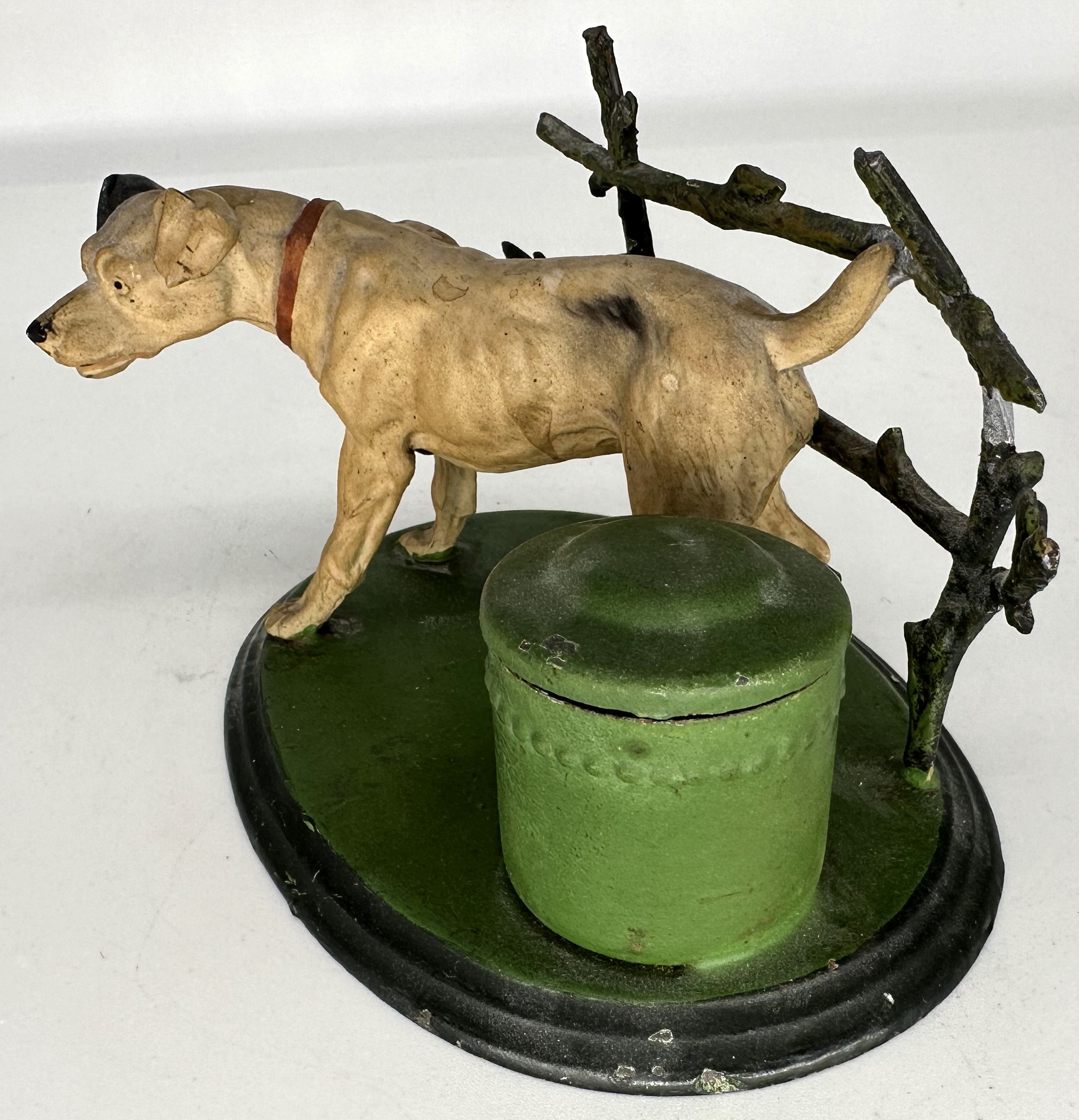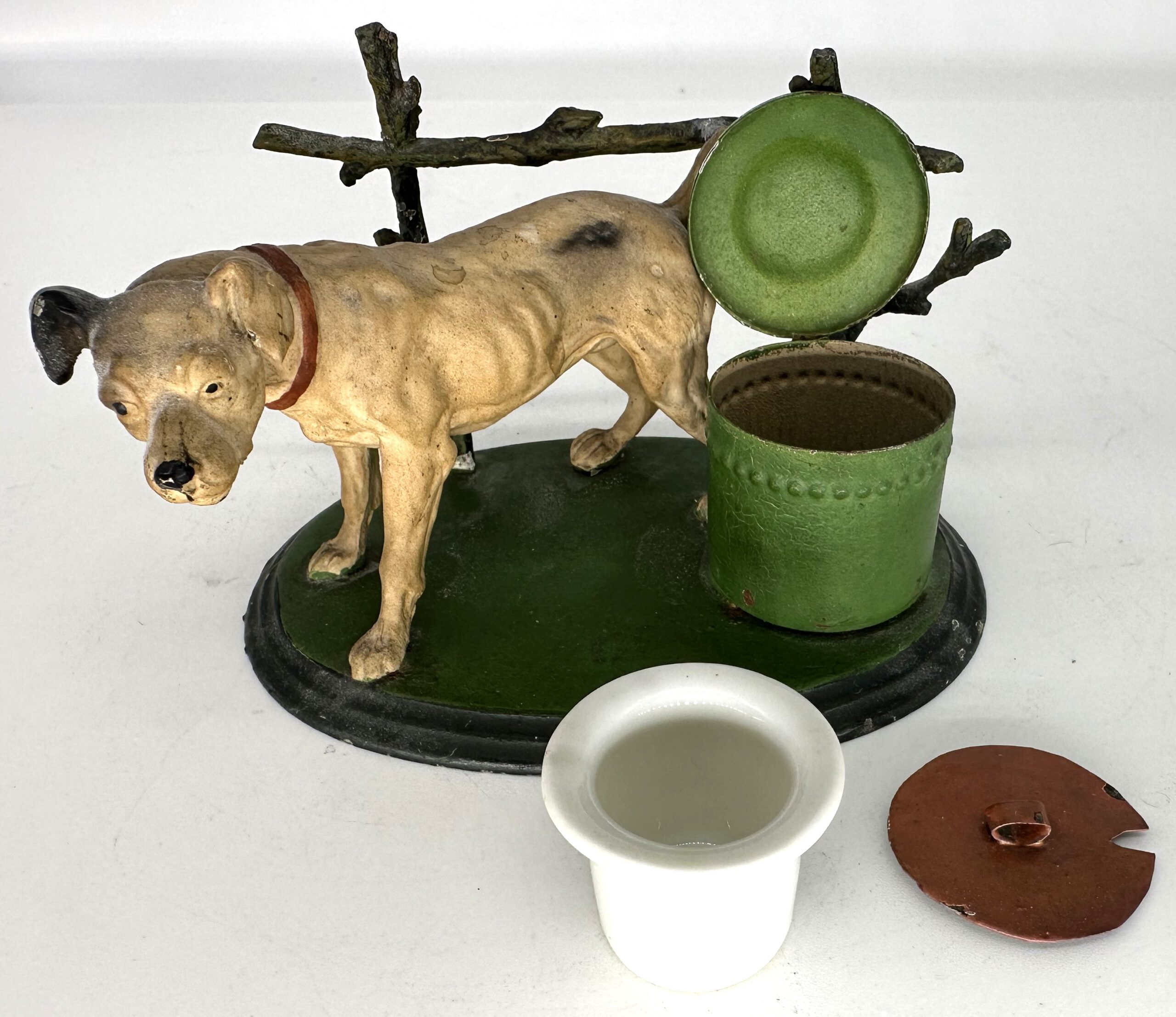 A well-detailed, cold-painted metal dog stands next to a fence (pen rack) and an inkwell. Under the lid, there is a special cover for the inkwell.