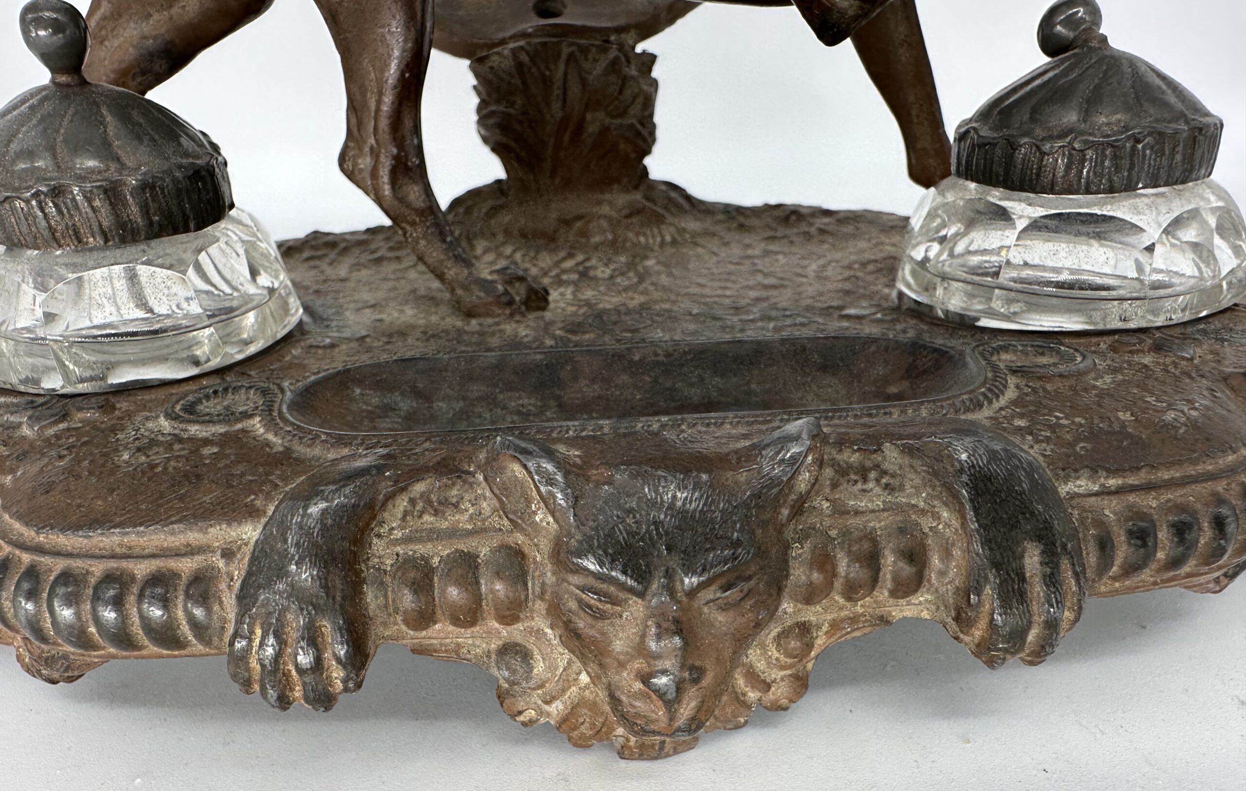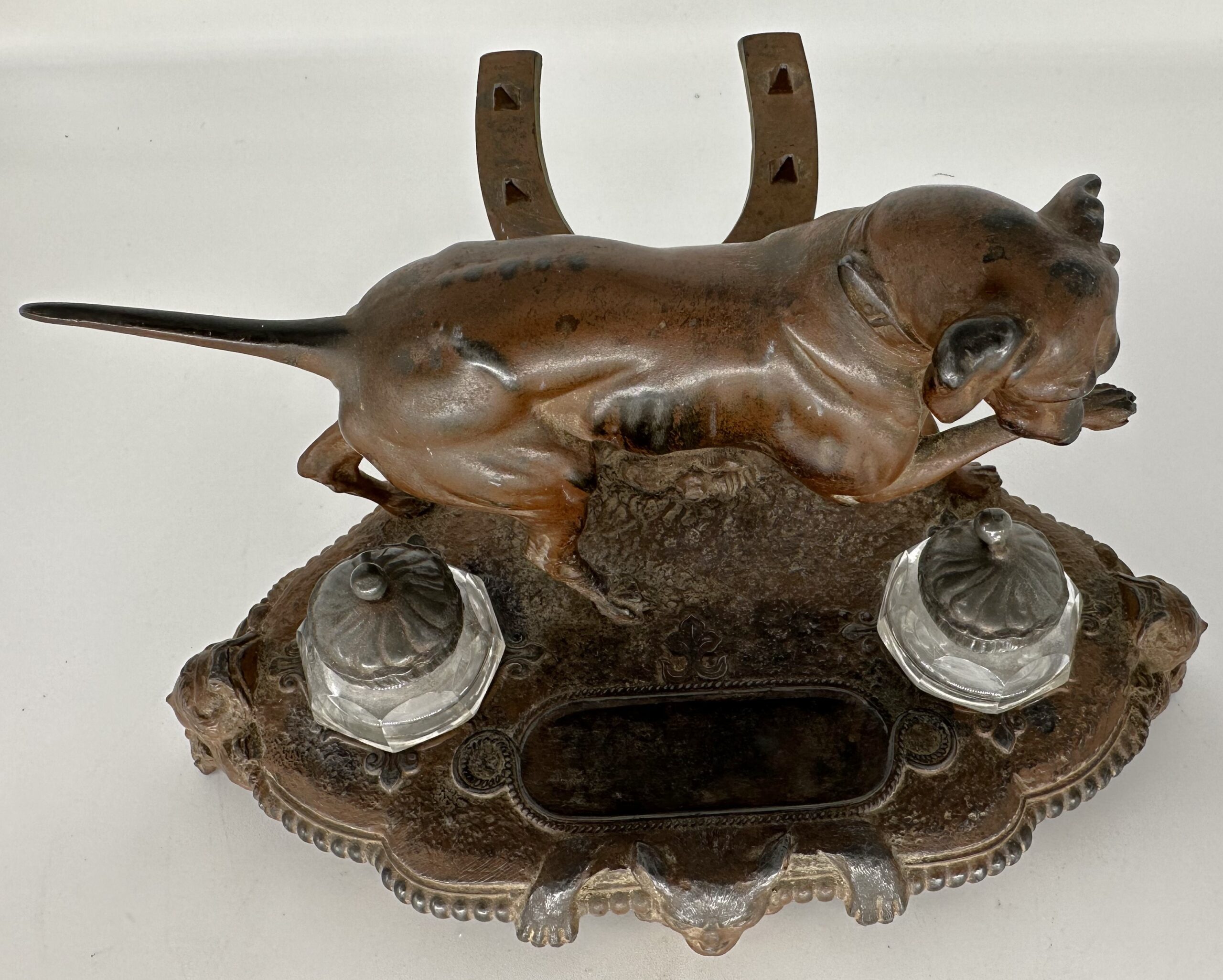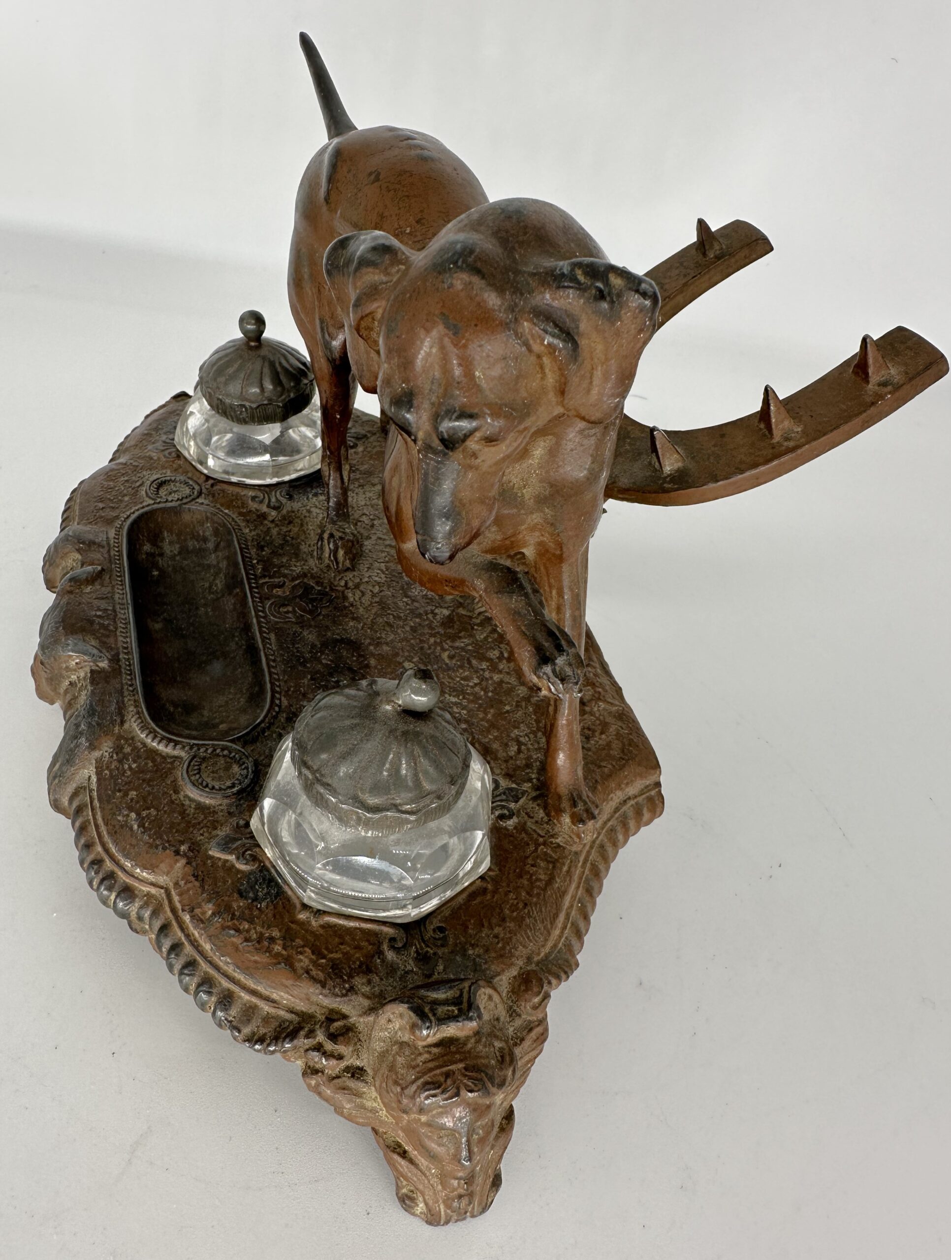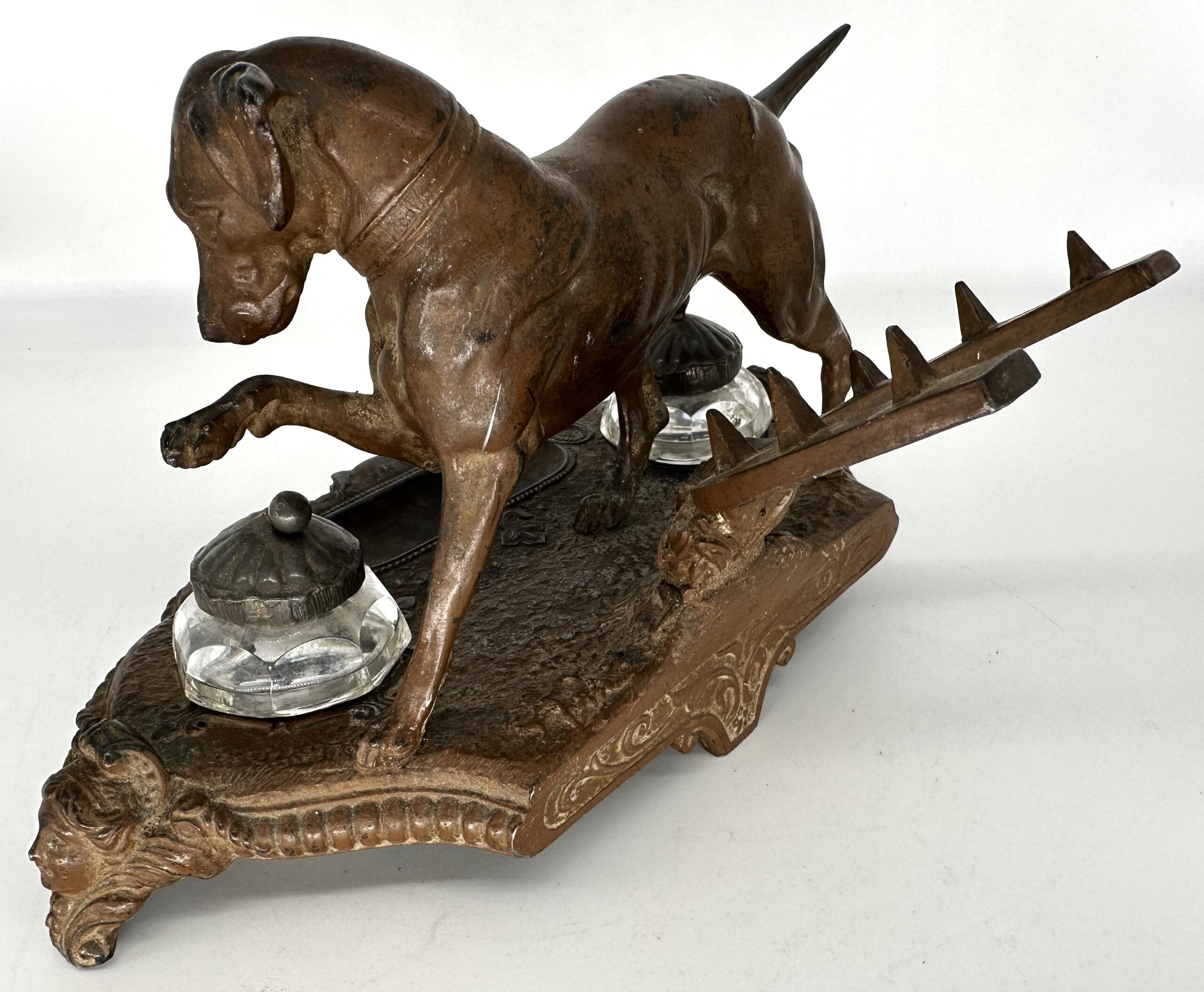 Cast metal double inkstand featuring a dog licking his paw. Behind him is a horseshoe-shaped pen rack with nails. In front is a pen tray and the face of a gargoyle.