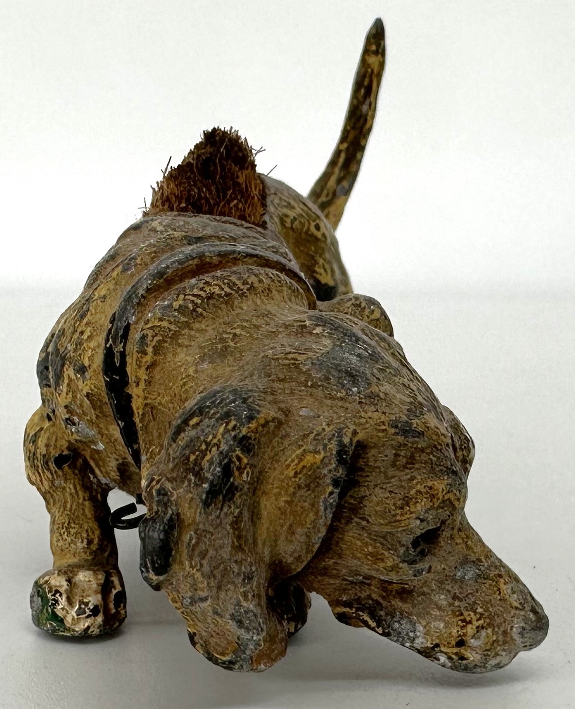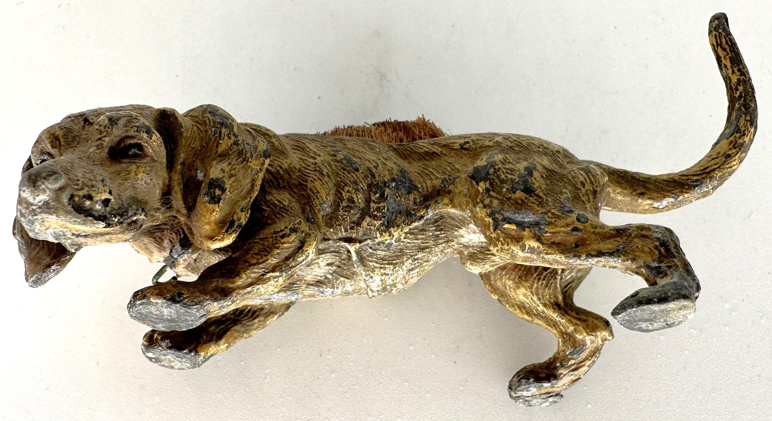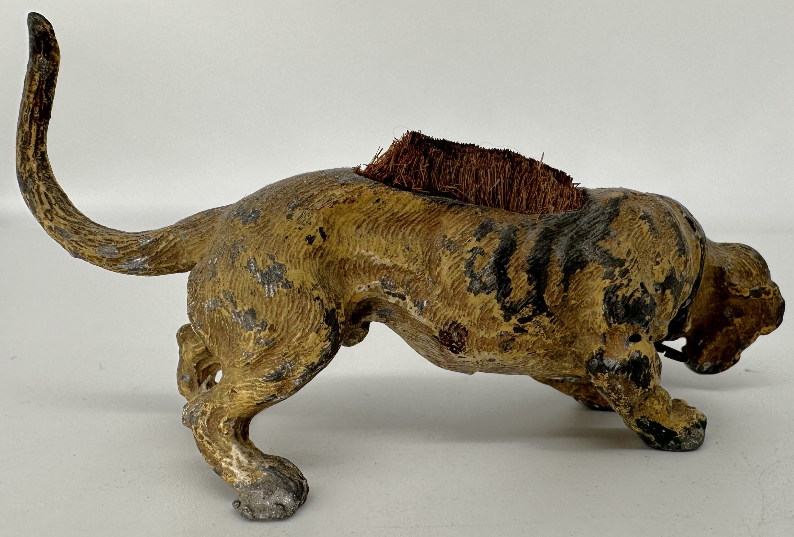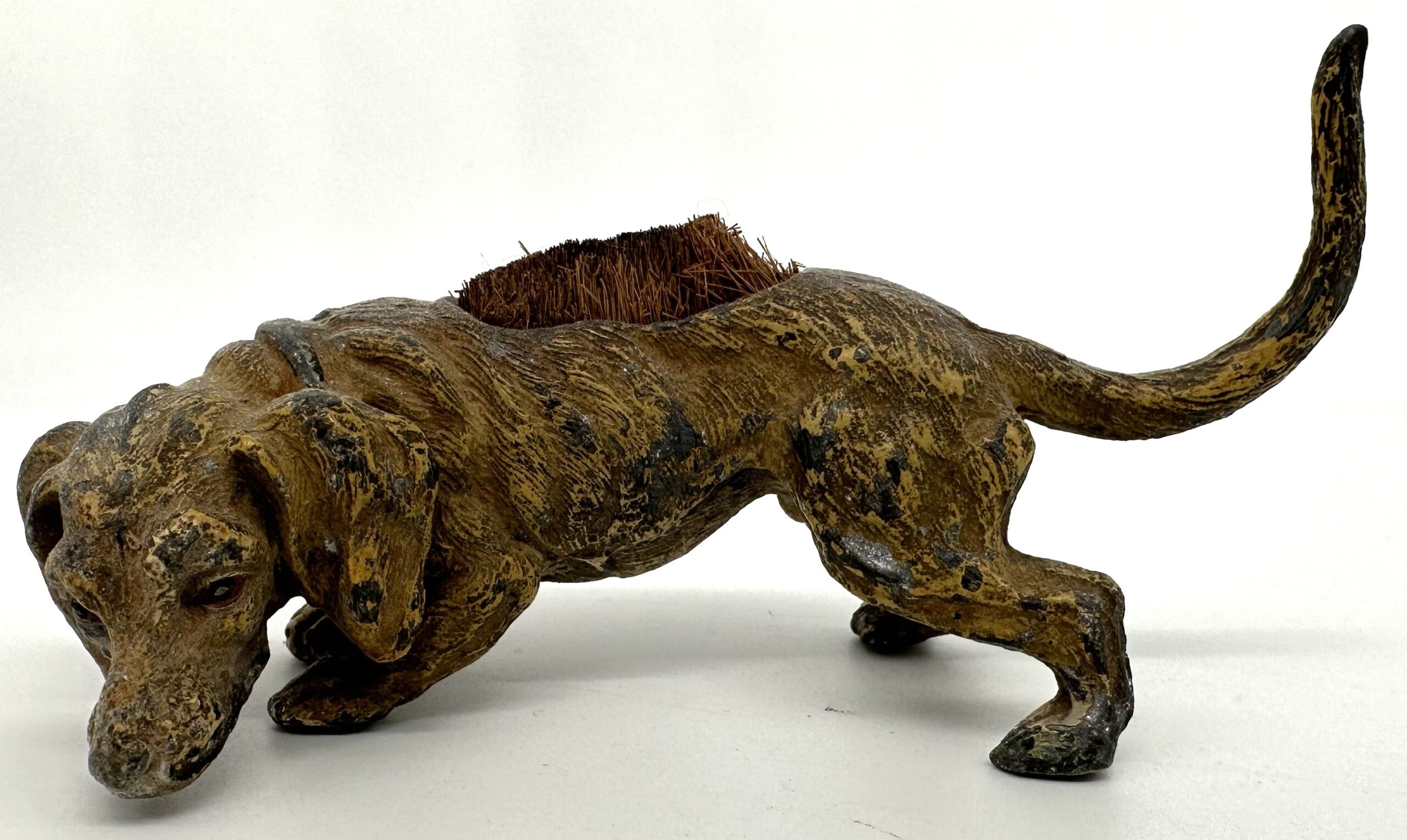 Painted cast metal pen wipe in the form of a dog sniffing the ground.