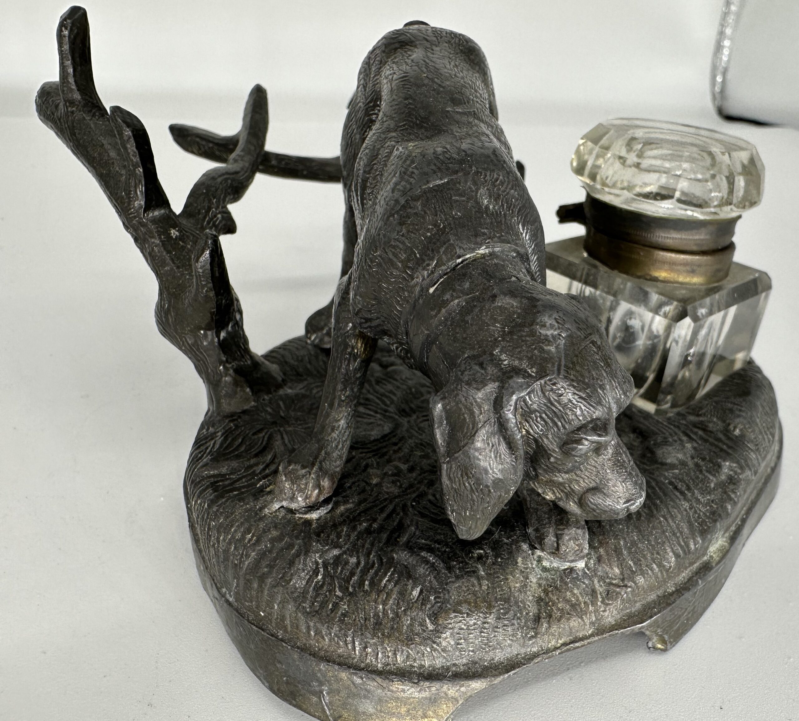 Inkstand features a hound dog sniffing the ground. A cut glass inkwell is lodged in the receptacle. A log pen rack stands in the background. Condition issue: missing sections from the base.