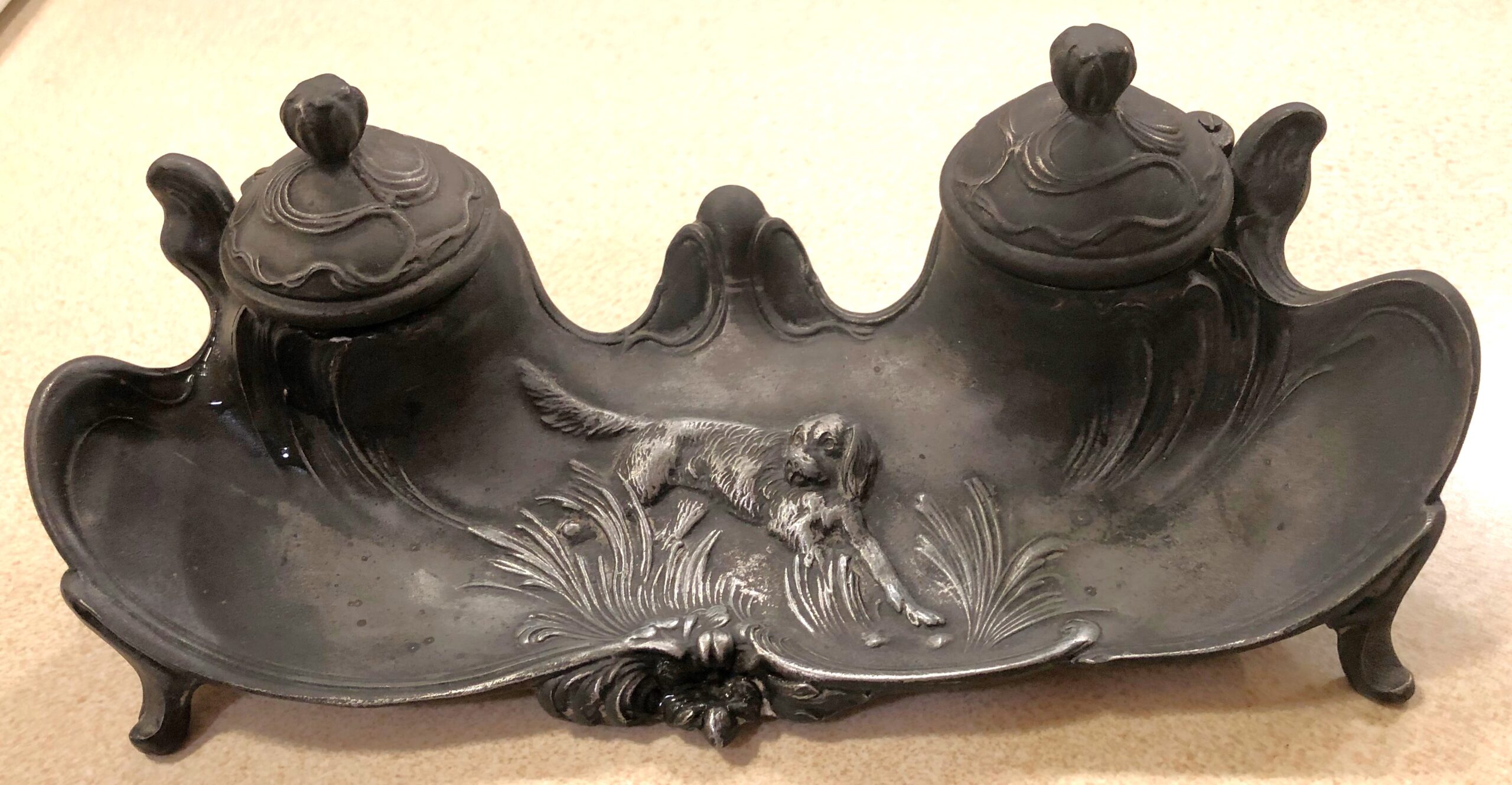 This inkstand features a hunting dog in a field embossed on the pen tray.  The lids, attached by pin, swivel open or closed.