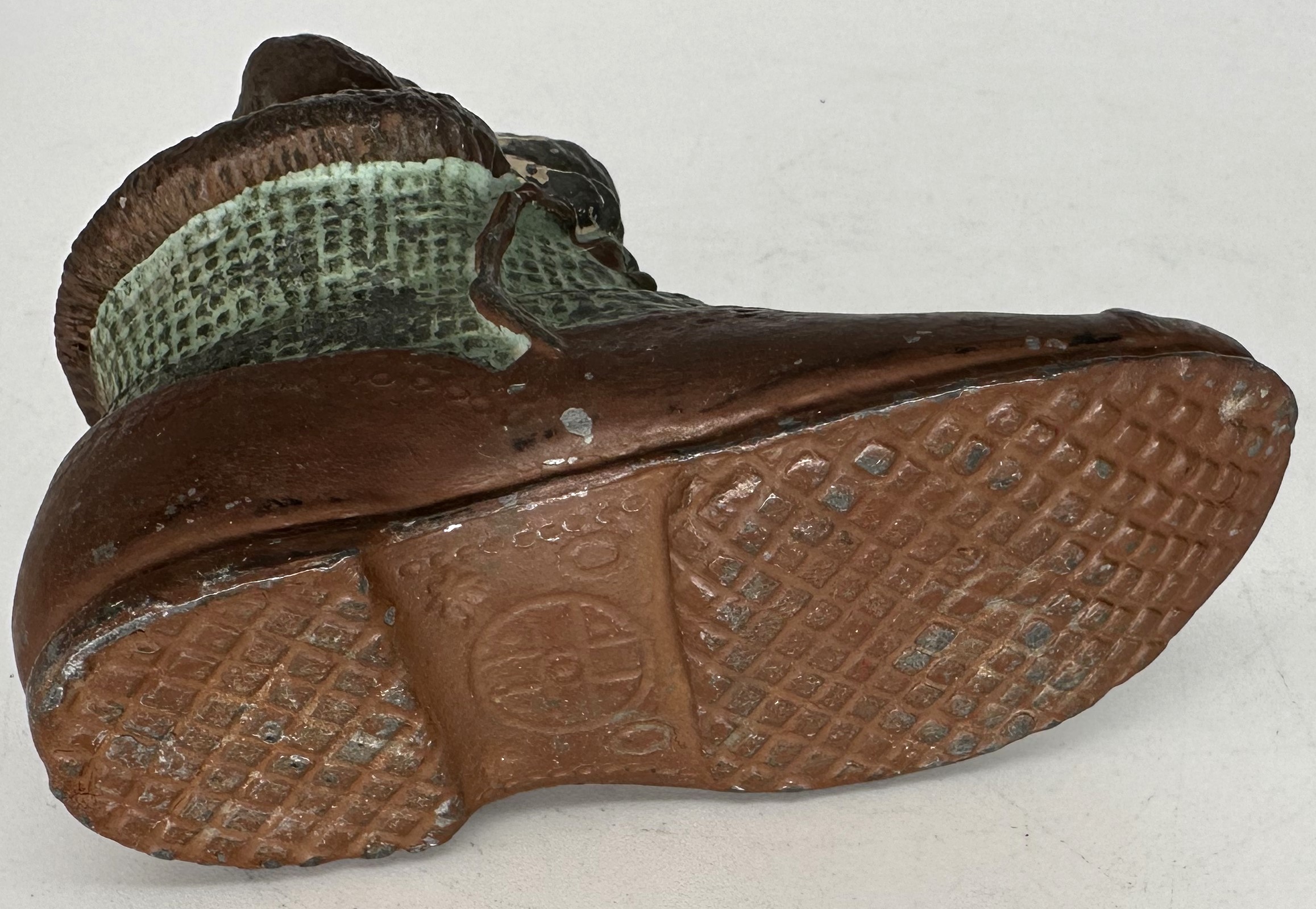 A dog’s head pops out of a shoe. Painted metal with lots of detail including (underneath) the tread of the shoe.