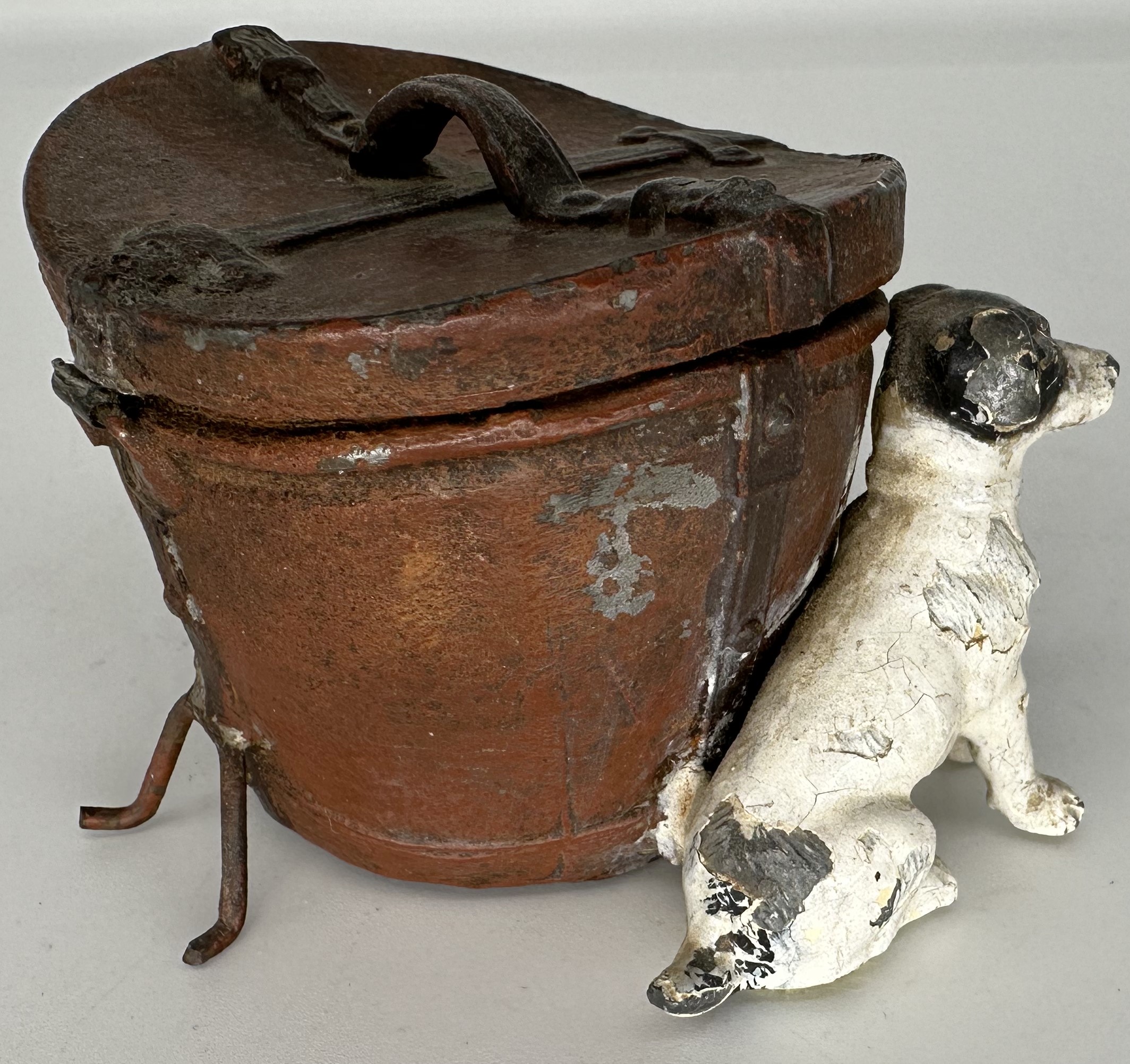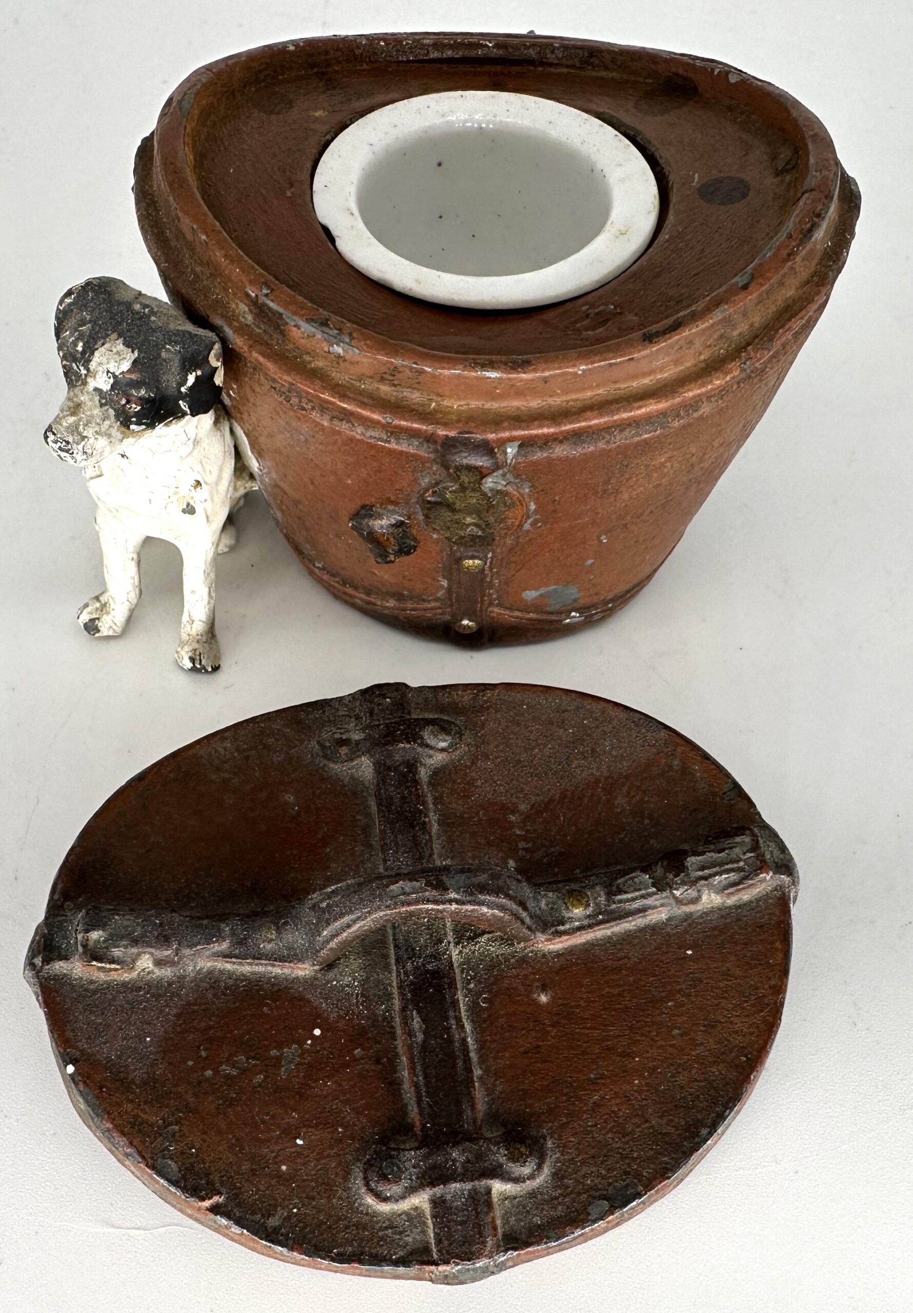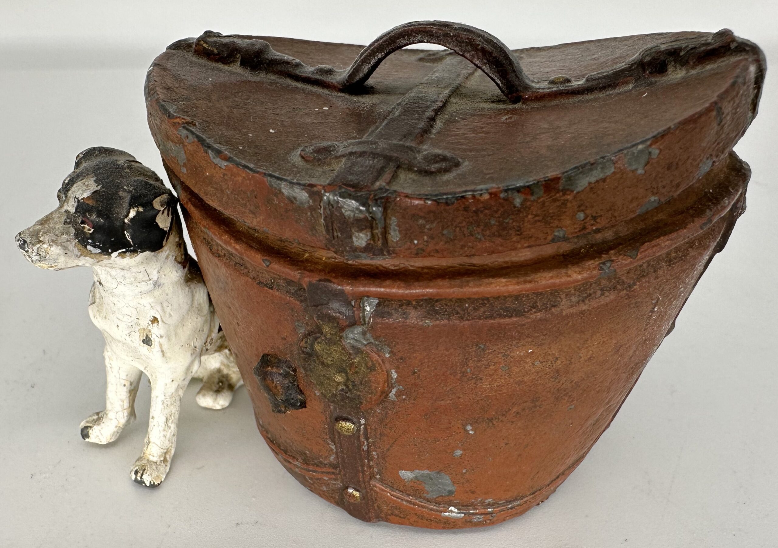 A terrier sits next to a top hat box ready to travel. The lid of the box (originally attached with a hinge) lifts off. Amazing detail to the “leather” straps on this cast metal piece.