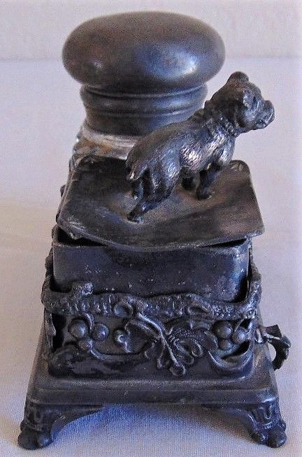 Quadruple silver plate glass inkwell and stamp case topped with a figural bulldog by the Pairpoint Mfg. Co from the late 1800’s.