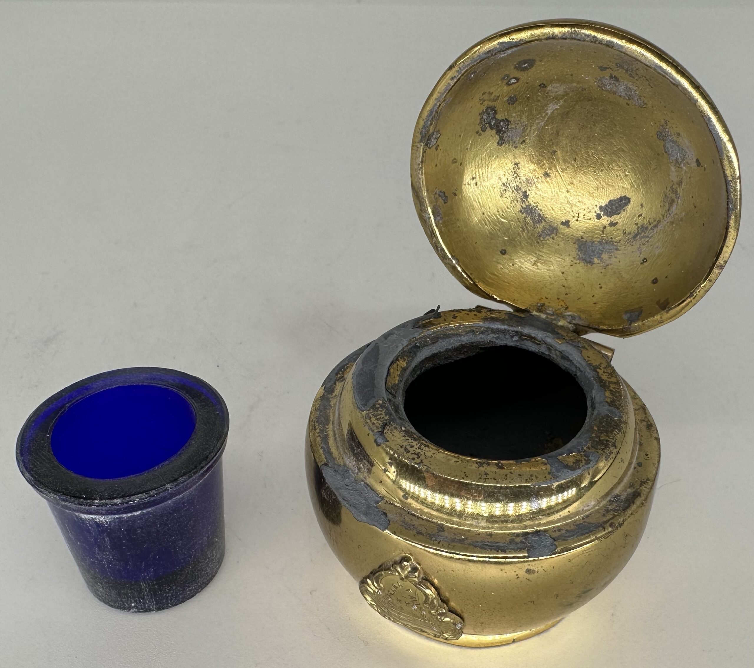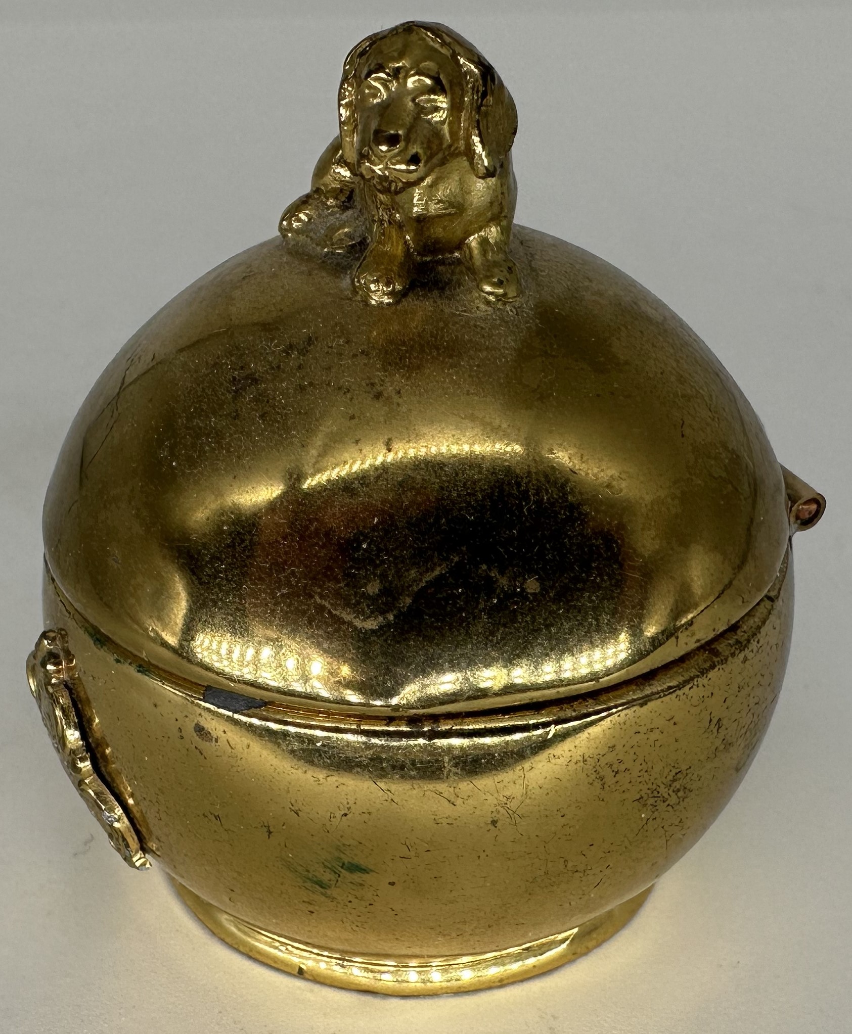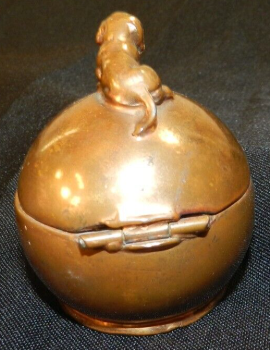 A puppy (or beagle) sits atop a brass-plated globe, marked “J.B. 418” on the bottom. Nice original cobalt insert. Attached to the globe is an emblem for “Niagara Falls” – likely a vacation souvenir.