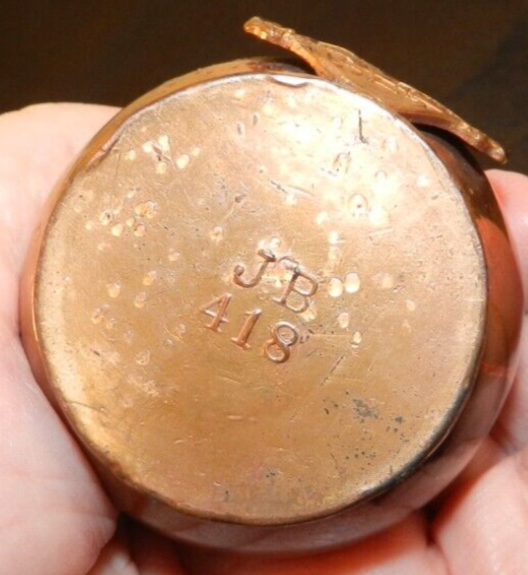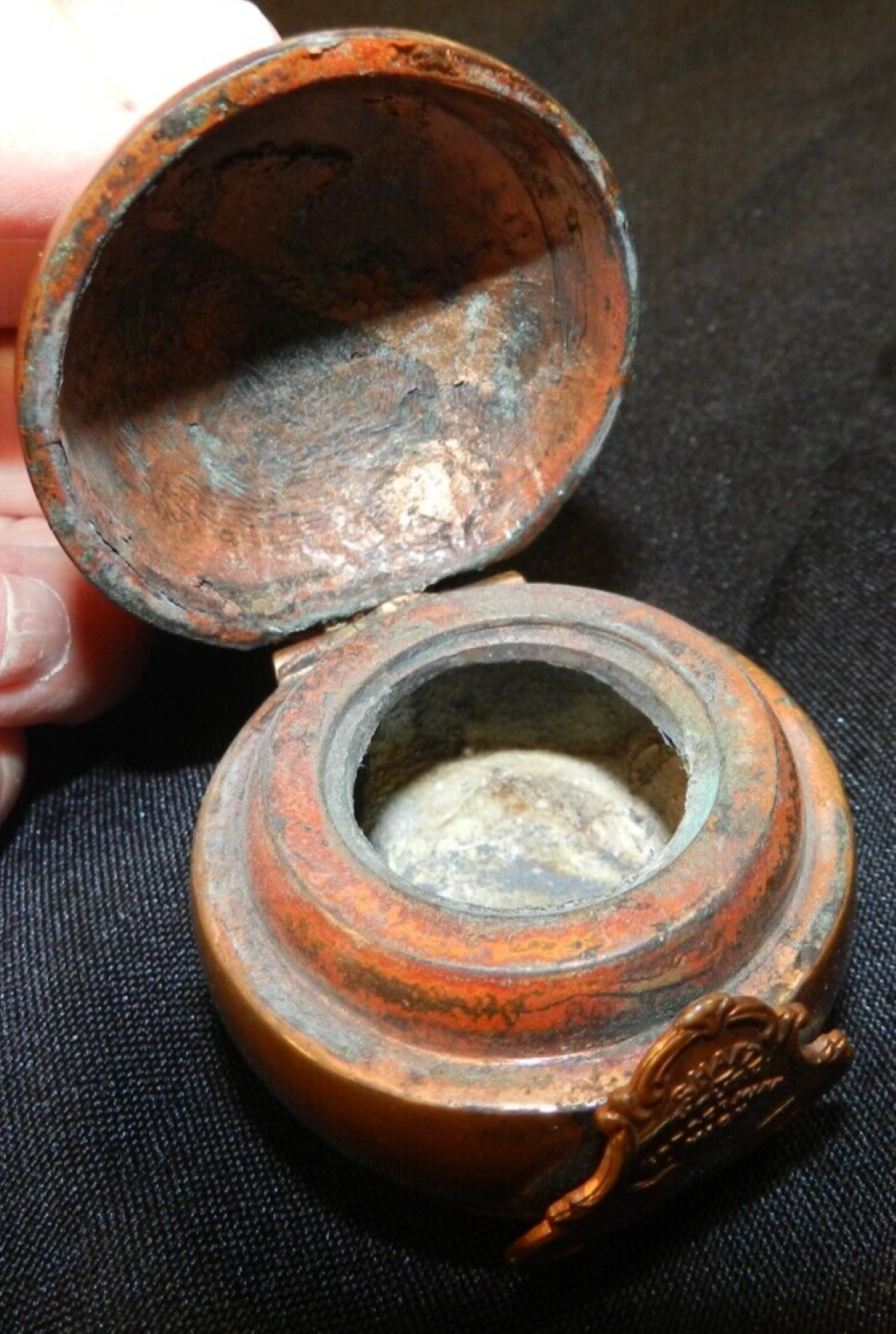The Jennings Brothers company, known for high quality and detailed sculptures, figurines and bookends among other metal items, made this inkwell. They were in business in Bridgeport Connecticut from 1891 to 1953, and used special treatments to create their many finishes that were long lasting and attractive.