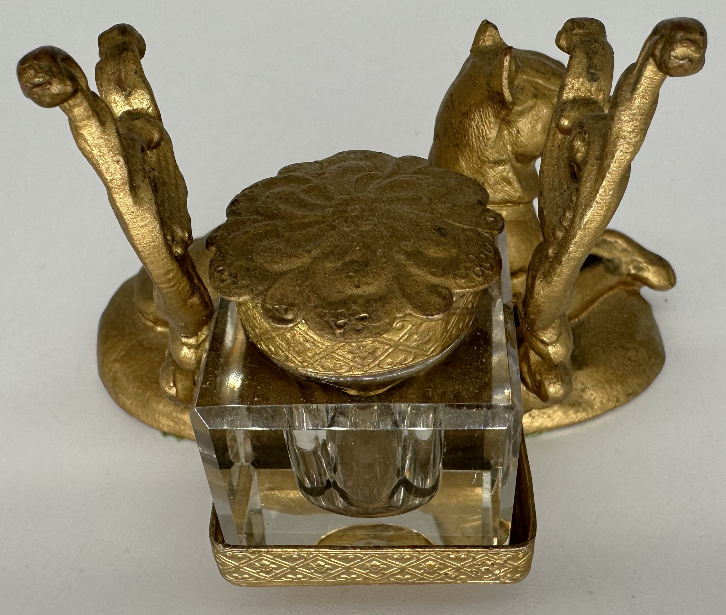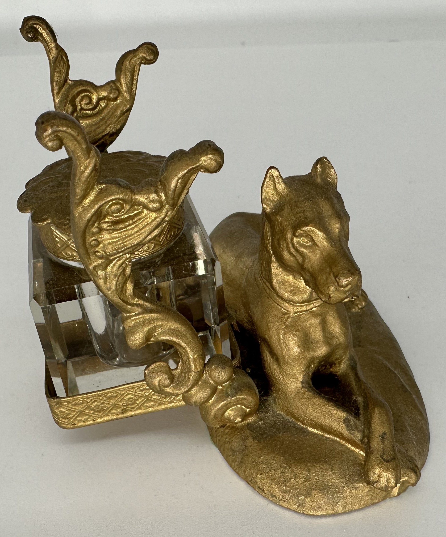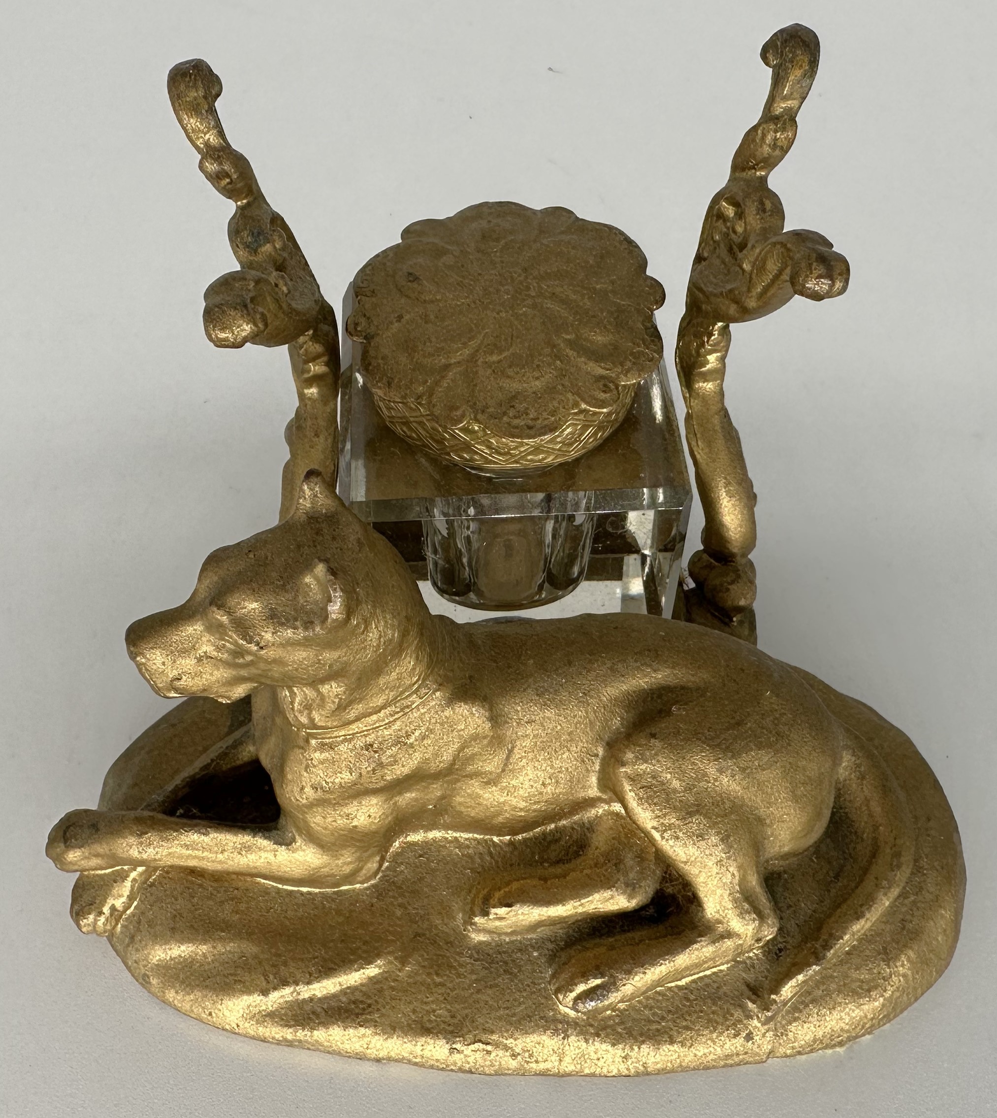 The full figure of a large dog (Great Dane?) lies in front of the inkwell. The glass inkwell has a loose brass lid and is held in a frame. An ornate pen holder completes the inkstand with an oval base.