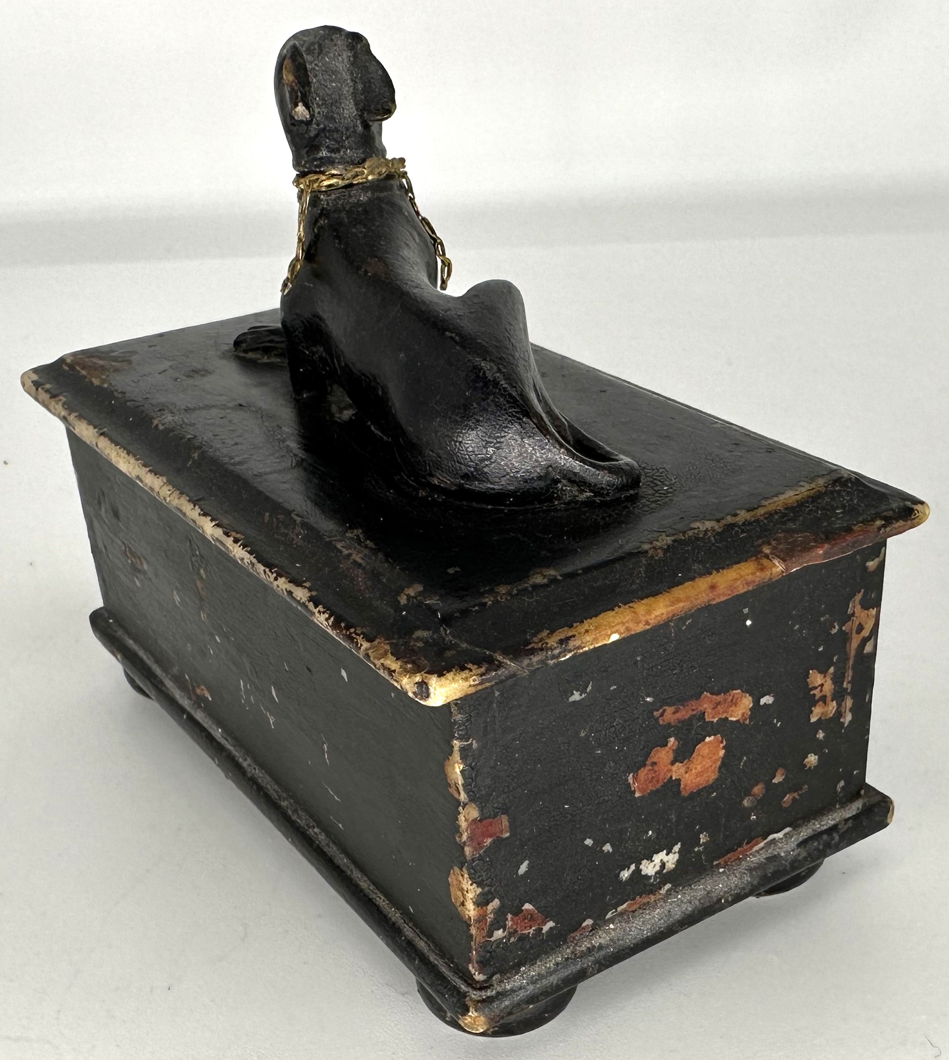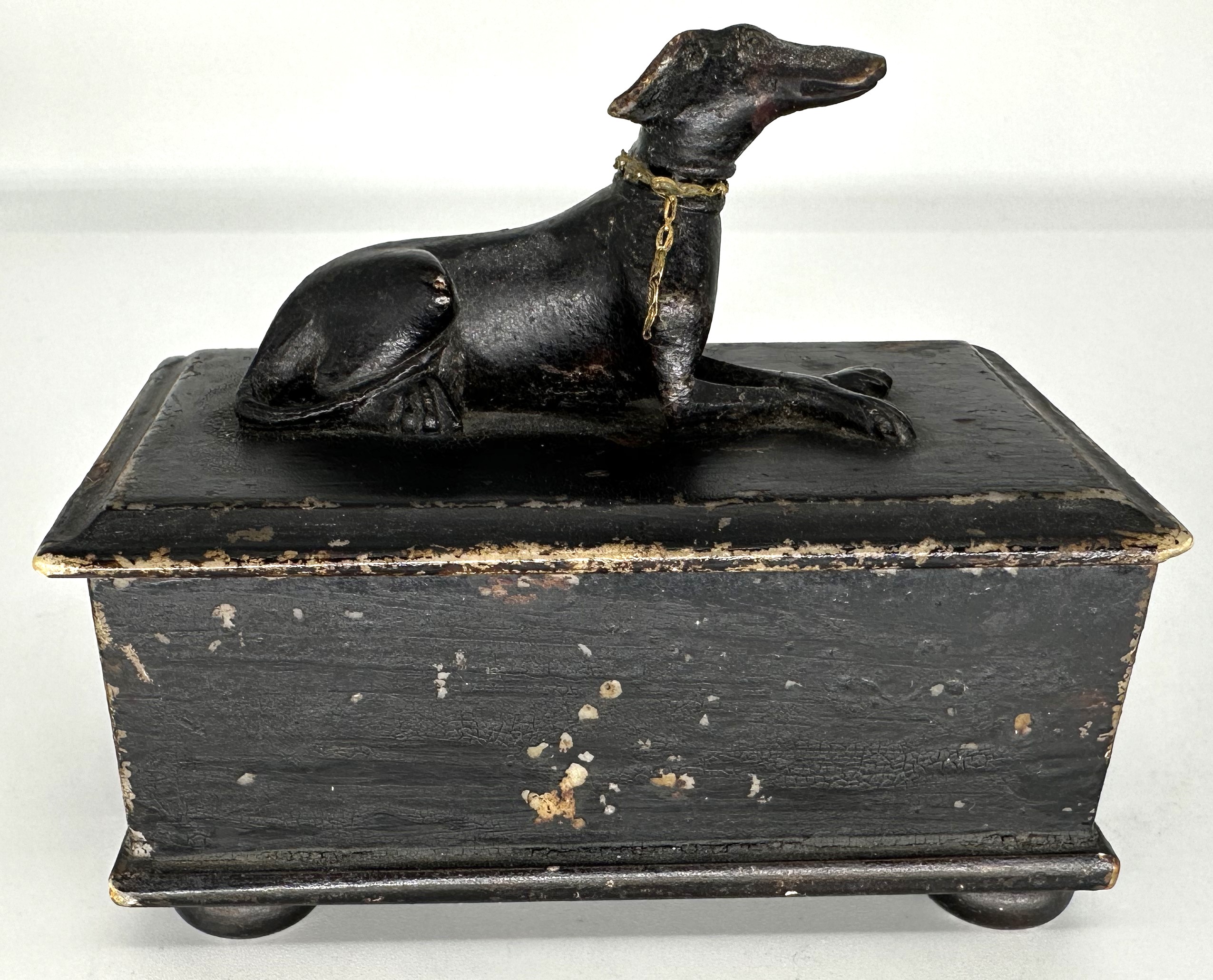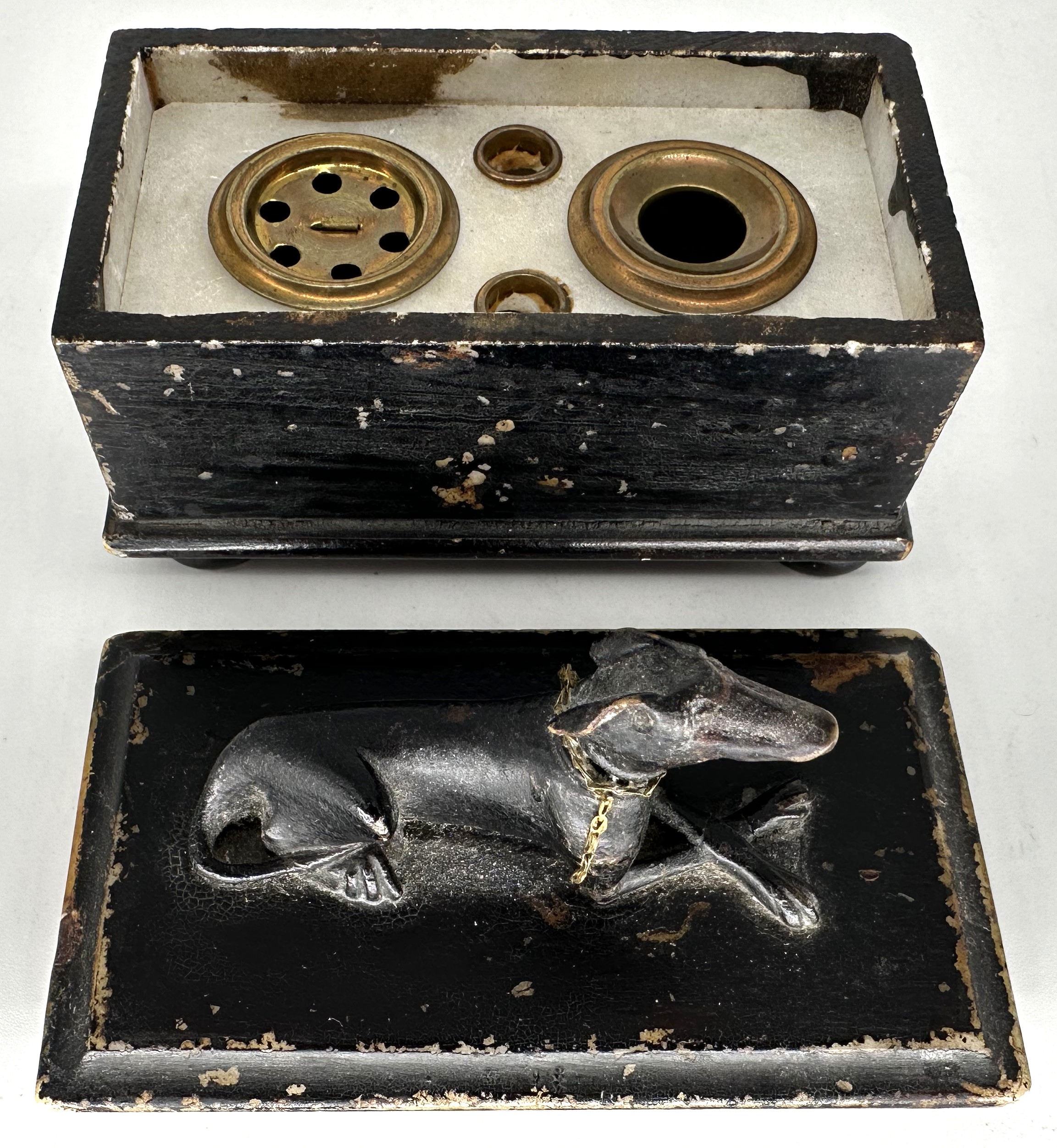 19th Century English Regency inkstand featuring a recumbent bronze greyhound with a chain collar resting on a plinth. The inkstand is made of black lacquered wood and marble. Lift the top to access an inkwell, sander, and two pen holes.