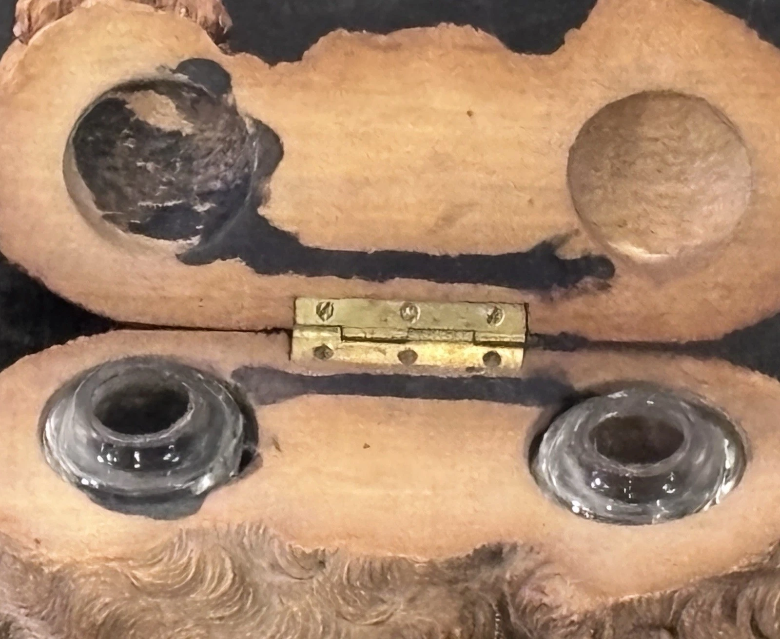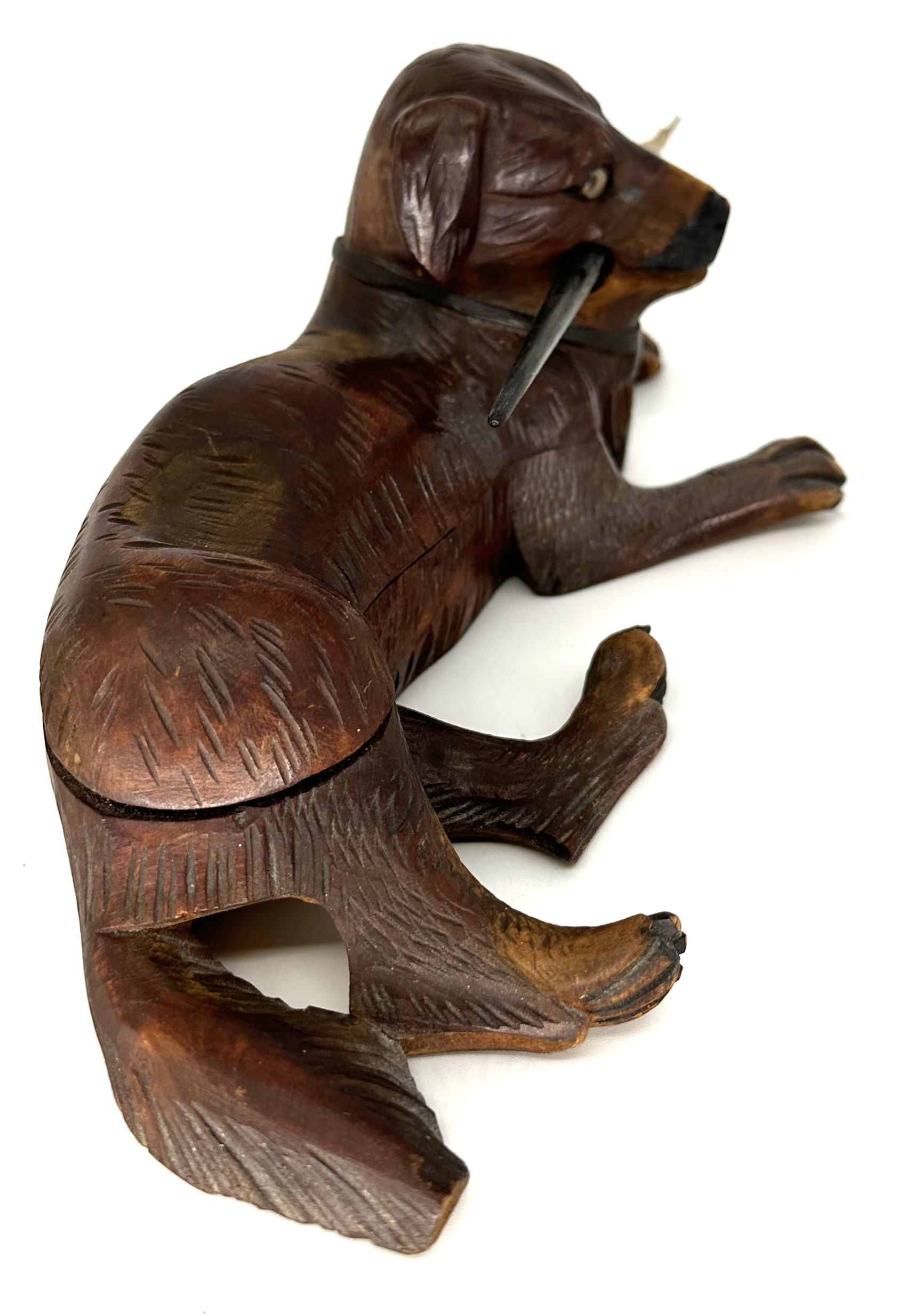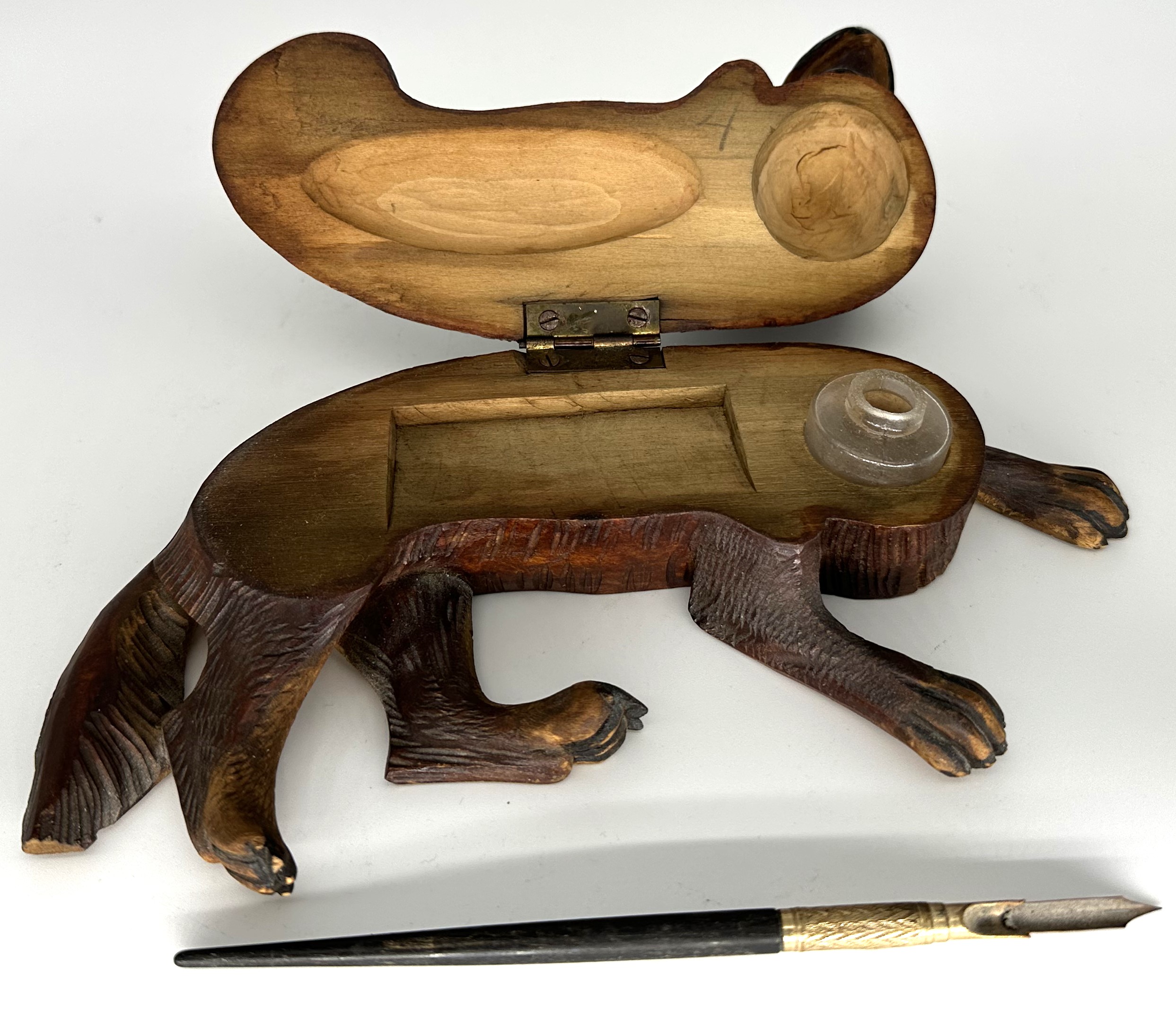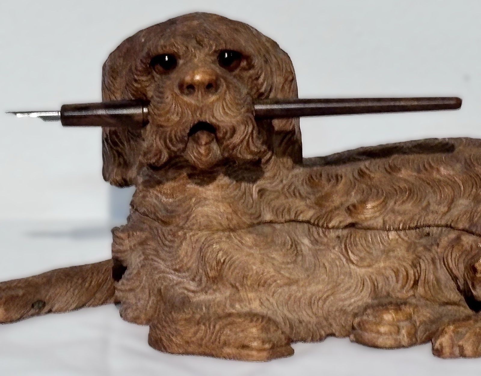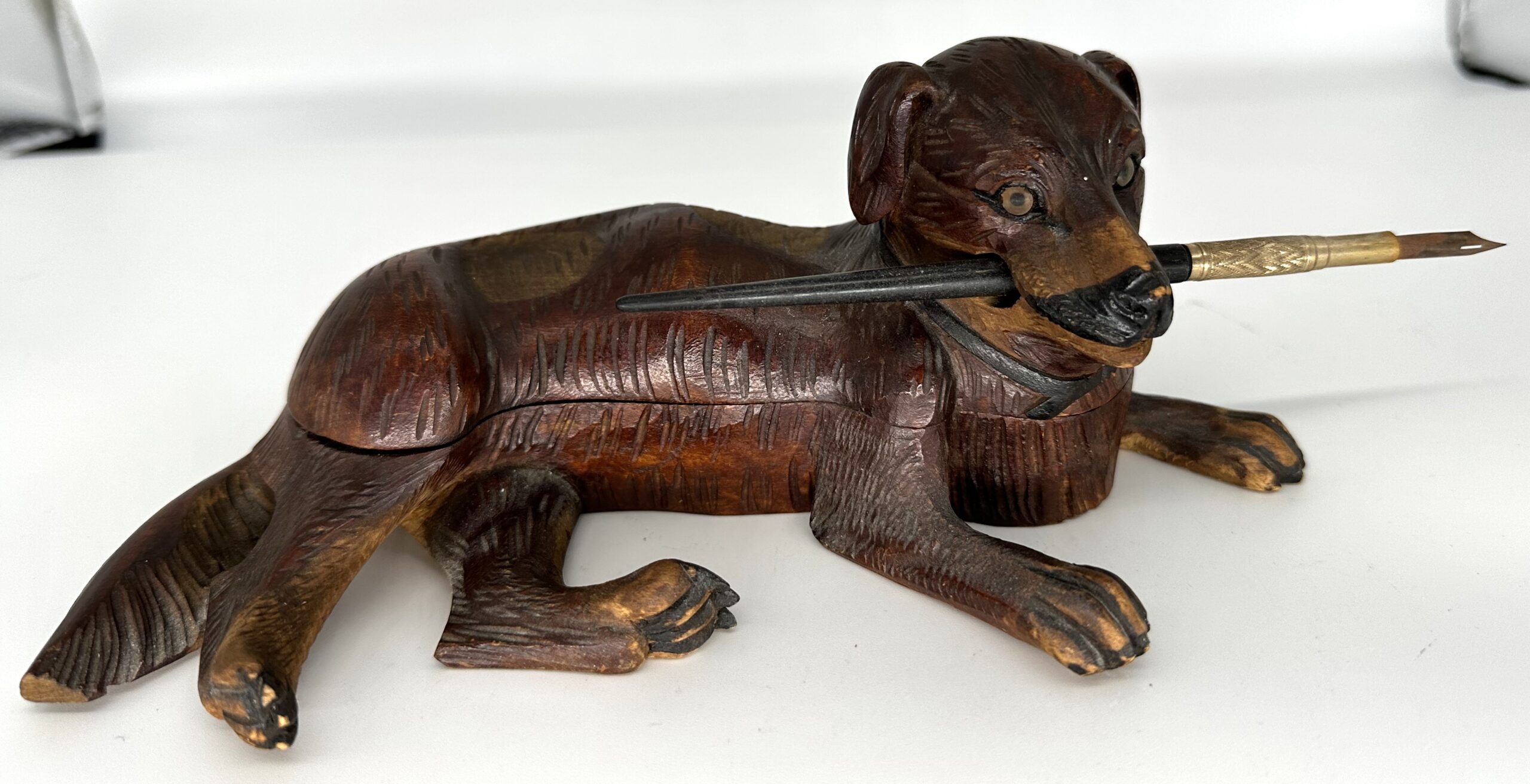 Beautifully hand-carved wood and piercing glass eyes distinguish the piece.  This retriever proudly holds a stick (pen) he found. Hinged on his back, inside one finds an ink bottle and a slotted area to store stamps, nibs, etc.  There is some wear and the tip of his tail is missing.