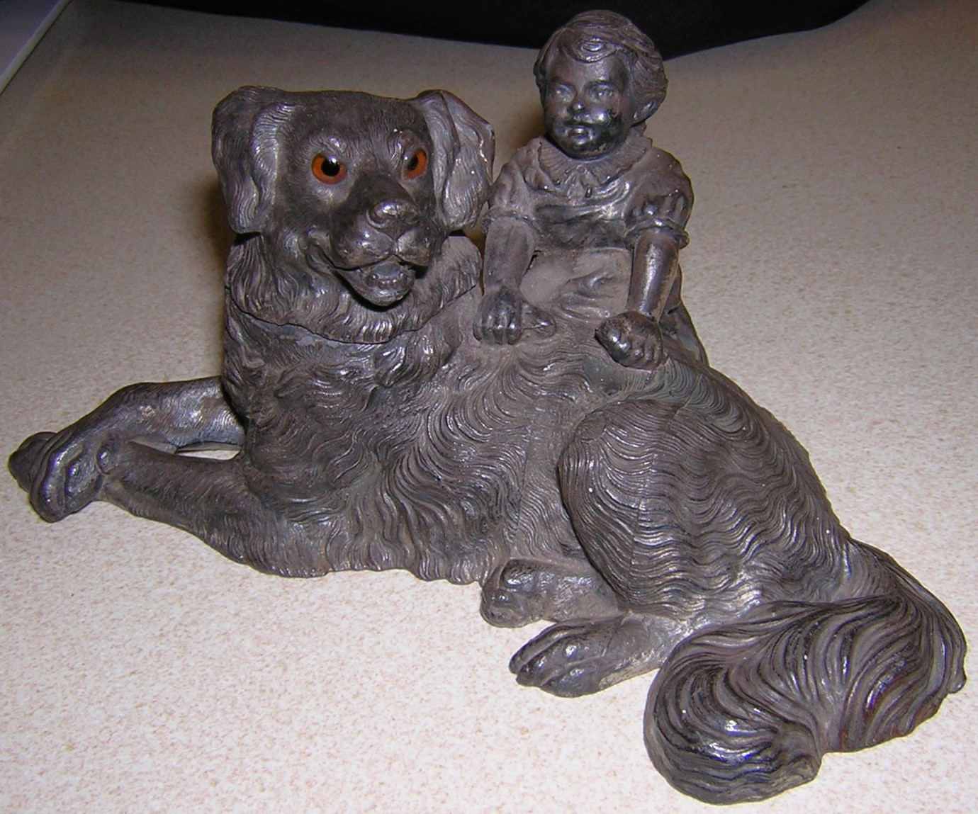 Meriden Silver FIGURAL INKWELL – Dog & Girl c1880 – a figural inkwell depicting a resting dog with a little girl behind him. Made of silver plate (all worn on this piece) by one of the Meriden Connecticut silver companies Wilcox, it dates from around 1880 and is a pure Victorian whimsical desk top item. The dog’s eyes are amber glass. The dog’s head opens to reveal the ink pot.