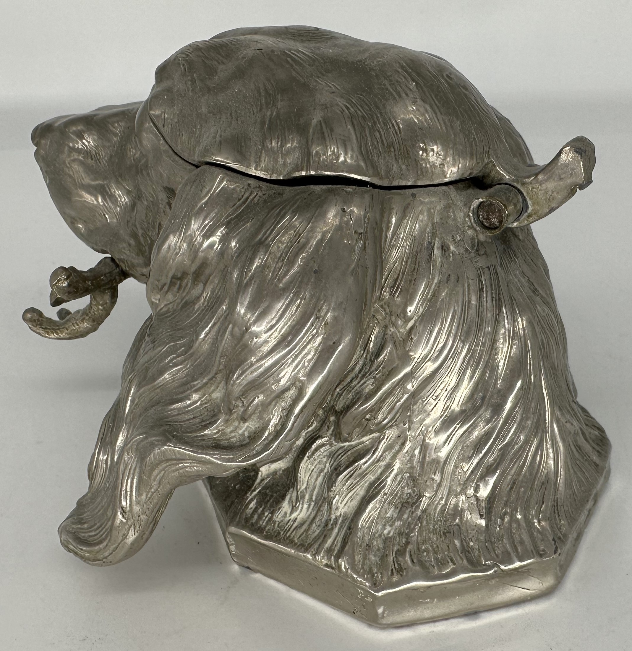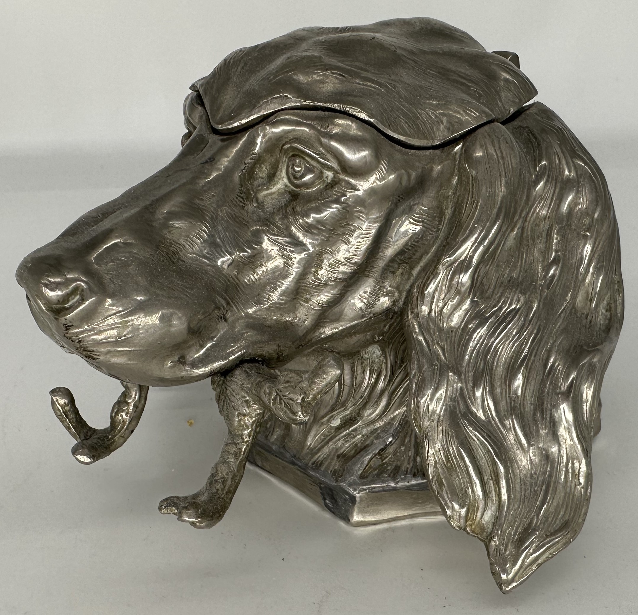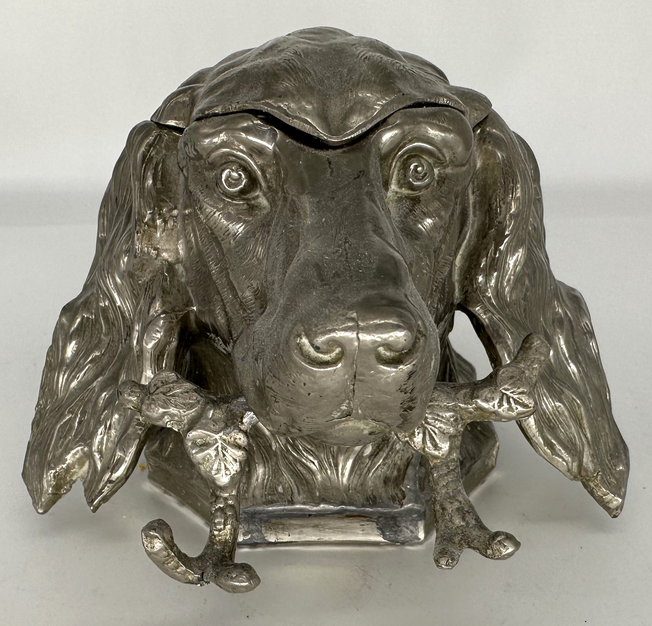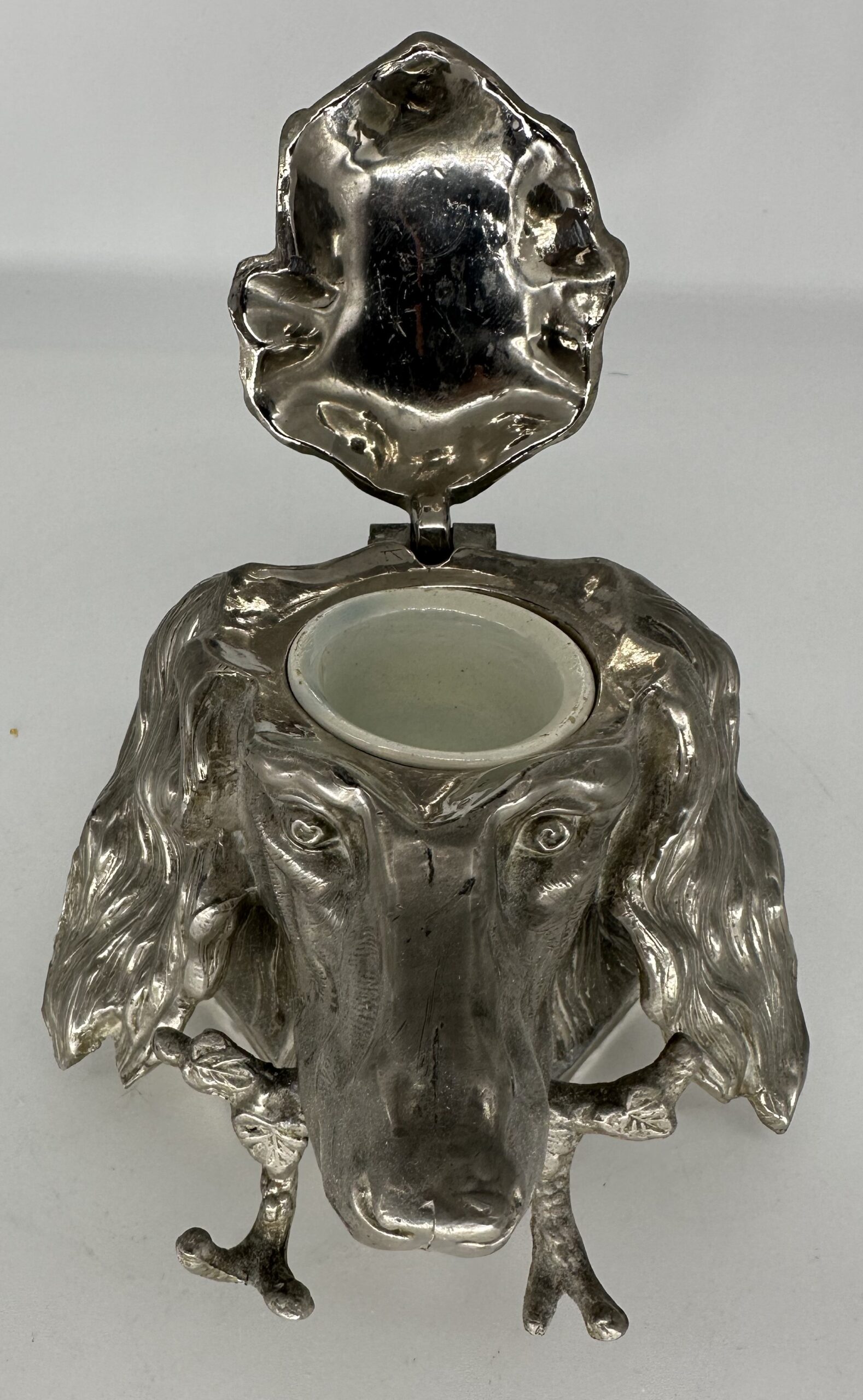 Silverplate inkwell in the form of a hunting dog. He’s carrying a branch which forms the pen holder.