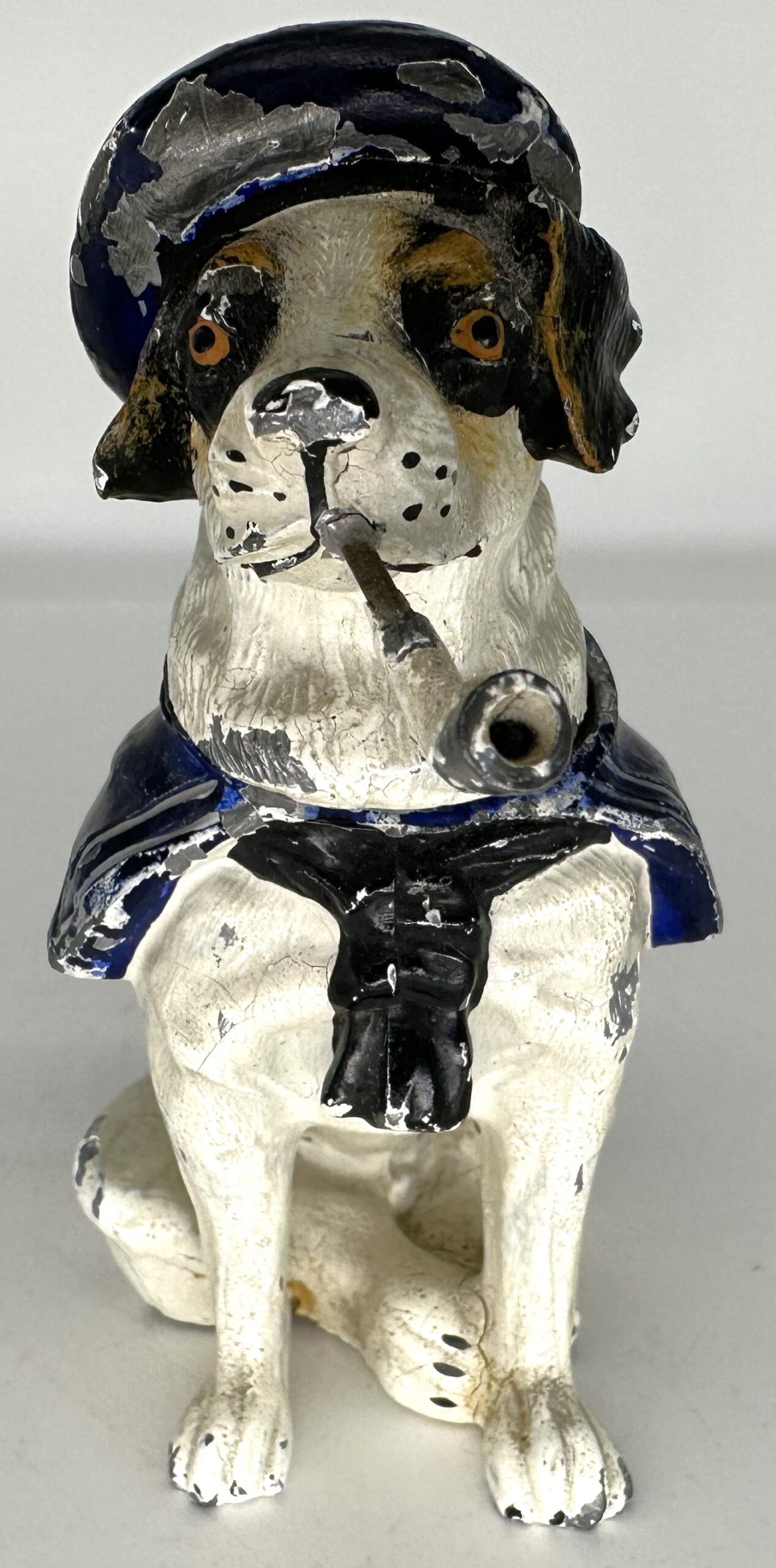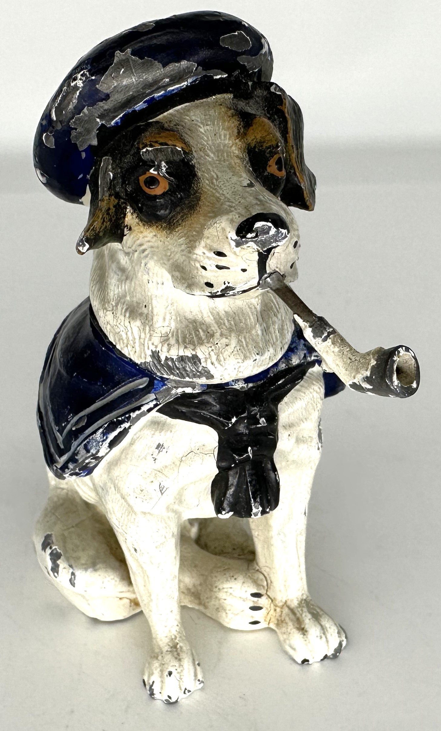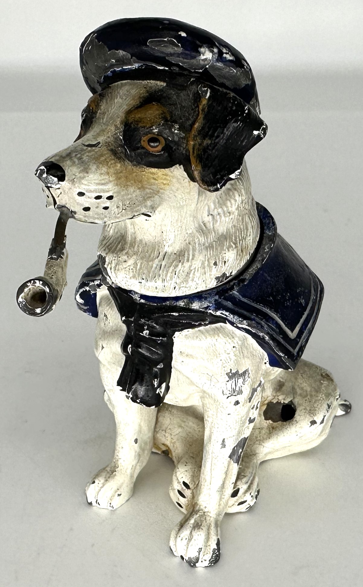 Inkwell in the form of a terrier dog wearing a sailor hat and collar, and is smoking a pipe. Lots of details in the casting and painting. His head tips back to reveal an ink reservoir.