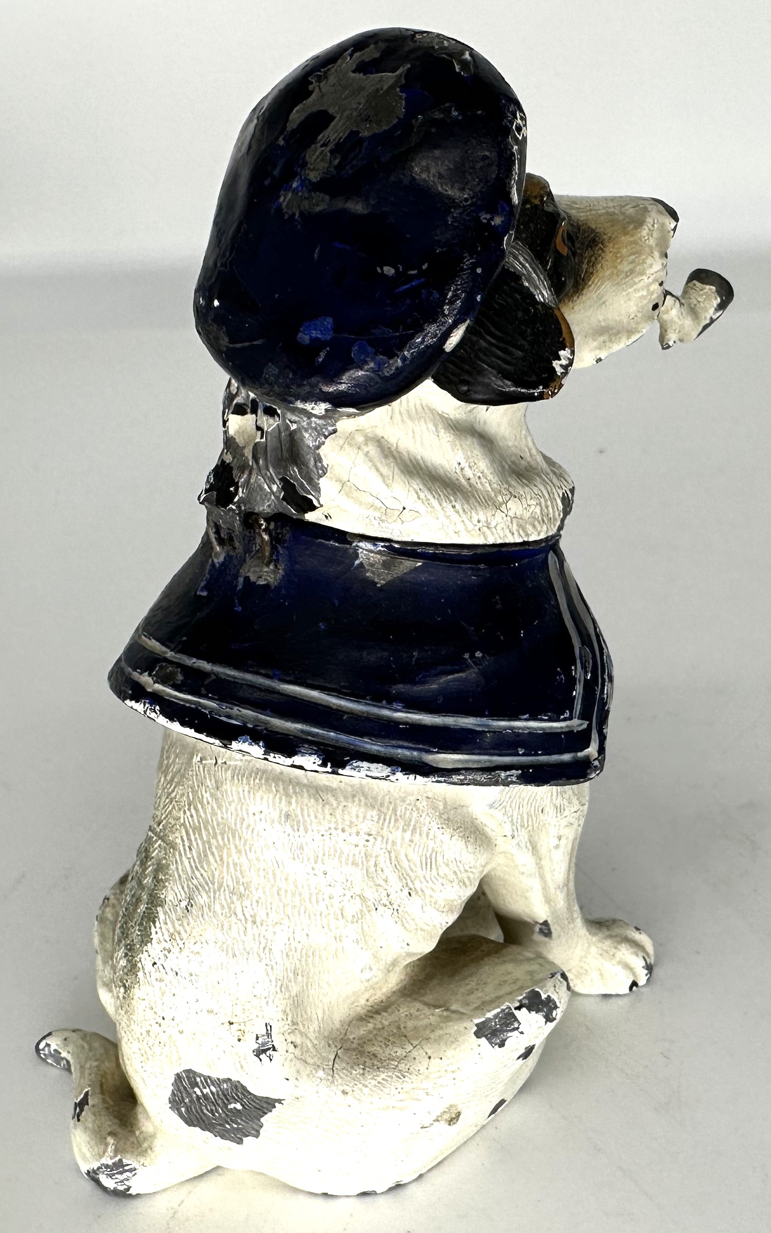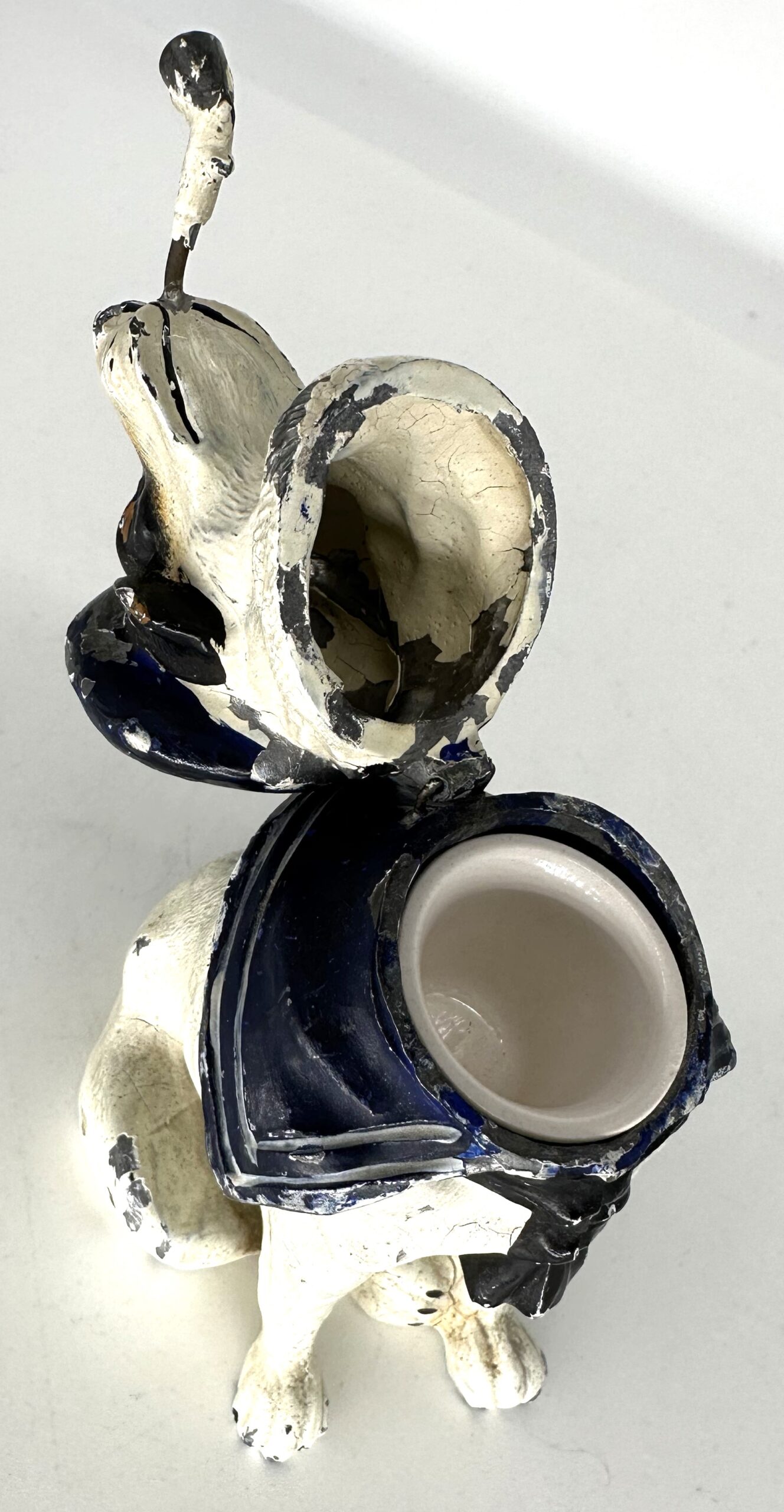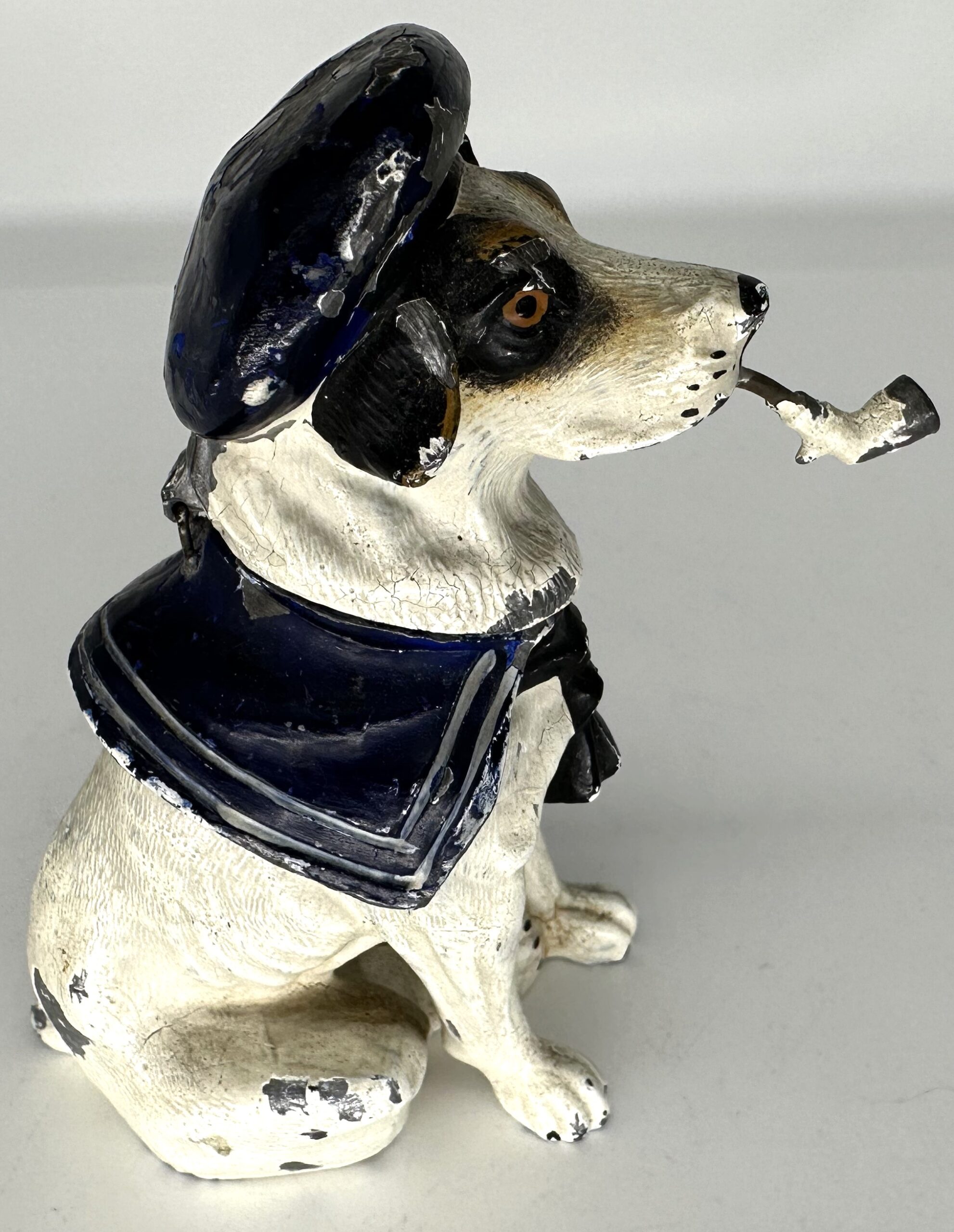 Inkwell in the form of a terrier dog wearing a sailor hat and collar, and is smoking a pipe. Lots of details in the casting and painting. His head tips back to reveal an ink reservoir.