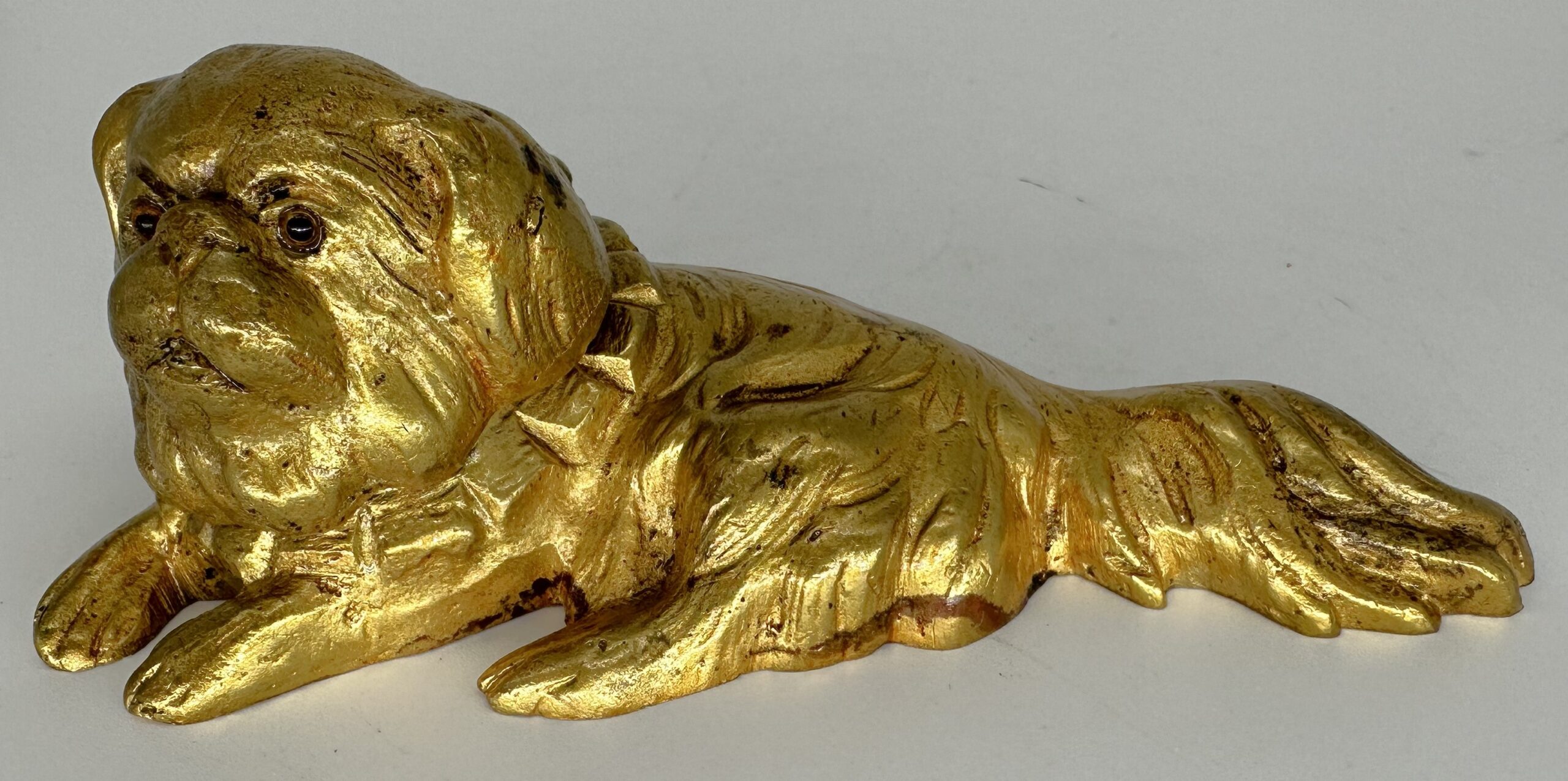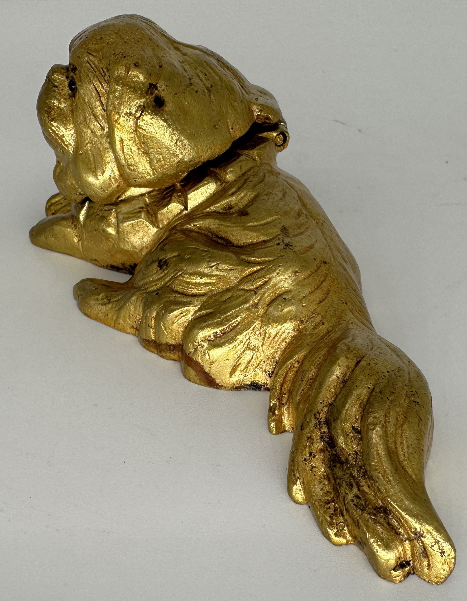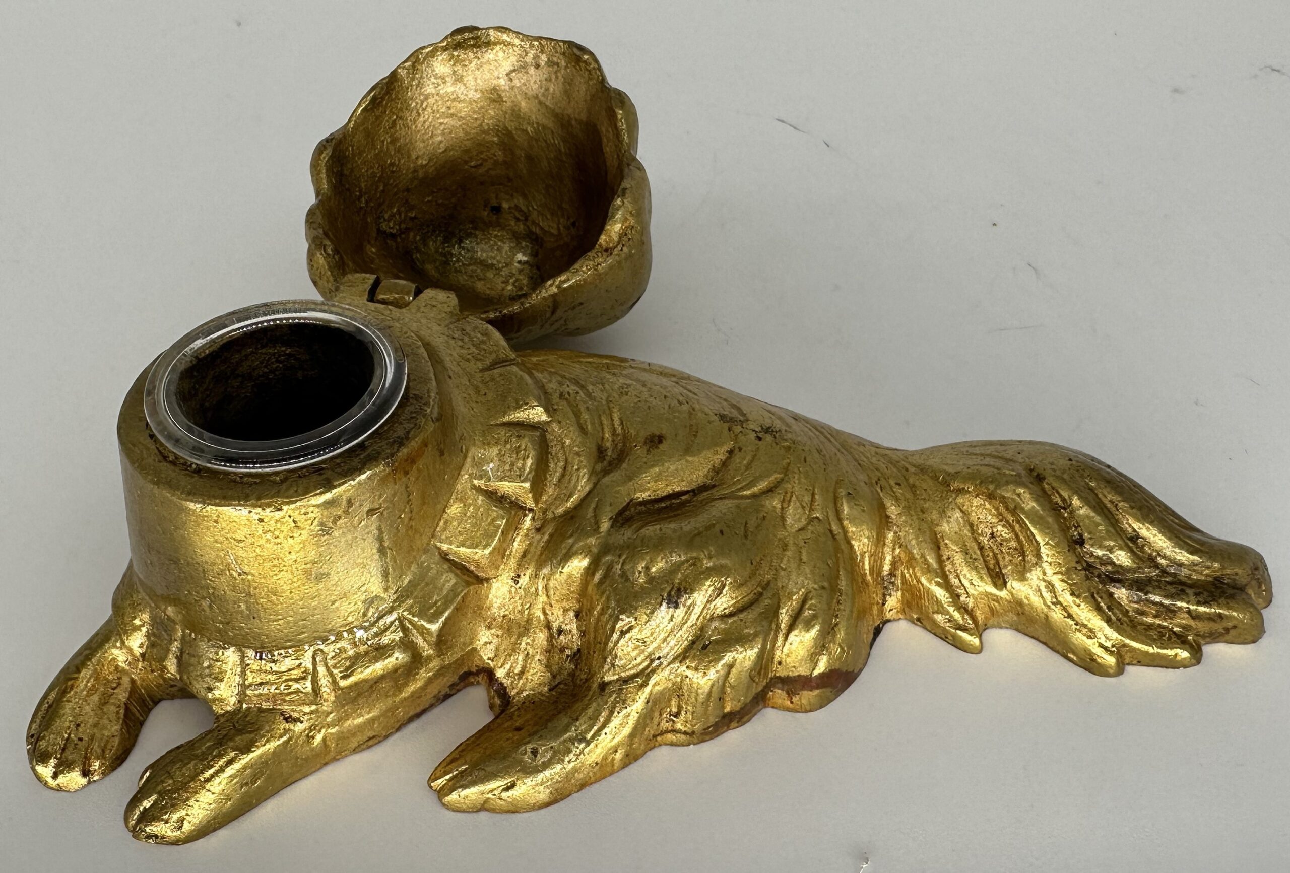 Nicely cast solid brass inkwell in the form of a recumbent Pekingese or King Charles Spaniel. He has an expressive face with glass eyes.